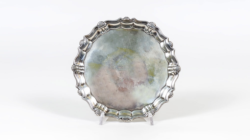 SALVER IN ARGENTO Londra, John Robinson, 1746 bordo lobato e sbalzato con conchiglie, su tre piedini mossi gr 245, diam cm 17 SILVER SALVER, LONDON, JOHN ROBINSON, 1746