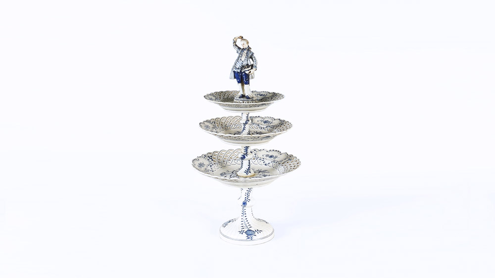 FRUTTIERA IN PORCELLANA Meissen, inizio del XX secolo tre alzate con bordo traforato, dipinta in monocromia blu con motivo del fiore di cipolla, sormontata da figura maschile in abiti settecenteschi h cm 21 Marcata con simbolo grafico in sottosmalto blu PORCELAIN FRUIT BOWL, MEISSEN, EARLY 20TH CENTURY