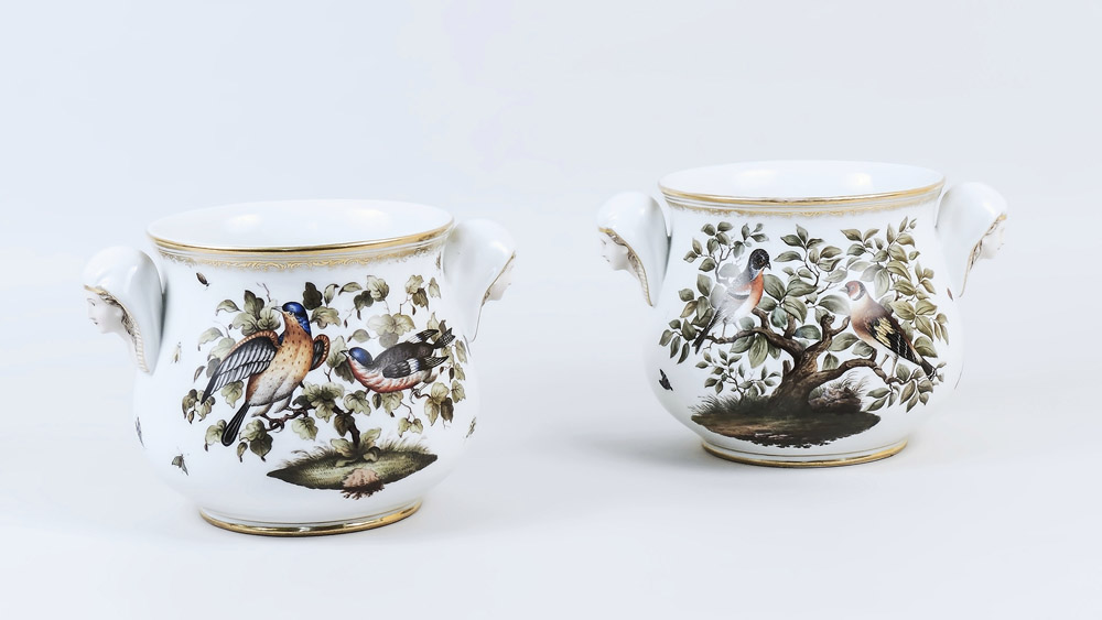 COPPIA DI PORTAVASI IN PORCELLANA Meissen, inizio del XX secolo di forma bombata, ciascuno interamente dipinto con varie tipologie di uccelli ed insetti tra racemi, prese realizzate come testine di gusto "Retour d'Egipte" h cm 17 Marcate con simbolo grafico in sottosmalto blu PAIR OF PORCELAIN CACHEPOTS, MEISSEN, EARLY 20TH CENTURY