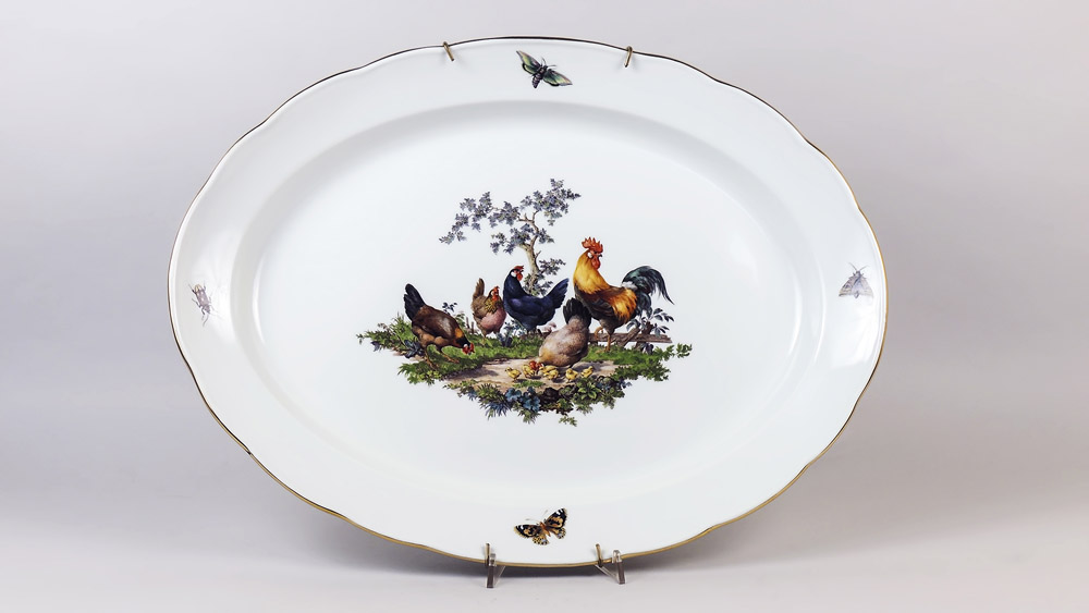 GRANDE VASSOIO OVALE IN PORCELLANA Meissen, fine del XIX/inizio del XX secolo bordo leggermente mosso e lumeggiato in oro, dipinto con galli, galline e pulcini in un paesaggio, farfalle ed insetti cm 60x44 Marcato simbolo grafico in sottosmalto blu LARGE OVAL PORCELAIN TRAY, MEISSEN, LATE 19TH/EARLY 20TH CENTURY