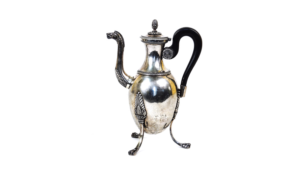 CAFFETTIERA IN ARGENTO Parigi, 1819-1838 manico in legno ebanizzato, coperchio con presa a ghianda, beccuccio a foggia di testa di cavallo, corpo ad ogiva su tre gambe mosse, piedi a zampa ferina gr 480, h cm 23 SILVER COFFEEPOT, PARIS, 1819-1838