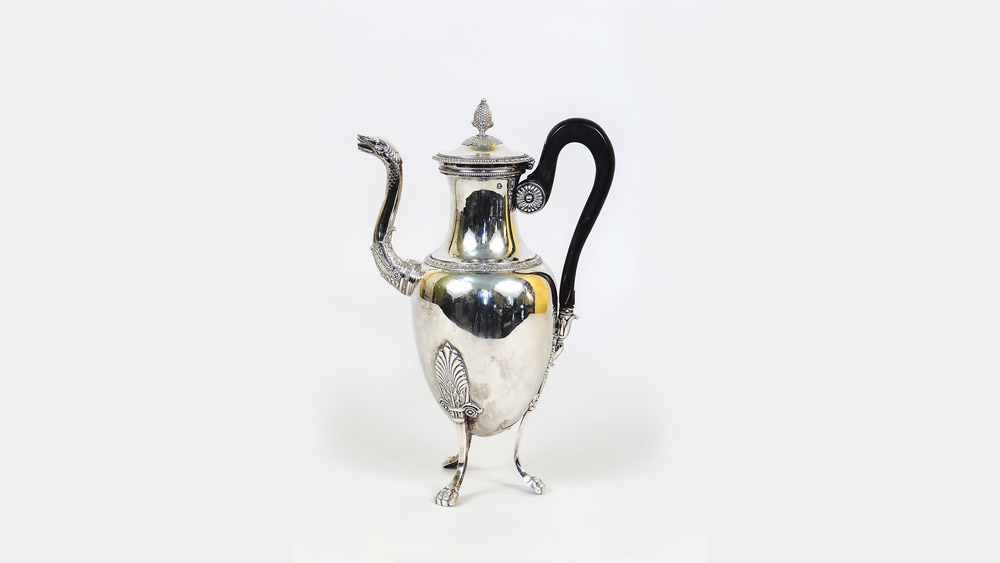 CAFFETTIERA IN ARGENTO Parigi, 1819-1838 manico in legno ebanizzato, coperchio con presa a ghianda, beccuccio a testa di cigno, corpo ad ogiva, su tre gambe mosse, piedi a zampa ferina, lievi difetti gr 525, h cm 27 SILVER COFFEEPOT, PARIS, 1819-1838