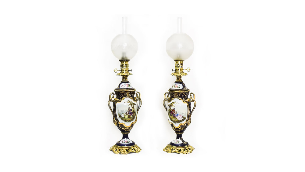 COPPIA DI LUMI AD OLIO IN PORCELLANA Francia, metà del XIX secolo realizzati come vasi biansati, rilegati in metallo dorato e dipinti con scene galanti e fiori entro riserve su fondo blu, lumeggiature in oro, bobeche in vetro h cm 62 PAIR OF PAINTED PORCELAIN AND GILDED METAL OIL LAMPS, FRANCE, MID 19TH CENTURY