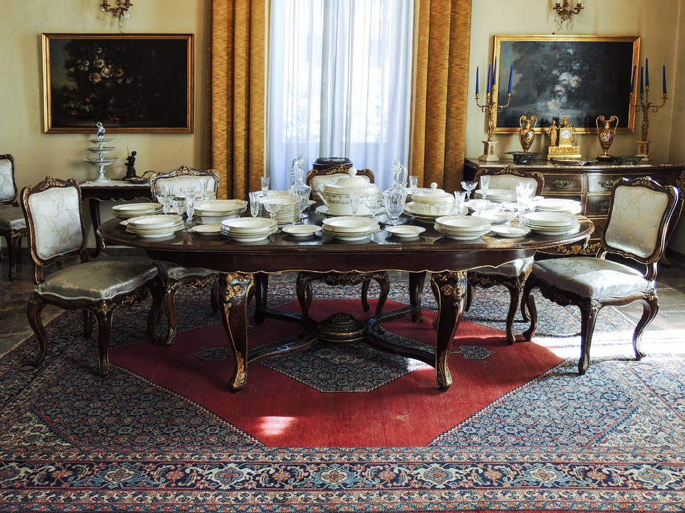 TAVOLO OVALE DA PRANZO inizio del XX secolo intagliato con motivi floreali lumeggiati in oro, gambe mosse riunite da traverse sagomate, allungabile, corredato da due prolunghe cm 77x203x124,5, ciascuna prolunga lungh cm 43 OVAL DINING TABLE, EARLY 20TH CENTURY