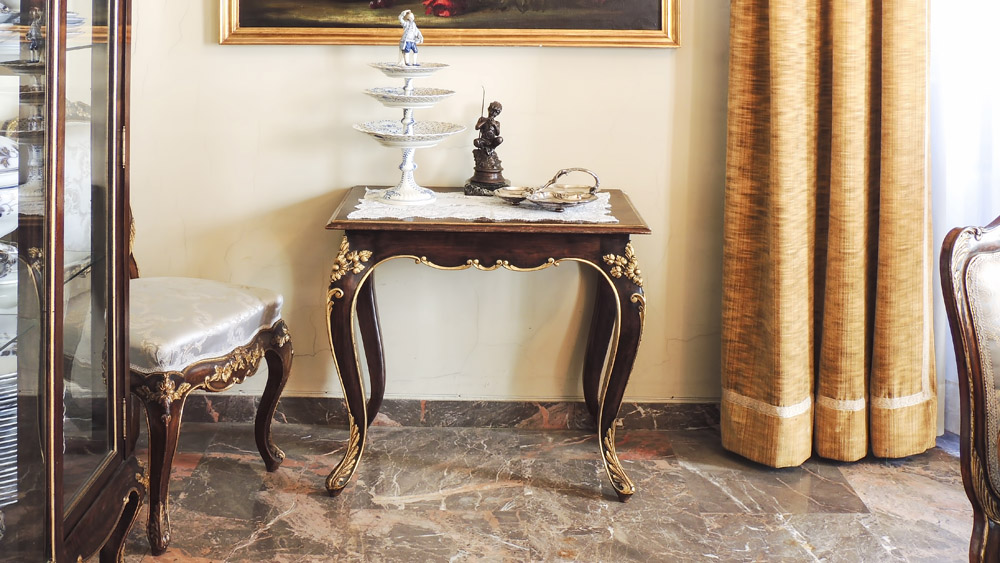 TAVOLINO DA APPOGGIO IN NOCE inizio del XX secolo intagliato con motivi floreali lumeggiati in oro, gambe mosse, en pendant con i lotti precedenti h cm 72x75,5x49 WALNUT TABLE, EARLY 20TH CENTURY
