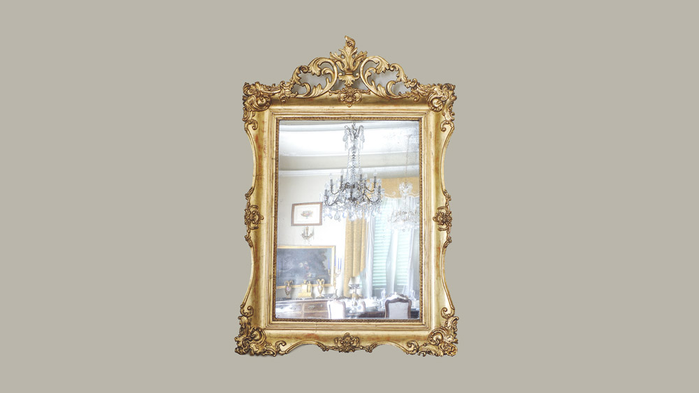 GRANDE SPECCHIERA IN LEGNO INTAGLIATO E DORATO metà del XIX secolo di forma sagomata, cimasa intagliata con volute contrapposte e foglie d'acanto cm 175x120 LARGE GILTWOOD MIRROR, MID 19TH CENTURY