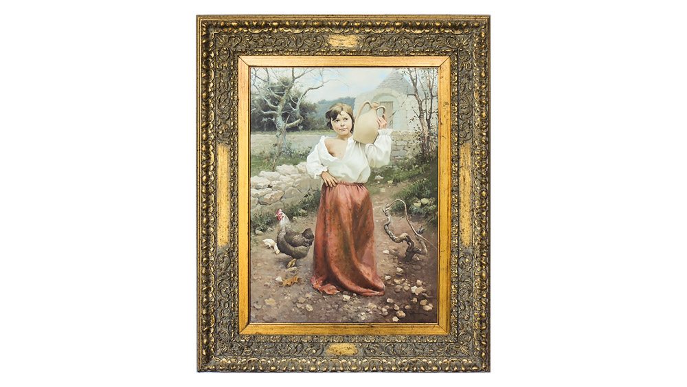 FEDERICO ALFANO (1933-1986) Giovane contadina con brocca olio su tela, firmato, in cornice cm 70x50 Al verso reca timbro Atelier Alfano YOUNG COUNTRY WOMAN, OIL ON CANVAS, WITH STAMP ON REVERSE