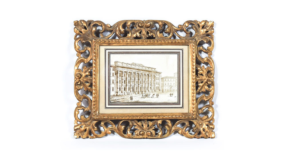 VEDUTA DEL TEMPIO DI ADRIANO IN ROMA prima metà del XIX secolo tecnica china e acquerello su carta, in cornice intagliata e dorata cm 12,4x17,7 VIEW OF TEMPIO ADRIANO IN ROME, FIRST HALF OF 19TH CENTURY, INDIAN INK AND WATERCOLOUR ON PAPER