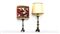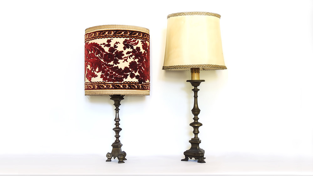 DUE TORCIERE IN BRONZO fusti torniti, su base a tripode, corredate da paralumi h cm 34, h cm 38 TWO BRONZE PRICKETS