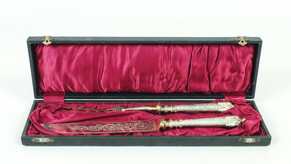 COPPIA DI POSATE DA PORTATA IN SHEFFIELD Inghilterra inizio del XX secolo manici sbalzati e lame incise, in parte dorate, entro astuccio originale PAIR OF SHEFFIELD CARVING SET, ENGLAND, EARLY 20TH CENTURY