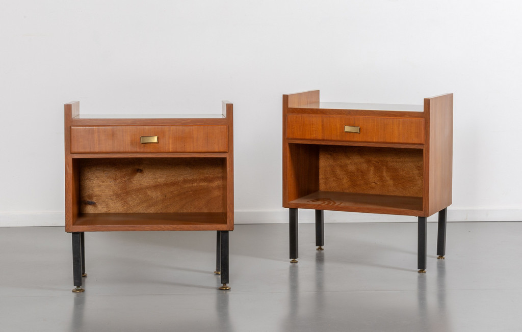 Legno di teak piani in vetro con carta colorata retro applicata acciaio verniciato ottone.