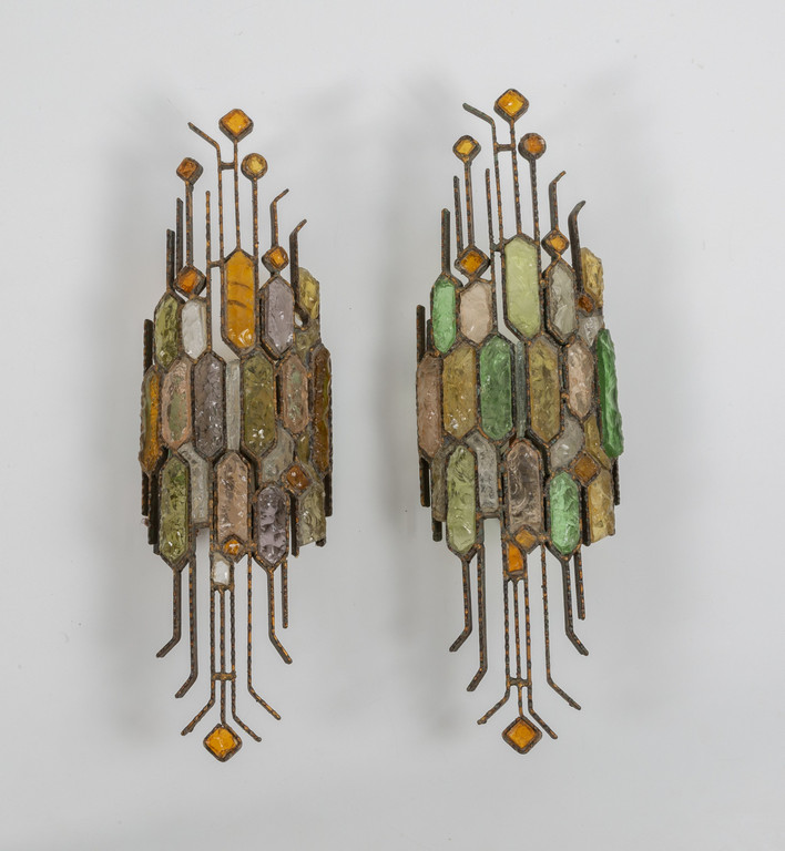 Ferro smaltato vetri colorati scalpellati.