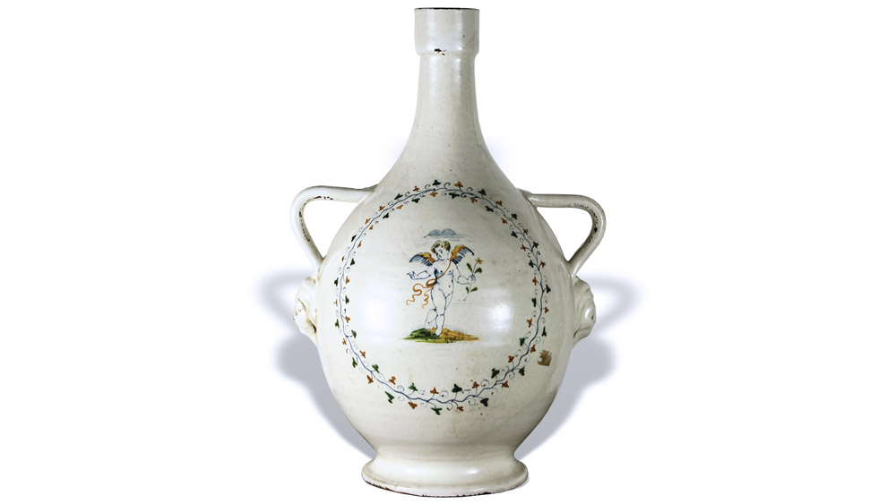 FIASCA BIANSATA IN TERRACOTTA SMALTATA inizio del XX secolo corpo globulare dipinto con puttino entro ghirlanda vegetale nei toni del giallo e del verde, anse laterali con mascheroni h cm 47 TERRACOTTA TWO-HANDLED FLASK, EARLY 20TH CENTURY
