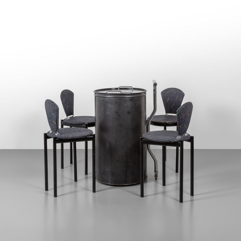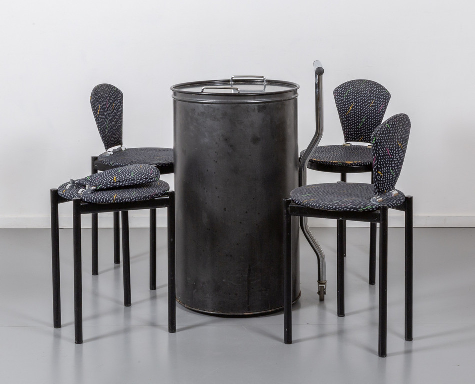 UN TAVOLO CONTENITORE E QUATTRO SEDIE anni '80.