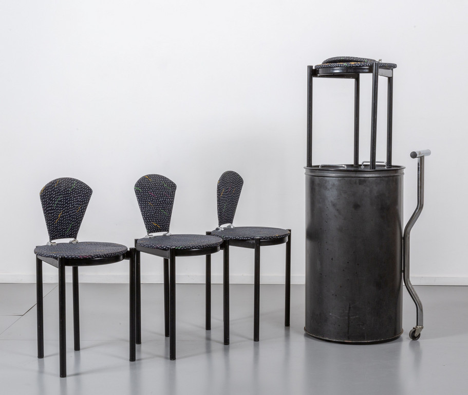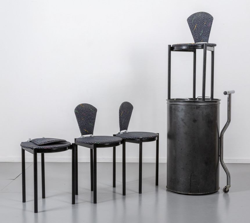 Sedie: acciaio verniciato sedute e schienali rivestiti in tessuto.