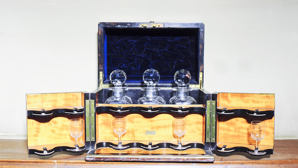 SERVITO DA ROSOLIO IN CRISTALLO composto da quattro bicchieri e tre bottiglie, entro scatola in radica CRYSTAL LIQUEUR SET