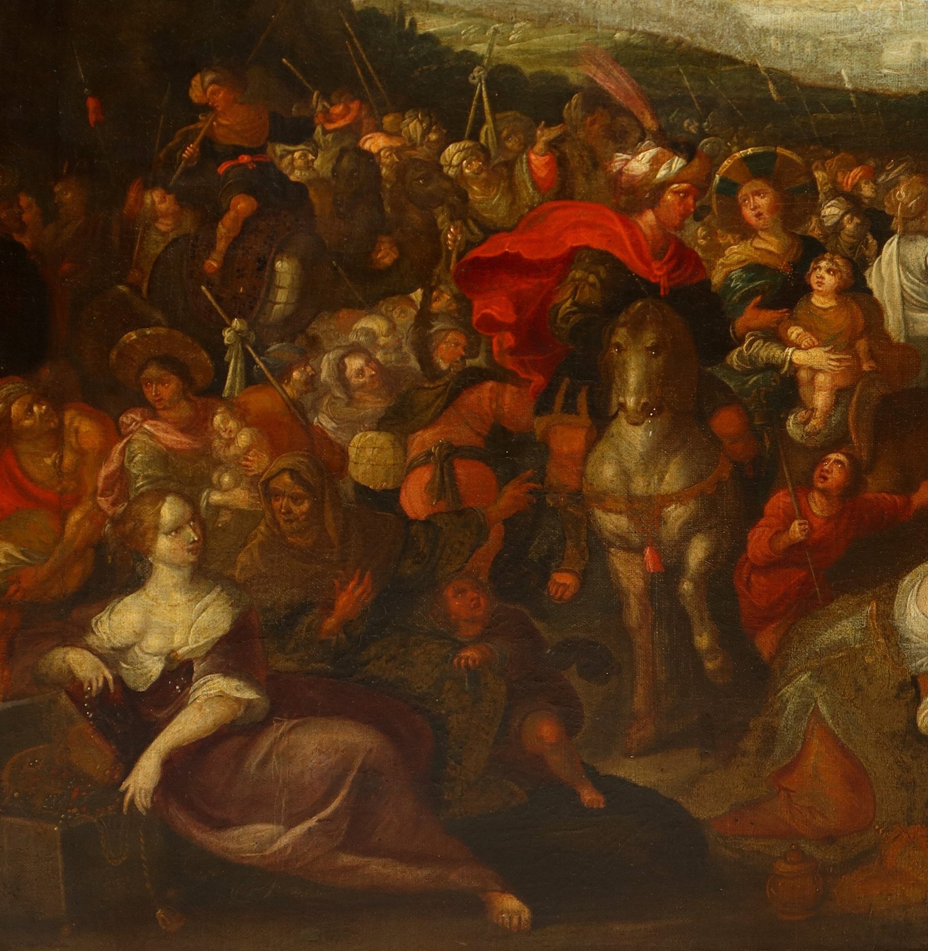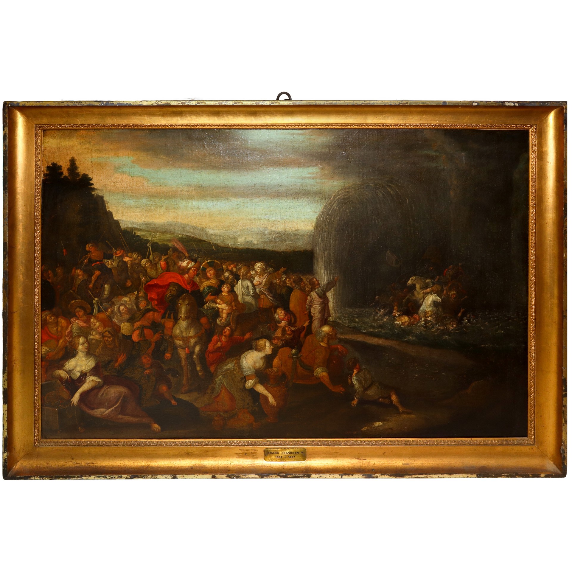 Frans Francken III (attribuito a) (Anversa 1607 - 1667) - La traversata del Mar Rosso, 17° secolo h cm 77,5X112,5 in cornice h cm 90X125 La Traversata del Mar Rosso è un tema biblico che nel corso della storia dell’arte è stato più volte rappresentato da importanti pittori. In Italia, ad esempio, lo troviamo nella Loggia di Raffaello, nel registro mediano del ciclo di affreschi della Sistina, così come nella Cappella di Eleonora affrescata dal Bronzino all’interno di Palazzo Vecchio. Oltralpe invece, in particolare ad Anversa, fu più volte affrontato dalla rinomata dinastia di pittori Francken. Questa famiglia di pittori fiamminghi fu operosa per oltre un secolo, lavorando alacremente tra la metà del XVI sec. e la fine del successivo, contando tra le sue fila pittori come Frans Francken I, Frans Francken II e Hieronymus II, così come Ambrosius e Thomas Francken, o, per l’ultima generazione, i fratelli Hieronymus Francken III e Frans Francken III. Proprio a quest’ultimo andrebbe attribuito il nostro dipinto; se infatti lo schema iconografico fu già più volte adoperato dalla generazione precedente, lo stile ben più netto e calligrafico ne orientano l’autografia proprio verso quest’ultimo esponente della, a quest’altezza cronologica (metà del XVII sec.), quasi secolare bottega.