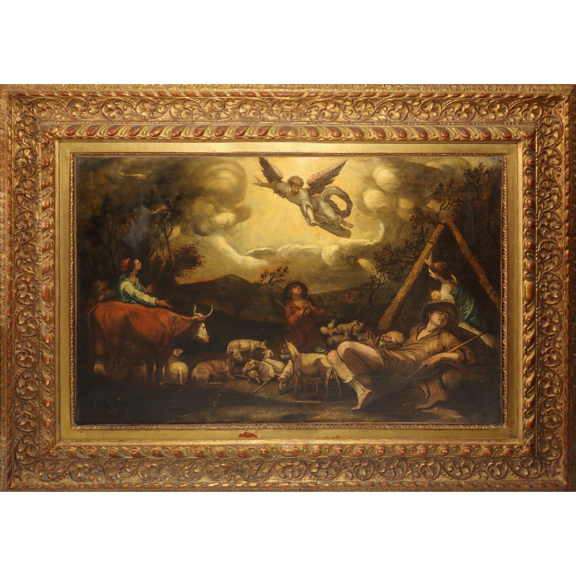 Annunciazione ai pastori la nascita di Gesù, Emilian School 17° secolo cm 25,5X97 in cornice cm 103X133 olio su tela