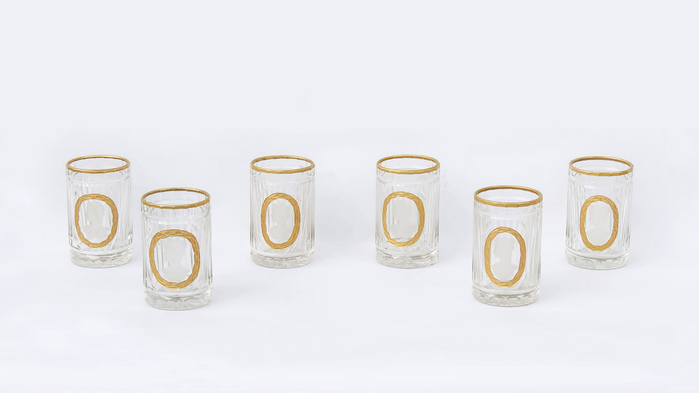 SERIE DI SEI BICCHIERI IN CRISTALLO molati e dorati con motivo di ghirlande...