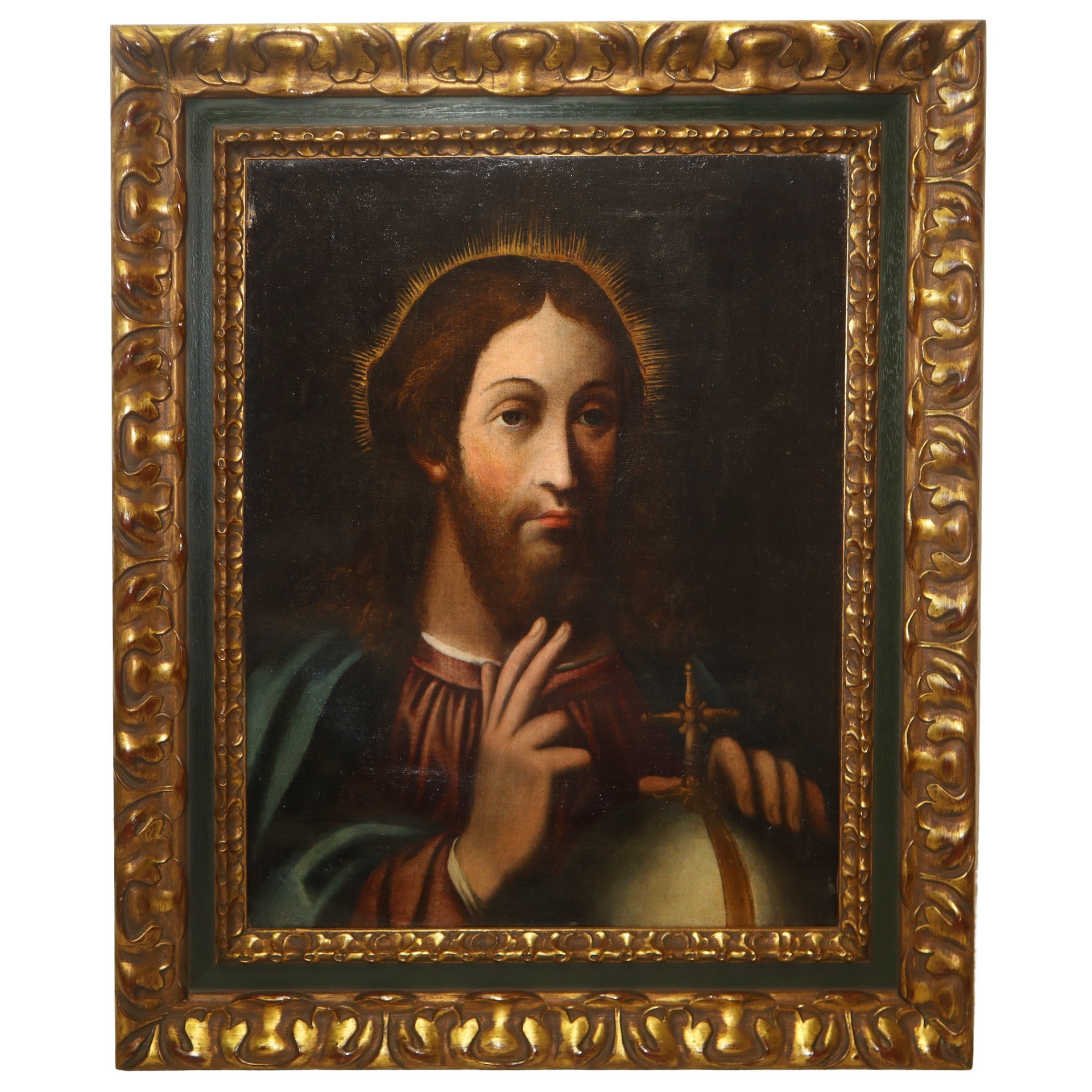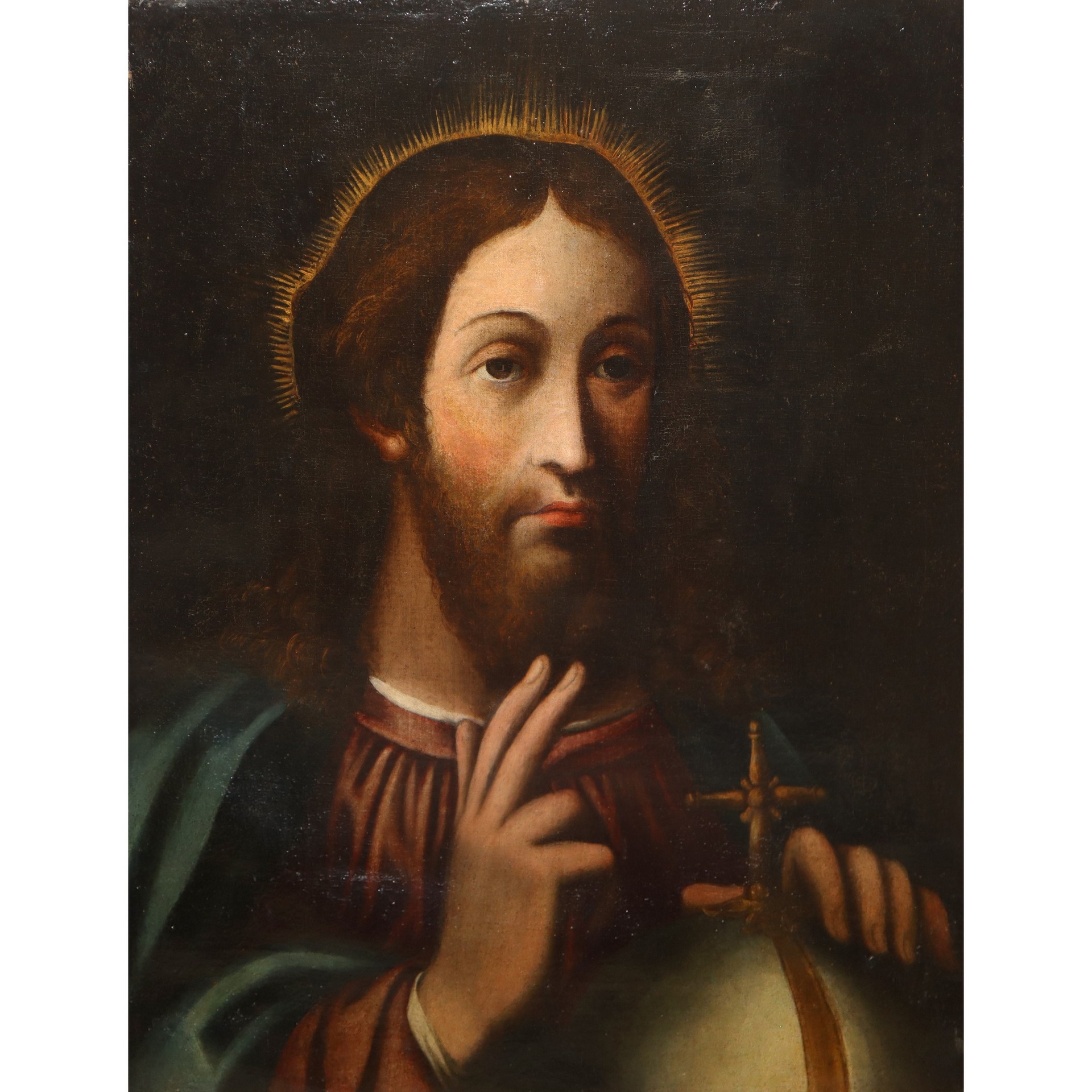 Salvator Mundi, 17° secolo h cm 63X49 in cornice h cm 83,5X70 olio su tela