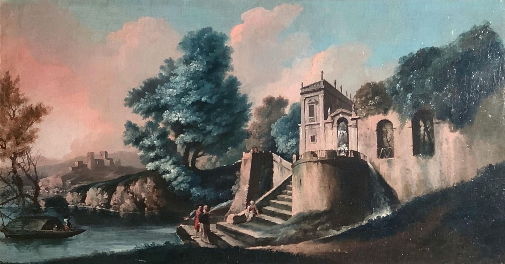 Andrea Locatelli (attribuito a) (Roma 19.02.1695 - Roma 19.02.1741) - Veduta del Tevere a carattere archeologico con personaggi, 18° secolo