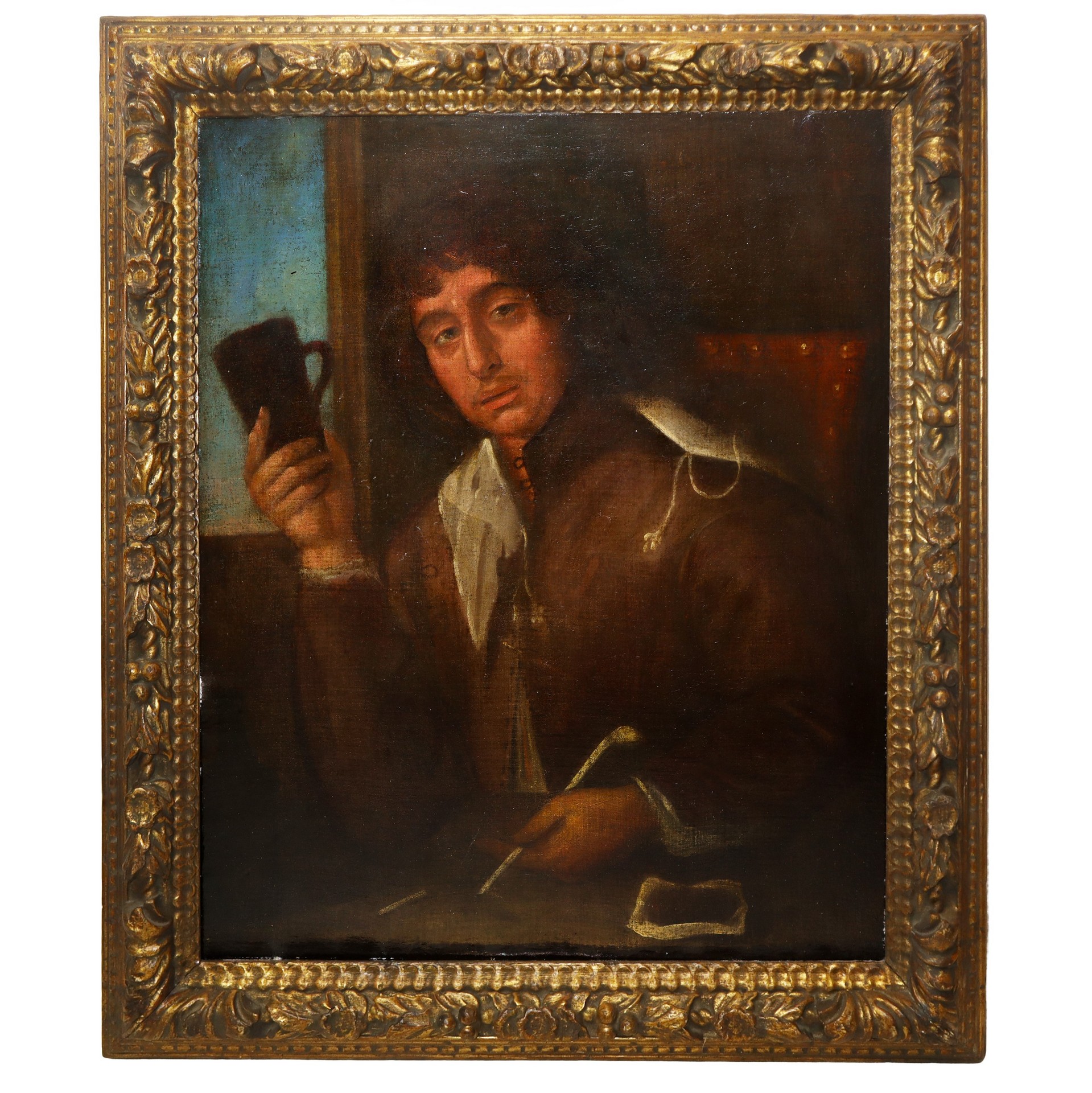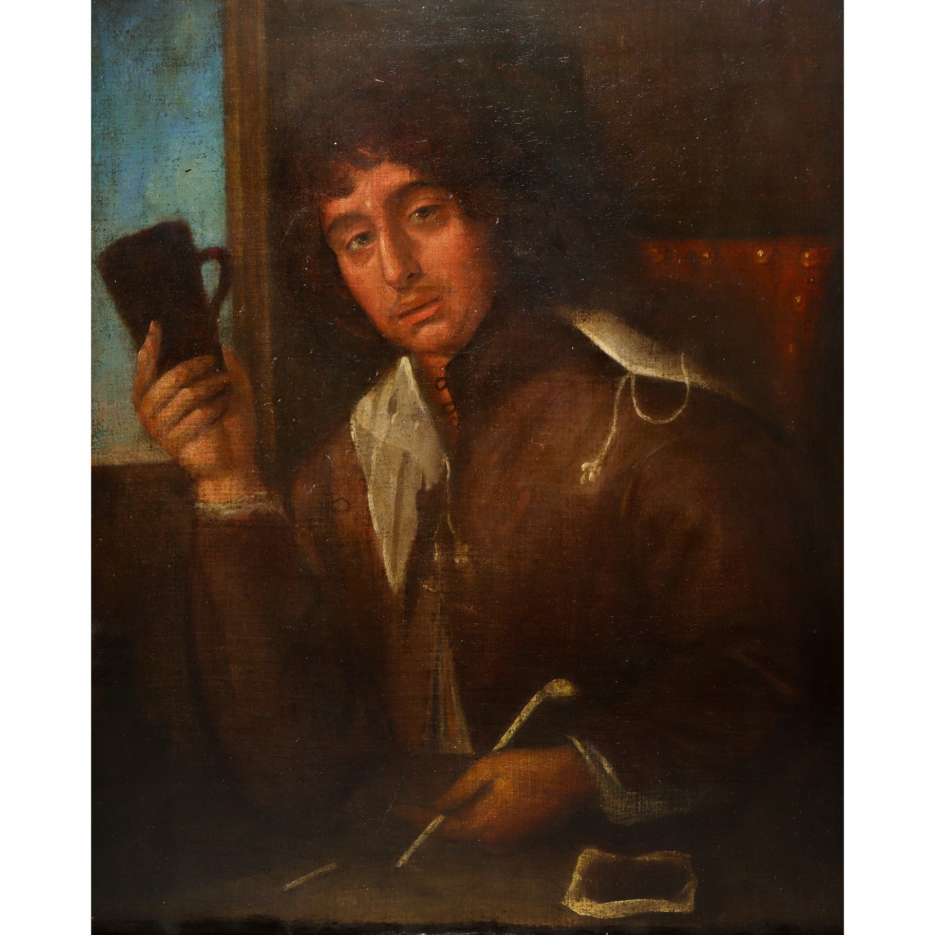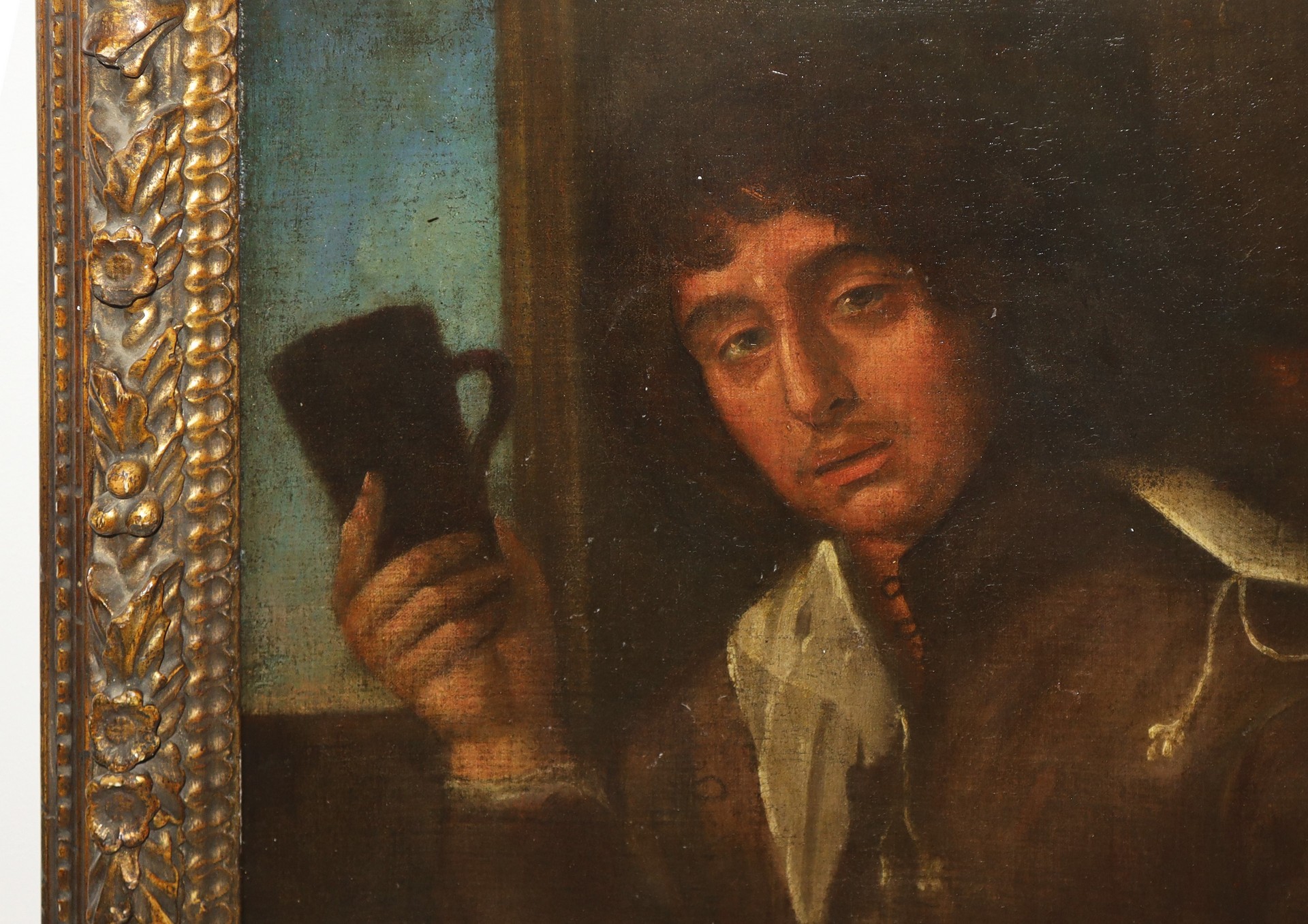 Uomo con boccale, fine 17° secolo h cm 79X64,4 in cornice h cm 95X81