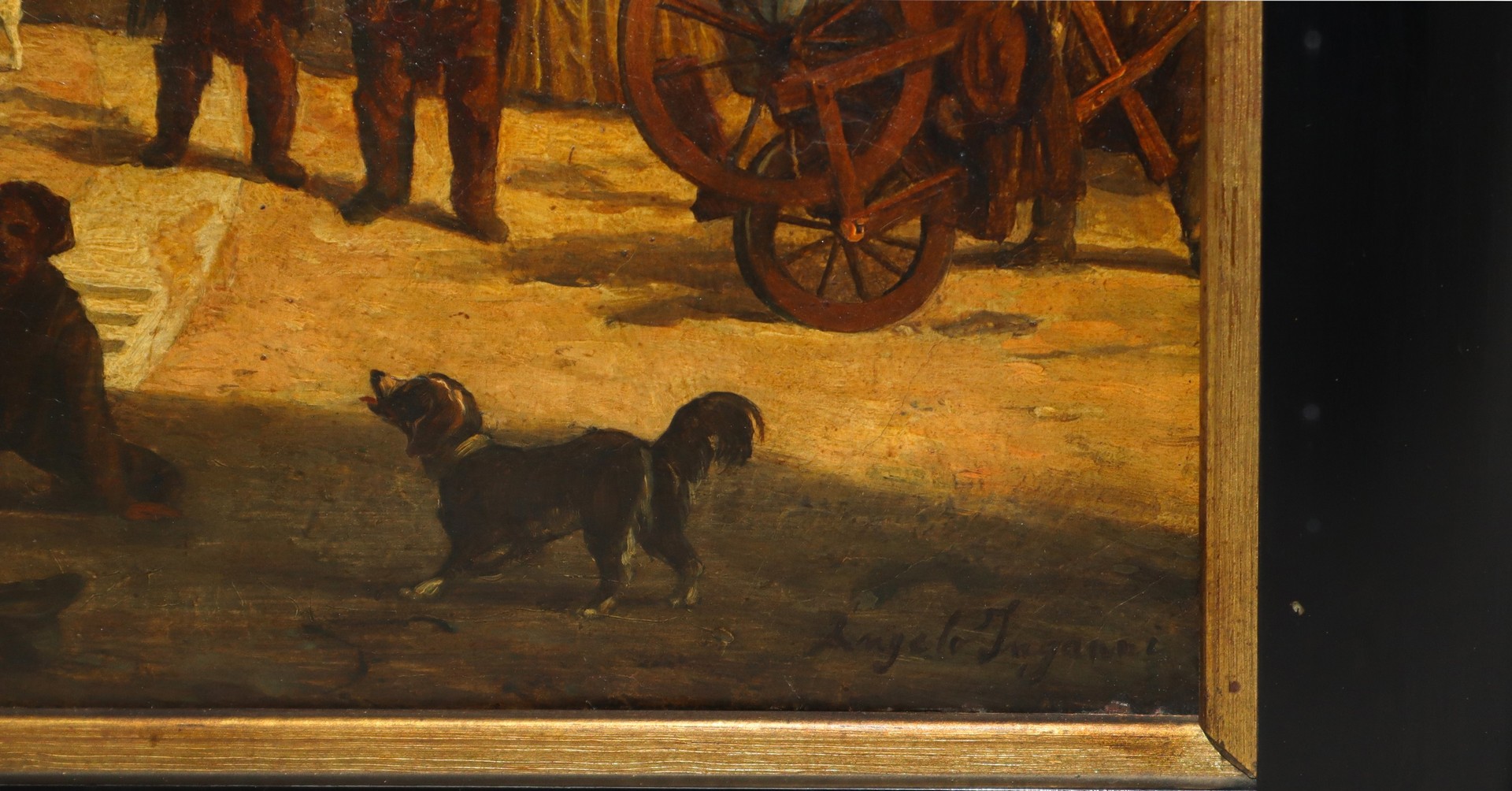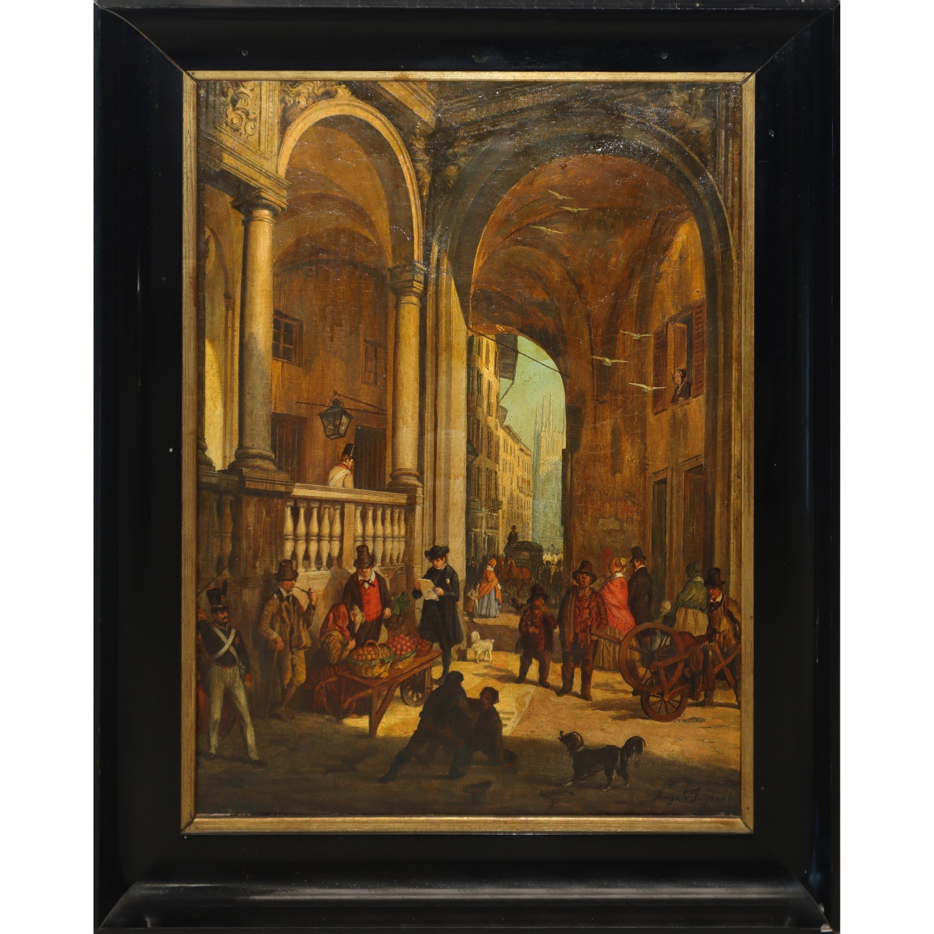 Angelo Inganni (Brescia 1807 - Gussago 1880) - Veduta della Piazza dei Mercanti o Il passaggio dalla Piazza dei Mercanti alla Pescheria Vecchia H cm 46.5x36 - in cornice H cm 57x45 Olio su tela