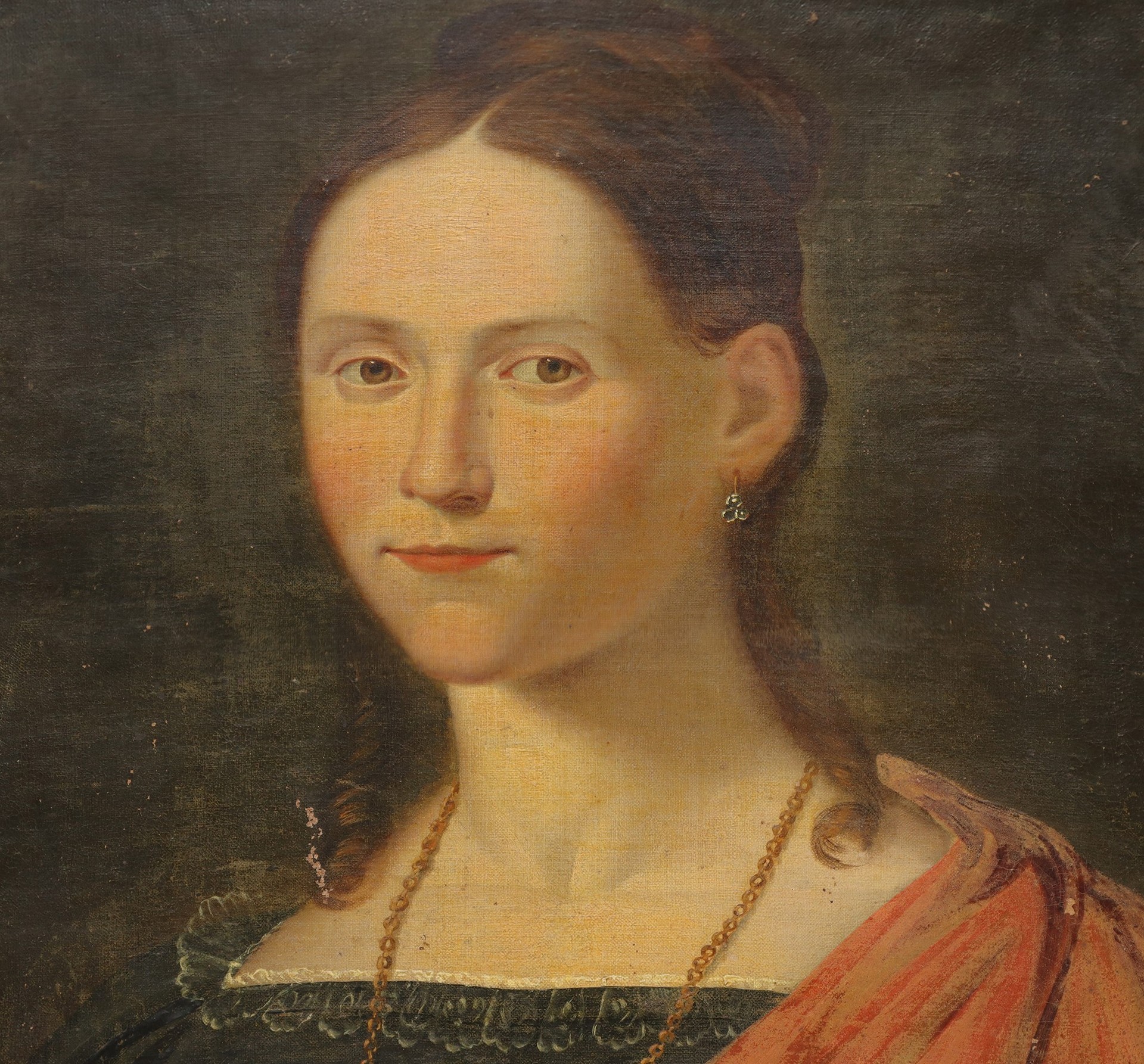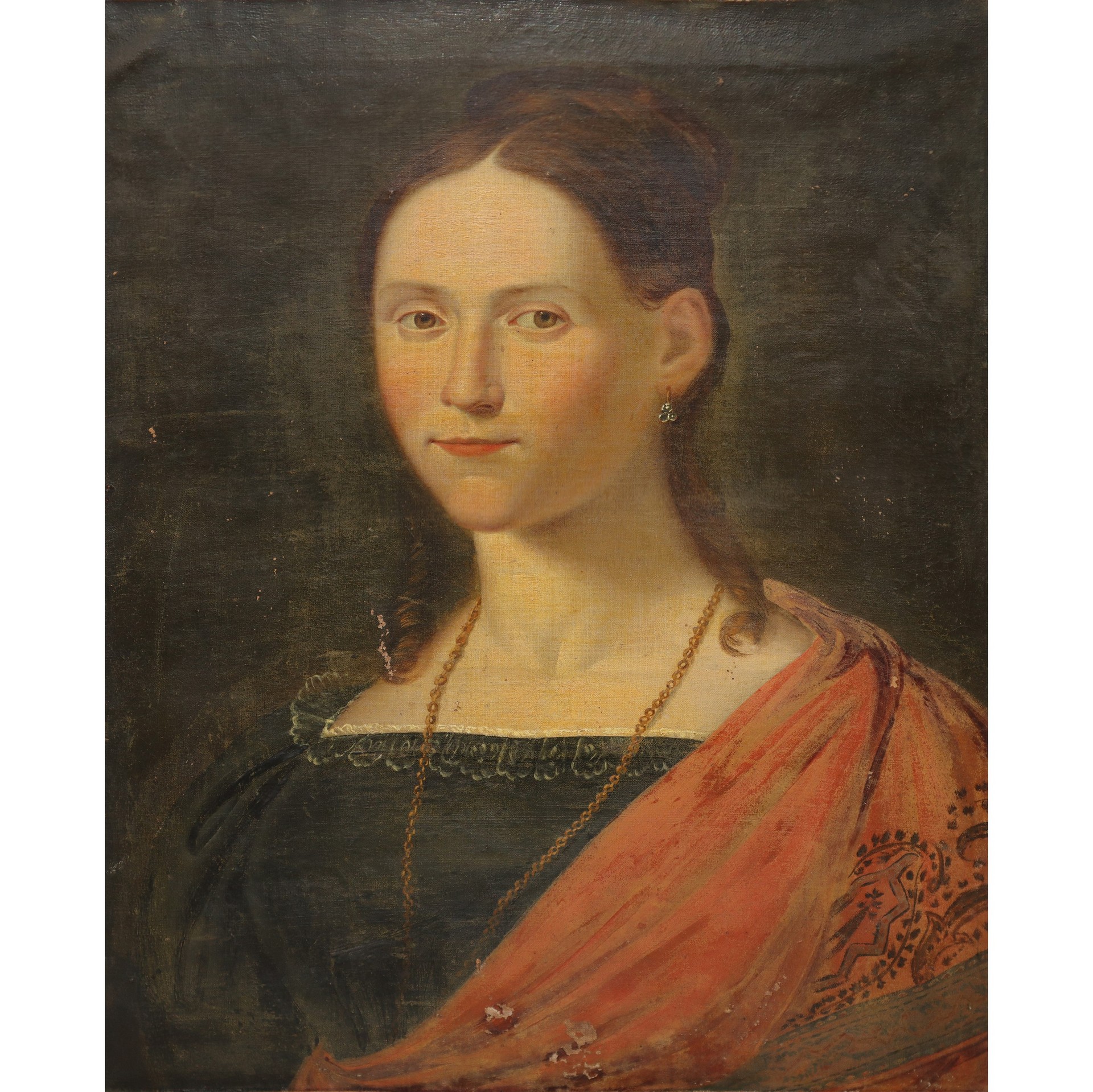 Ritratto di donna in cornice a mezzacanna dorata coeva, 19° secolo cm 54X43 in cornice 67X55 Olio su tela