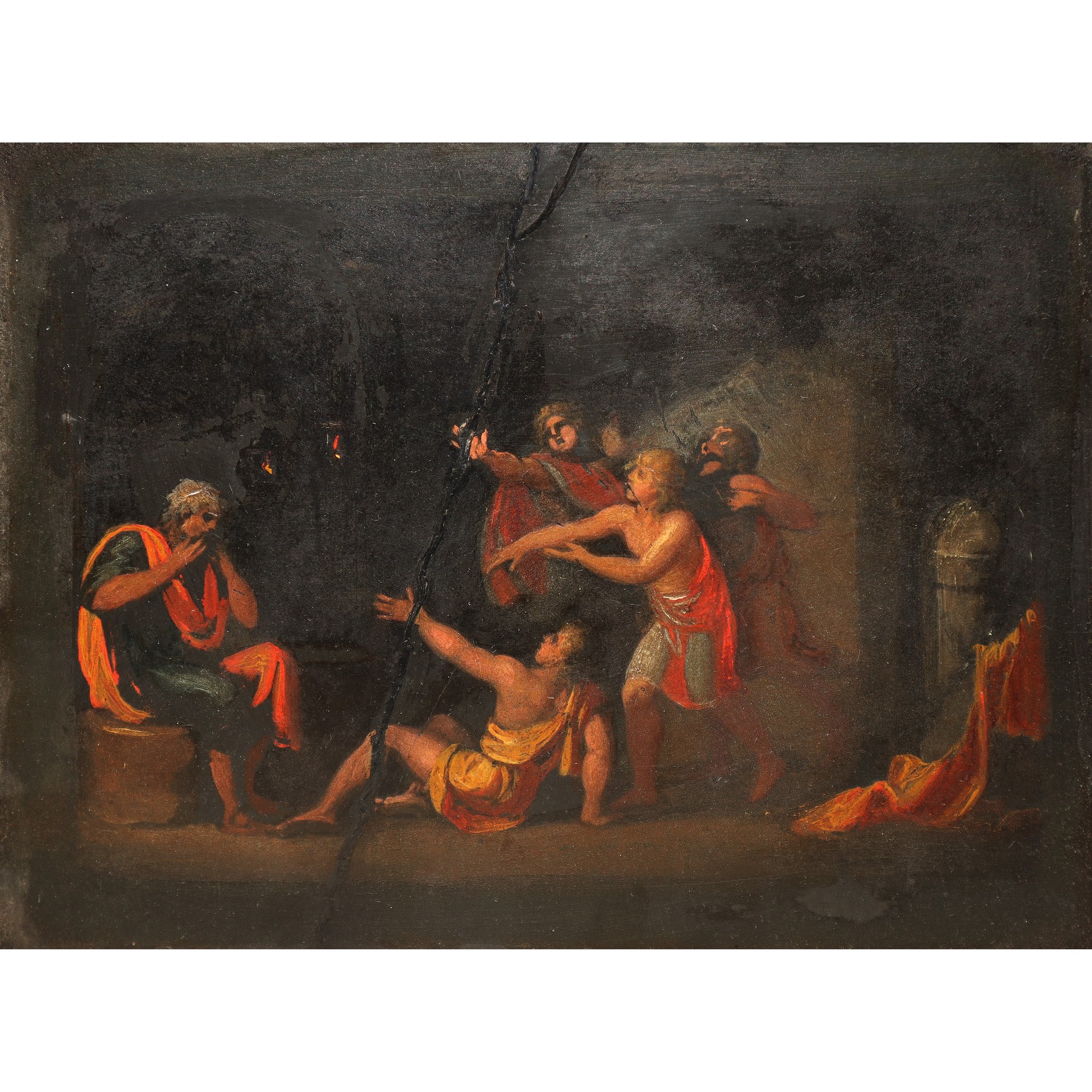 La morte di Socrate , primi 18° secolo h cm 21,5X27,5 in cornice h cm 30,5X36 olio su ardesia