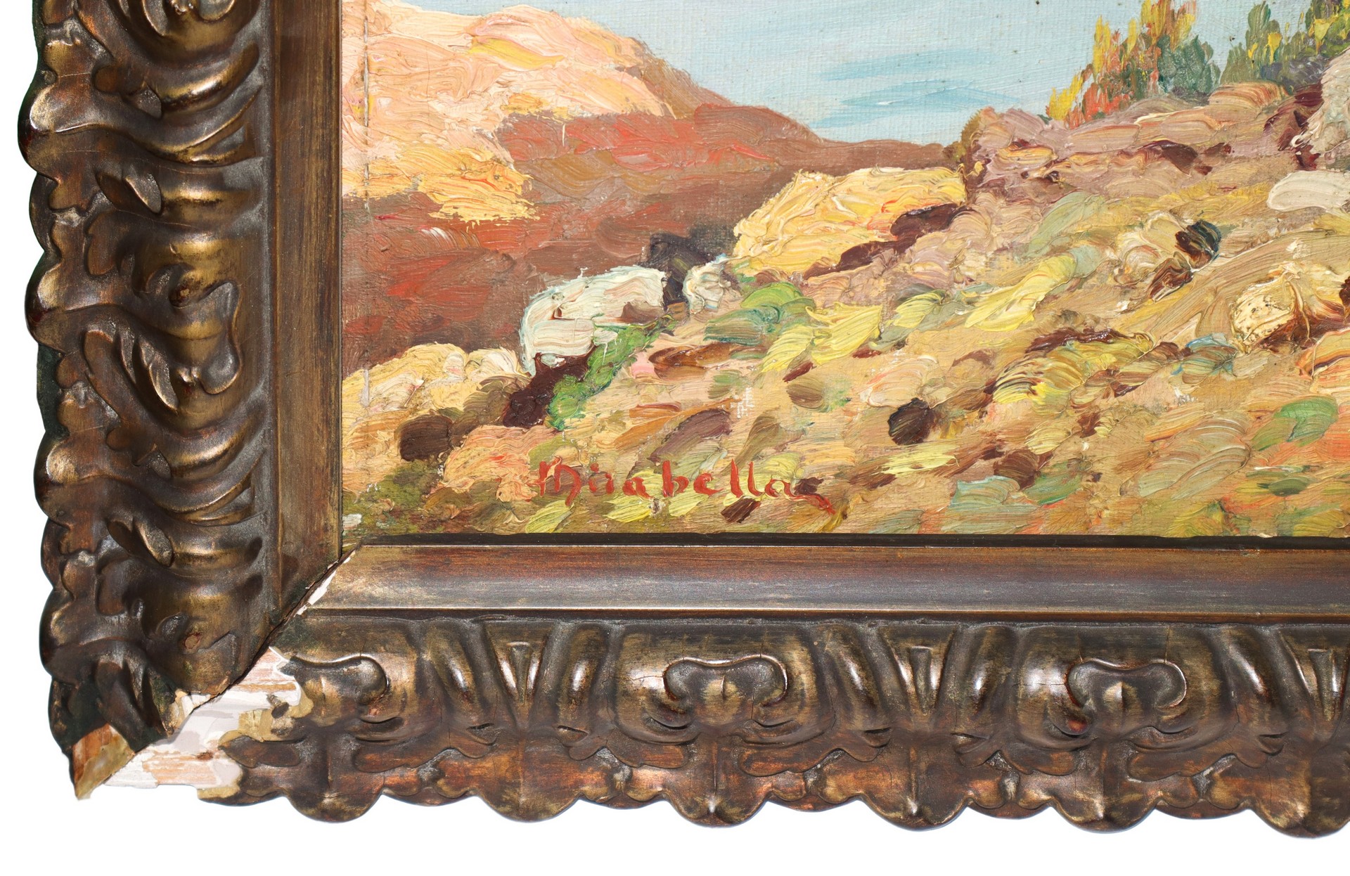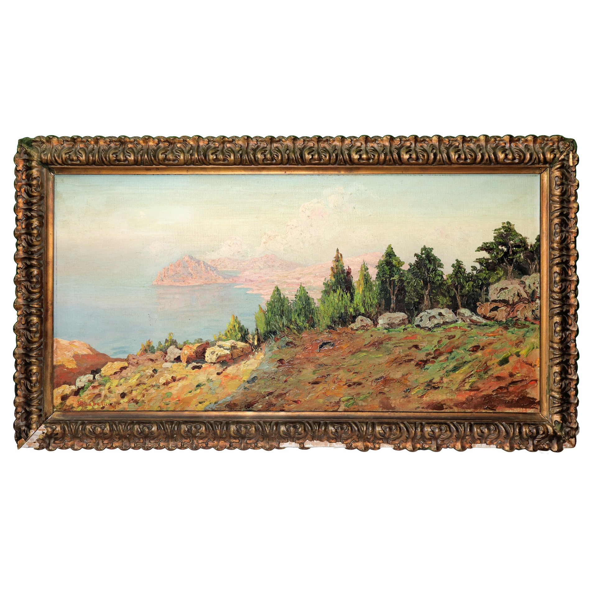 Mario Mirabella (1870 - 1931) - Monte Cofano, Trapani, fine 19° - primi 20° secolo. cm 40x80 in cornice cm 90x50 Olio su tela
