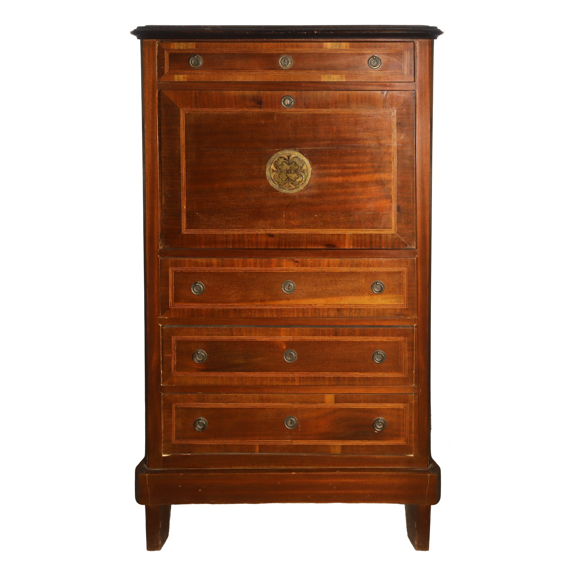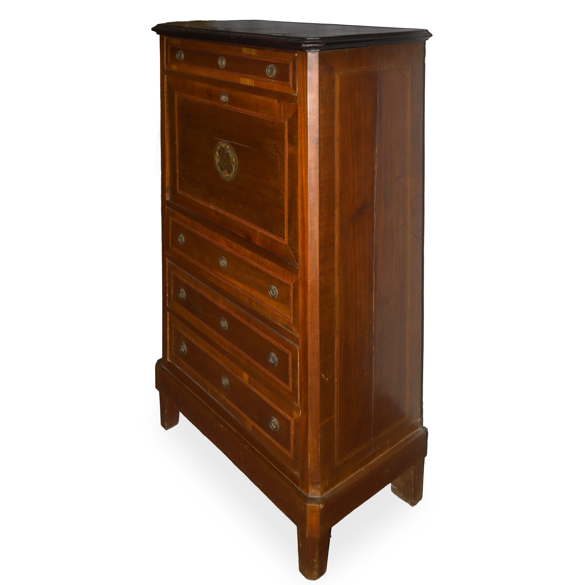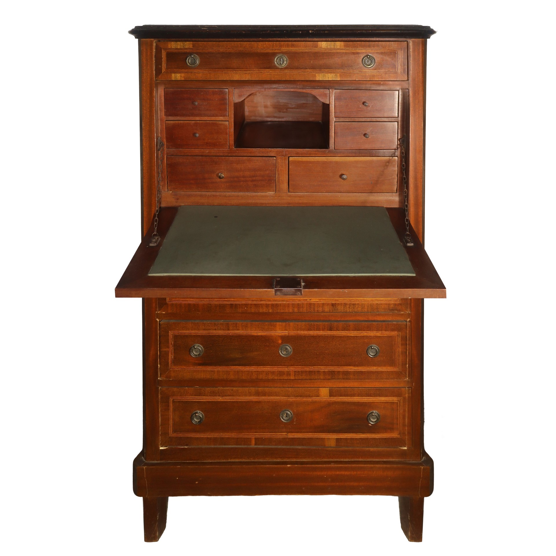 Secretaire con cassetto in testa, abattande centrale a copertura di cassettiera interna e tre cassetti bassi. Intarsi e filettature sul fronte , 19° secolo