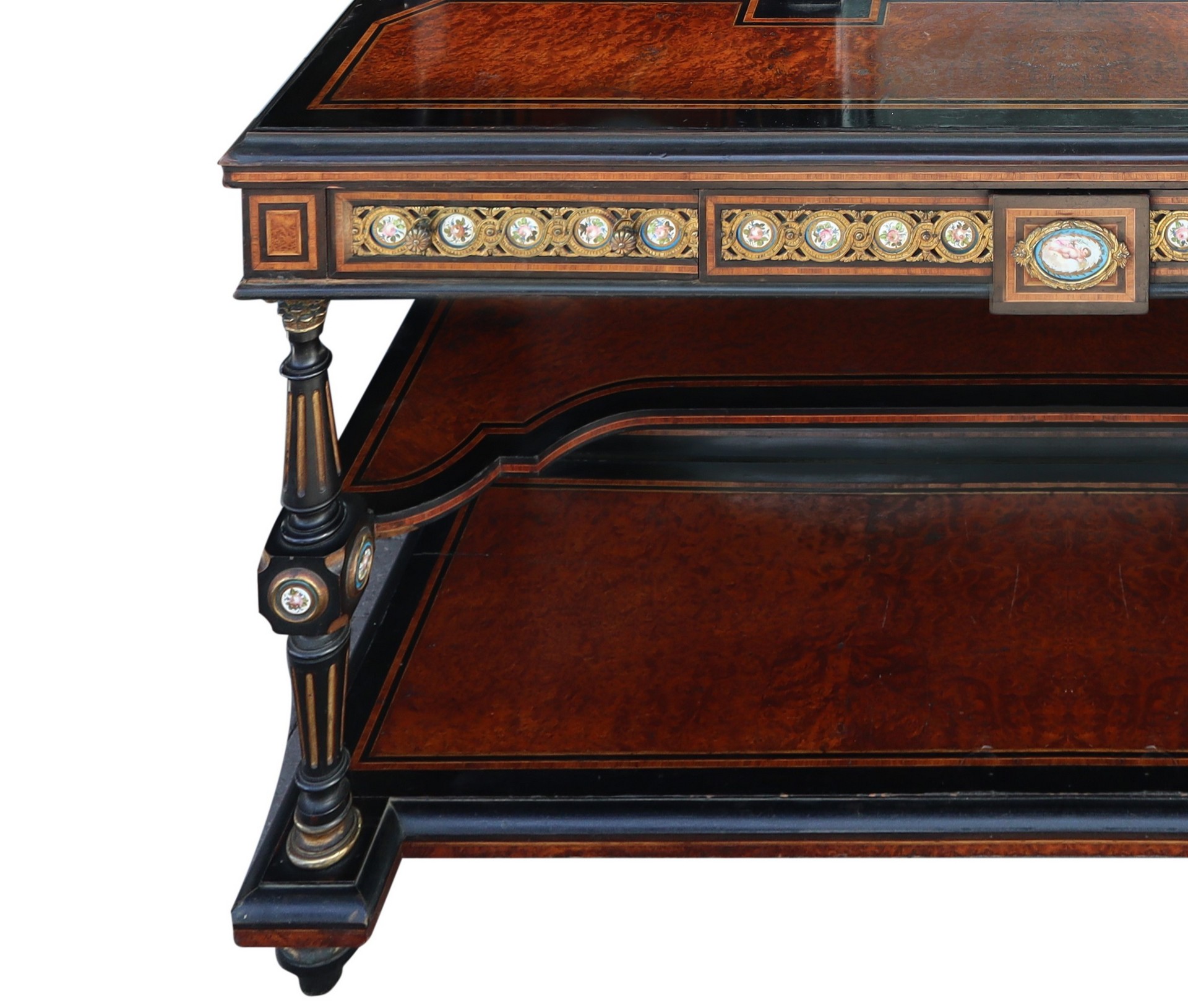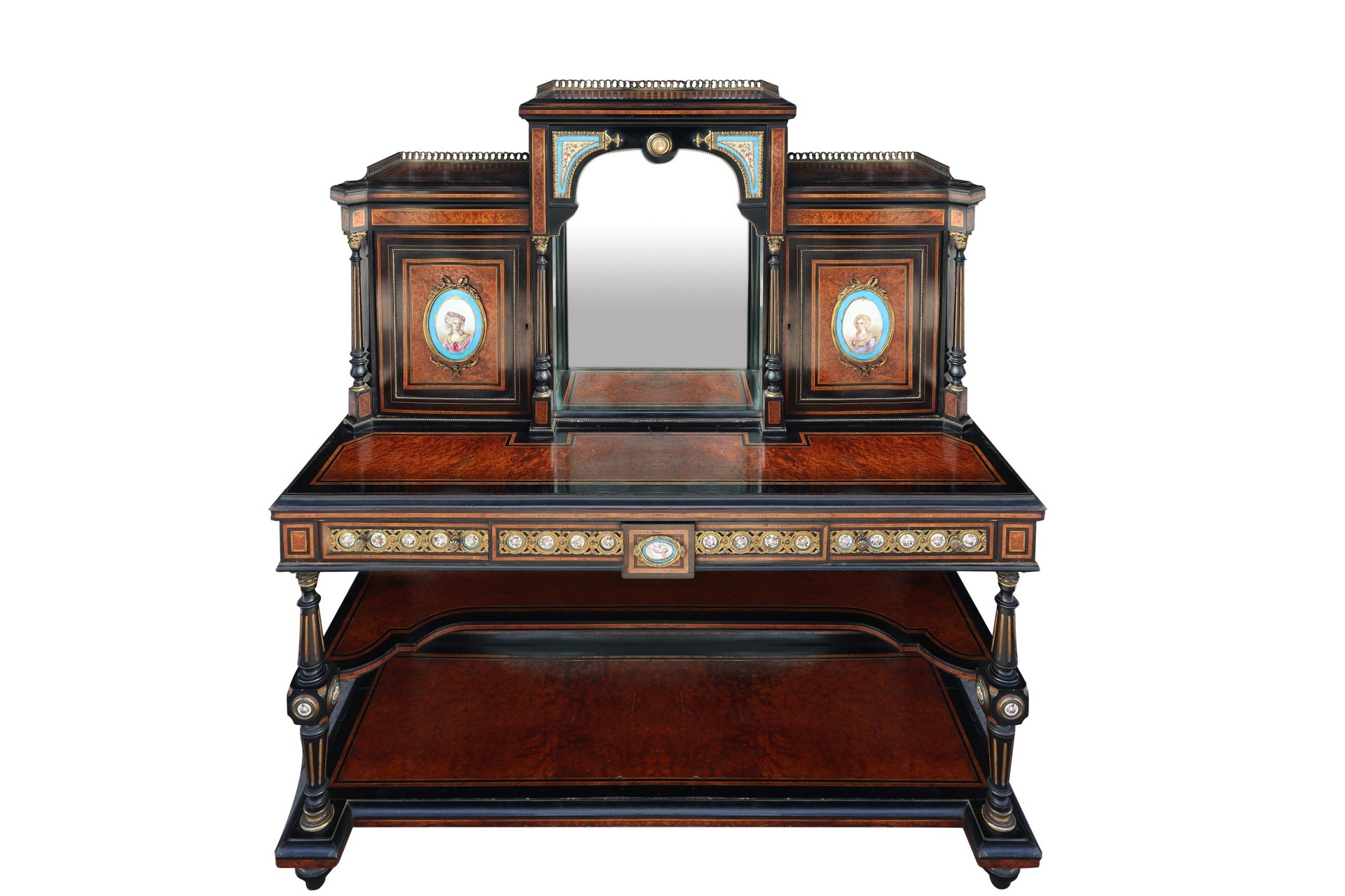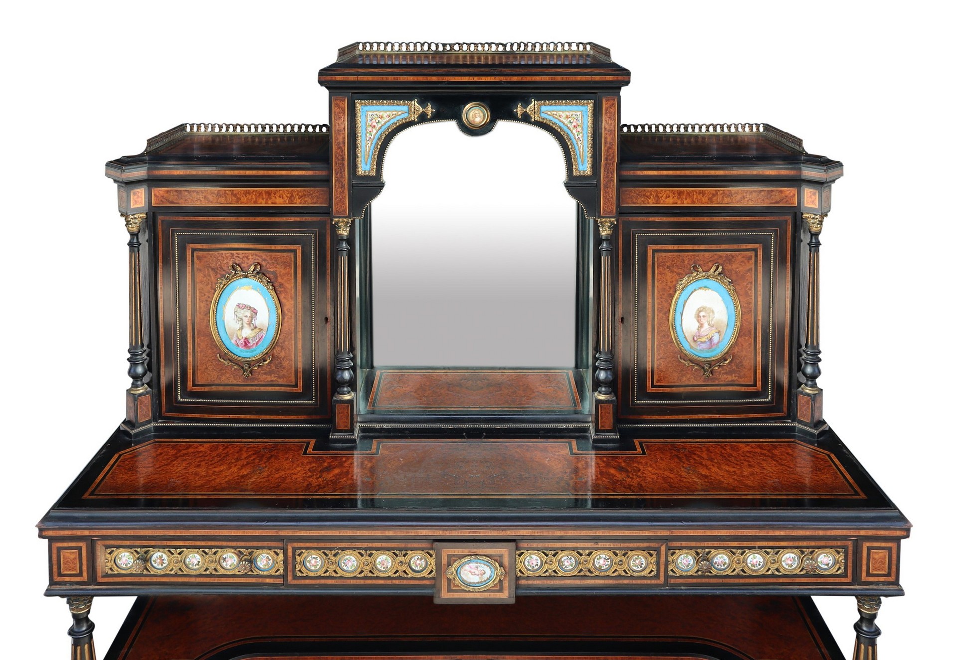Mobile bonheur du jour Napoleone III, France 19° secolo 151x136x56 Porcellane alla maniera di Sevres applicate agli sportelli e al bordo del piano. Modenature in ottone applicate. Specchio centrale.