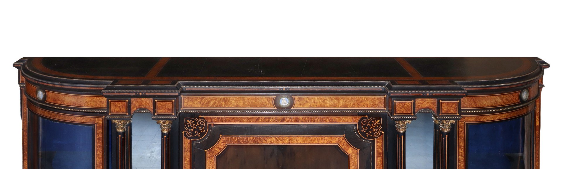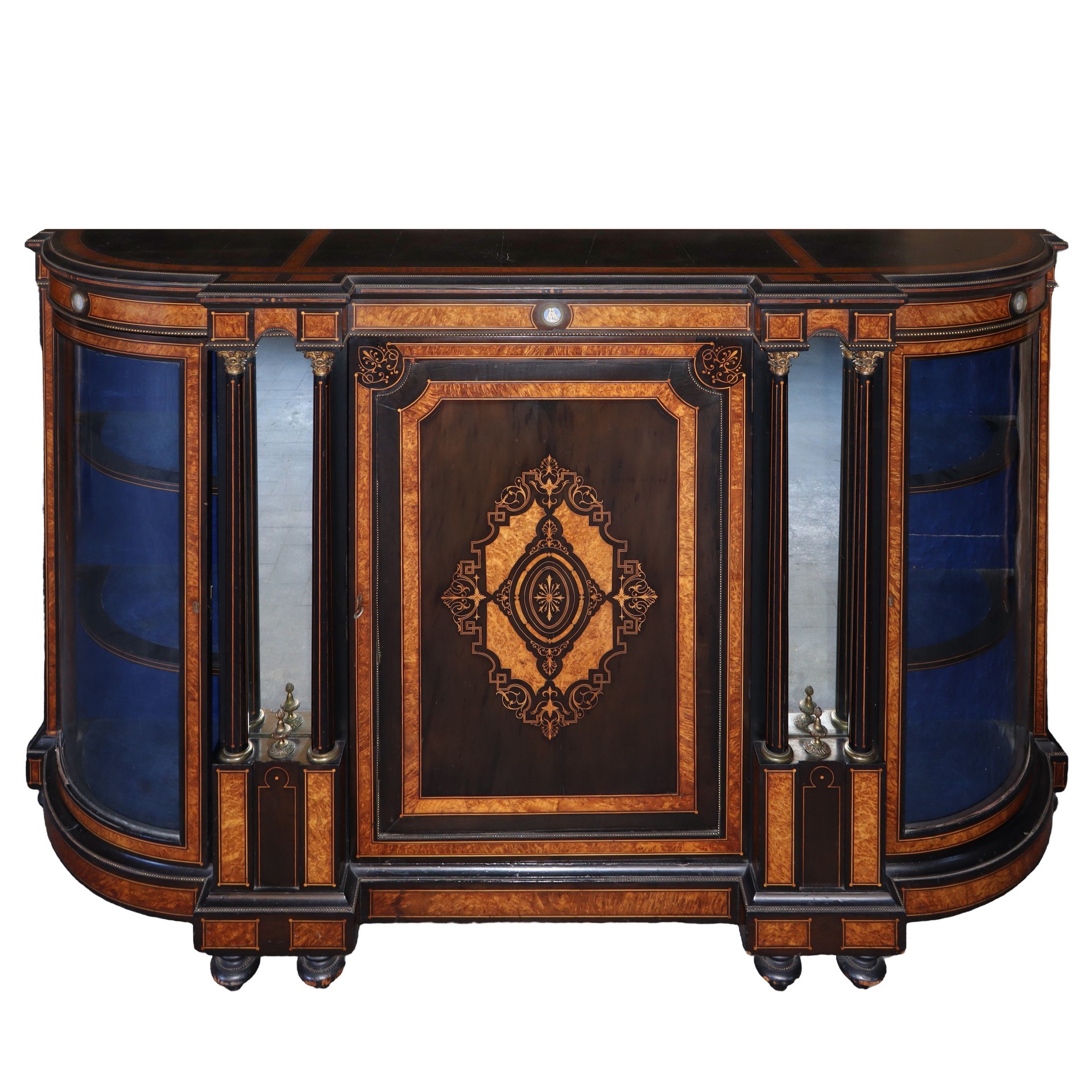 Etagere con sportello centrale intarsiato. Laterali a vetri, fine 19° secolo H cm 114x183x46