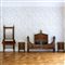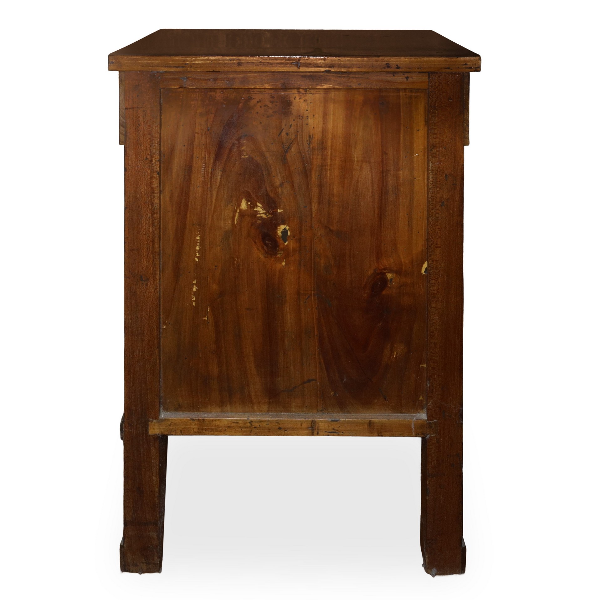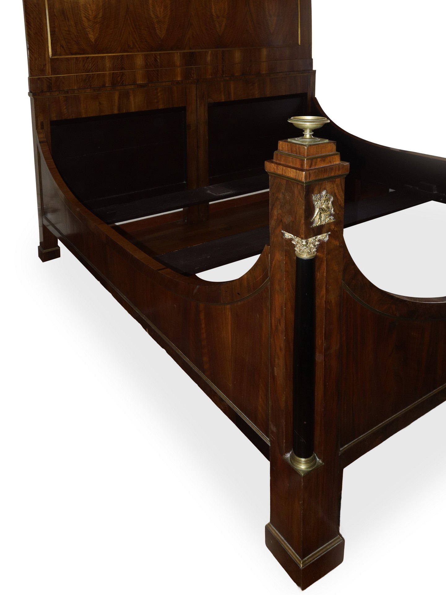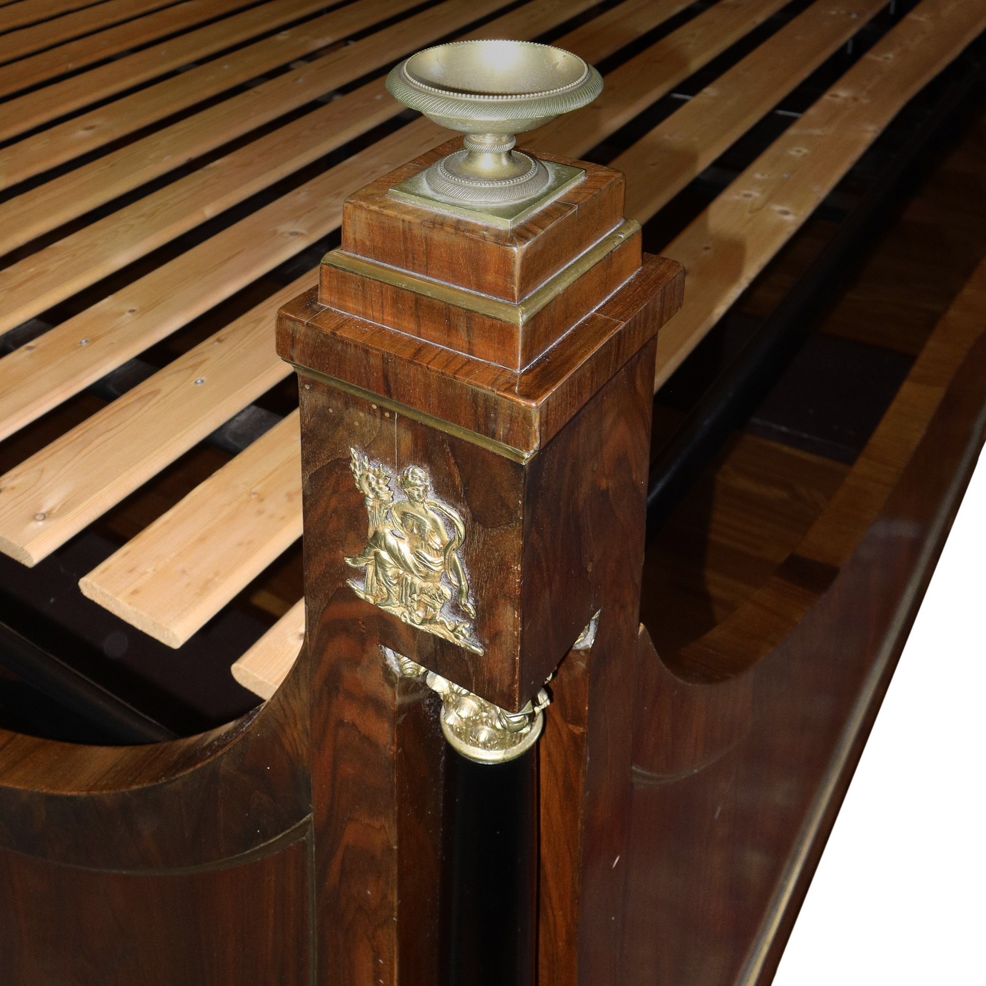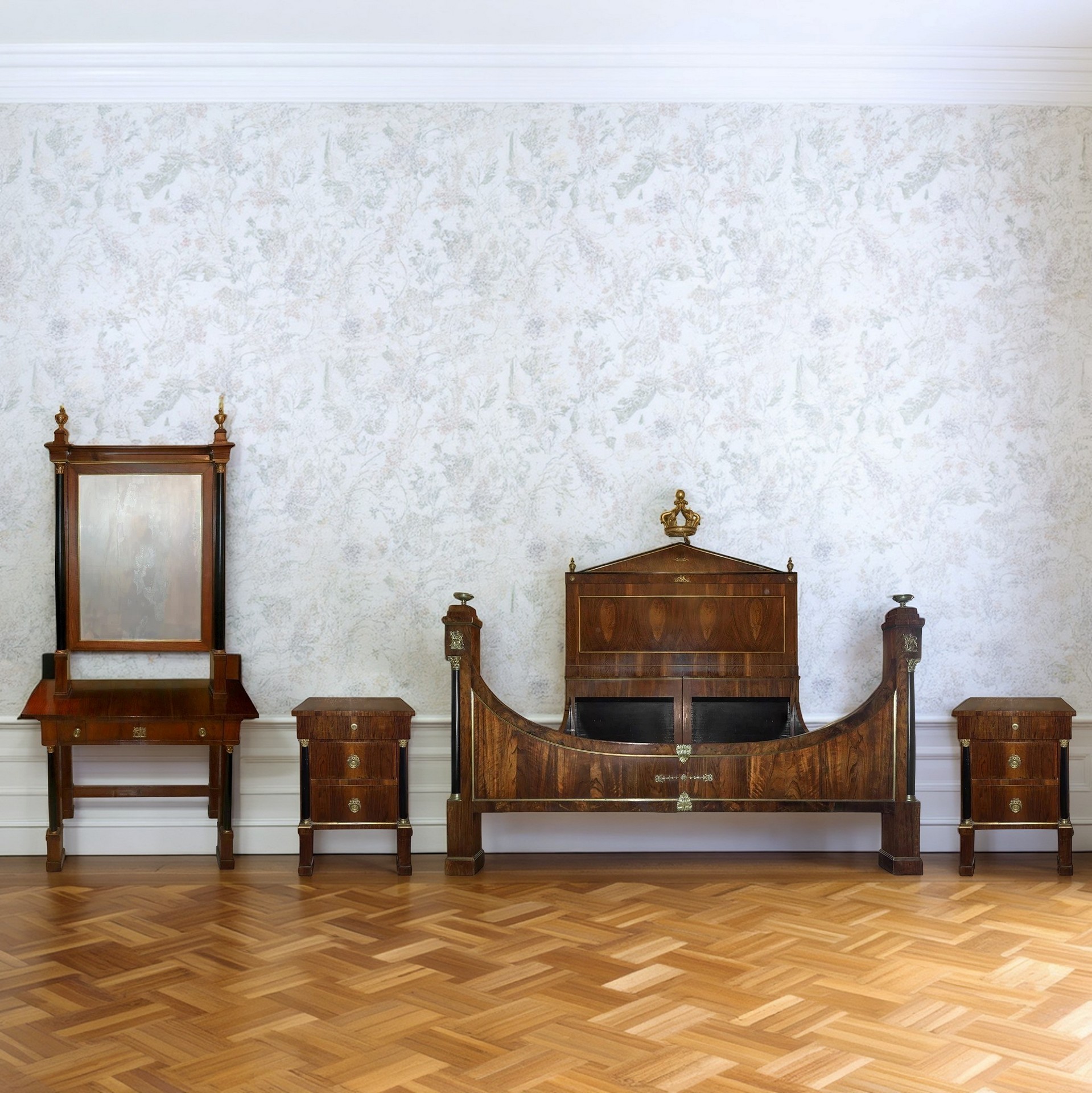 Camera da letto Emiliana con impiallacciatura in noce , Bologna, four° decade of the nineteen° secolo letto: h cm 232 (testata)X206X220 pediera h cm 124. Comodino: h cm 67X55X44. Toeletta: h cm 25X110X46 Gli arredi della camera da letto si compongono di: letto, consolle con specchiera, coppia di comodini.