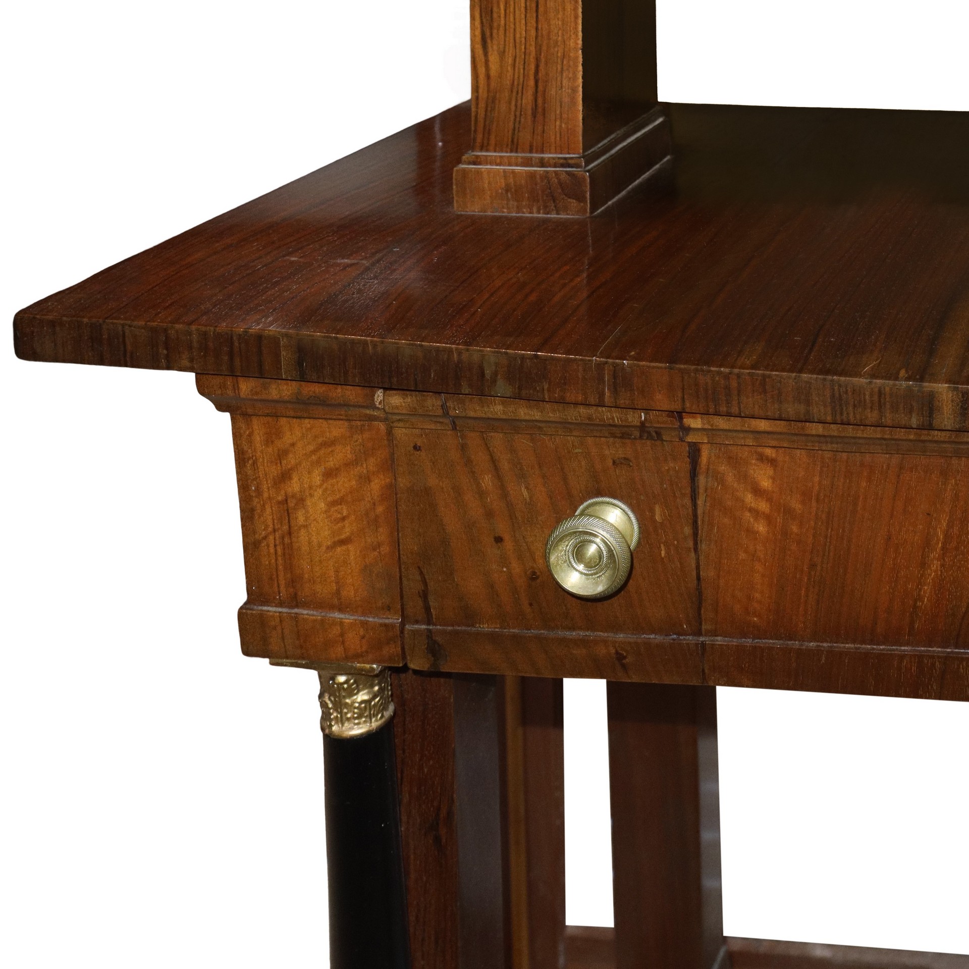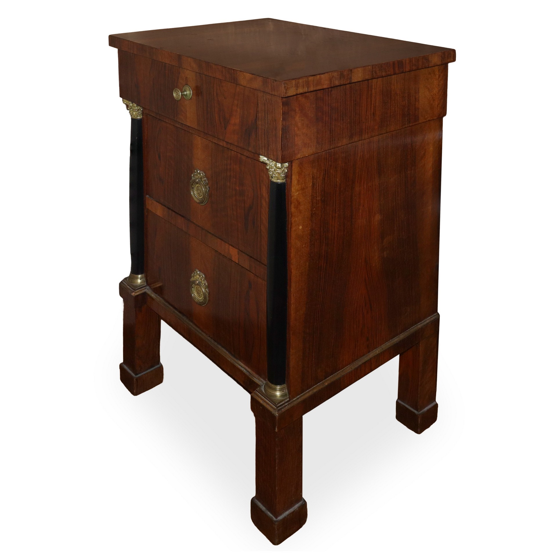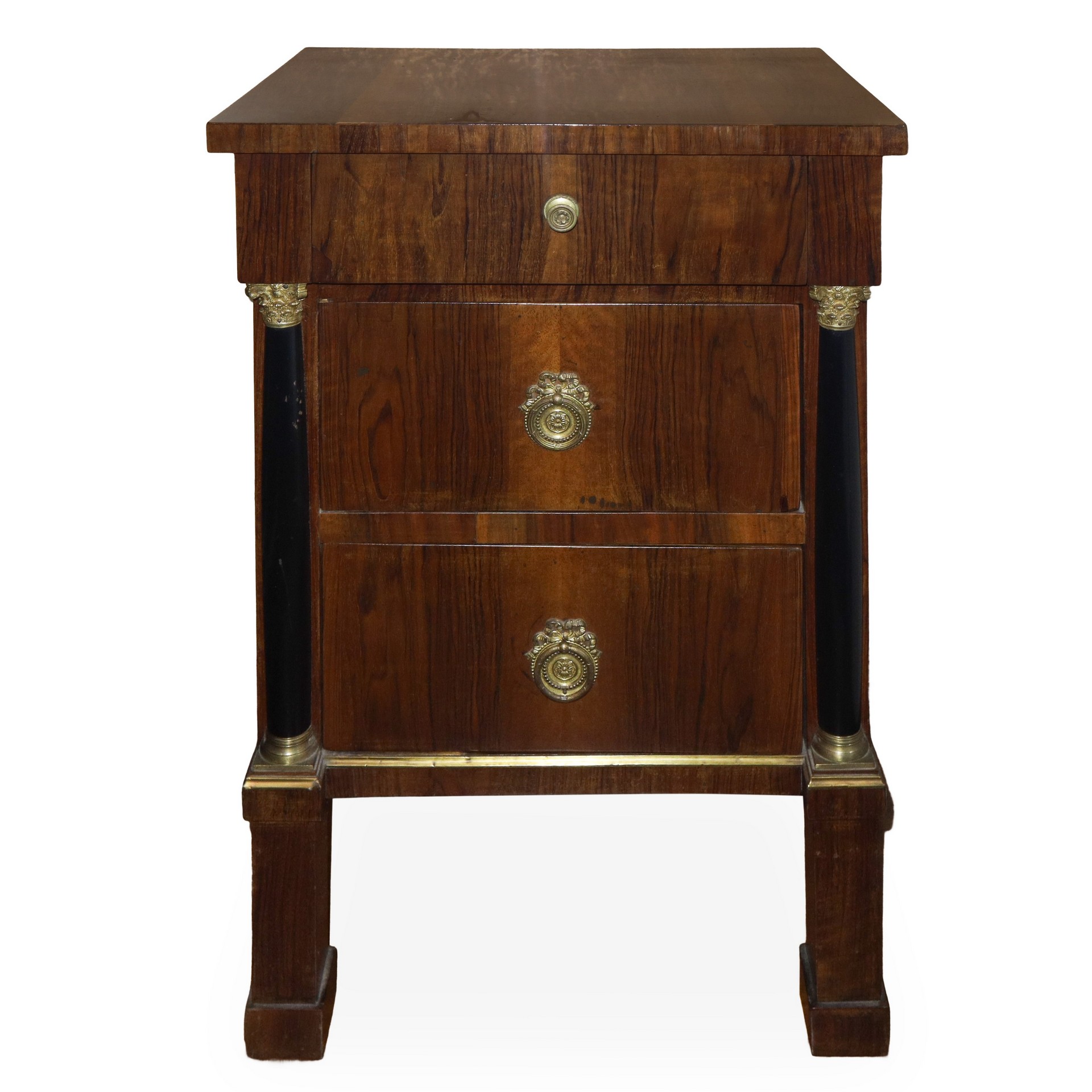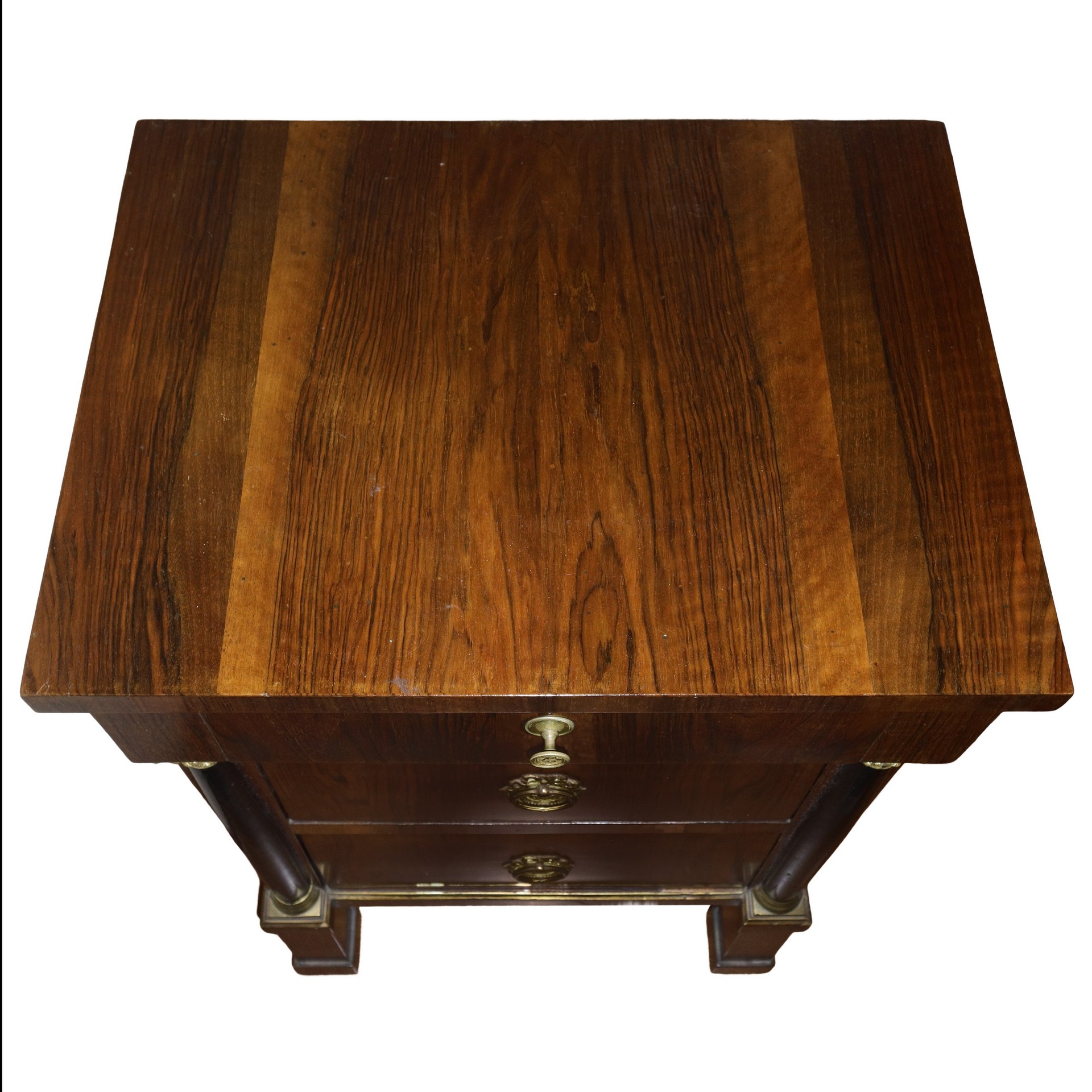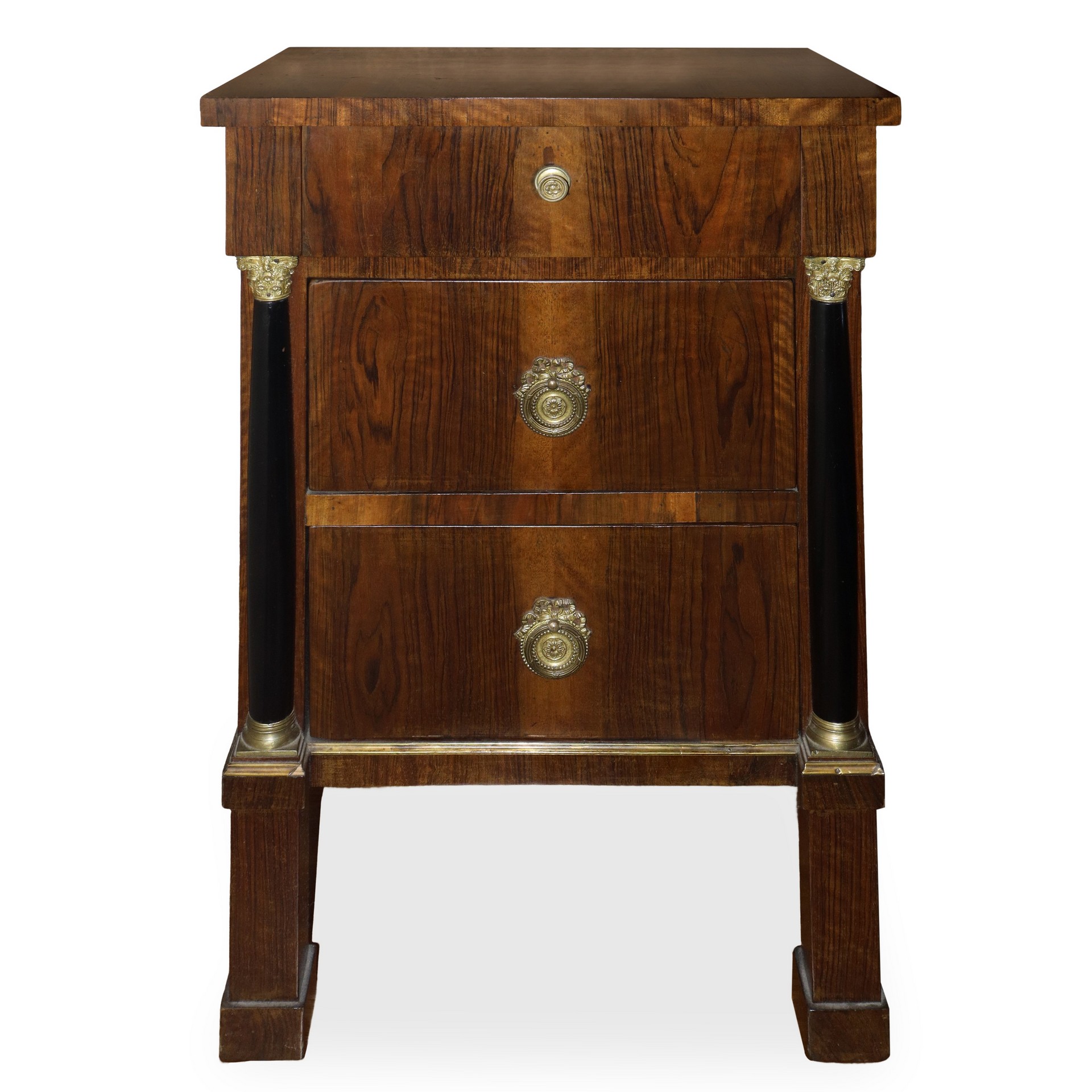 Camera da letto Emiliana con impiallacciatura in noce , Bologna, four° decade of the nineteen° secolo letto: h cm 232 (testata)X206X220 pediera h cm 124. Comodino: h cm 67X55X44. Toeletta: h cm 25X110X46 Gli arredi della camera da letto si compongono di: letto, consolle con specchiera, coppia di comodini.