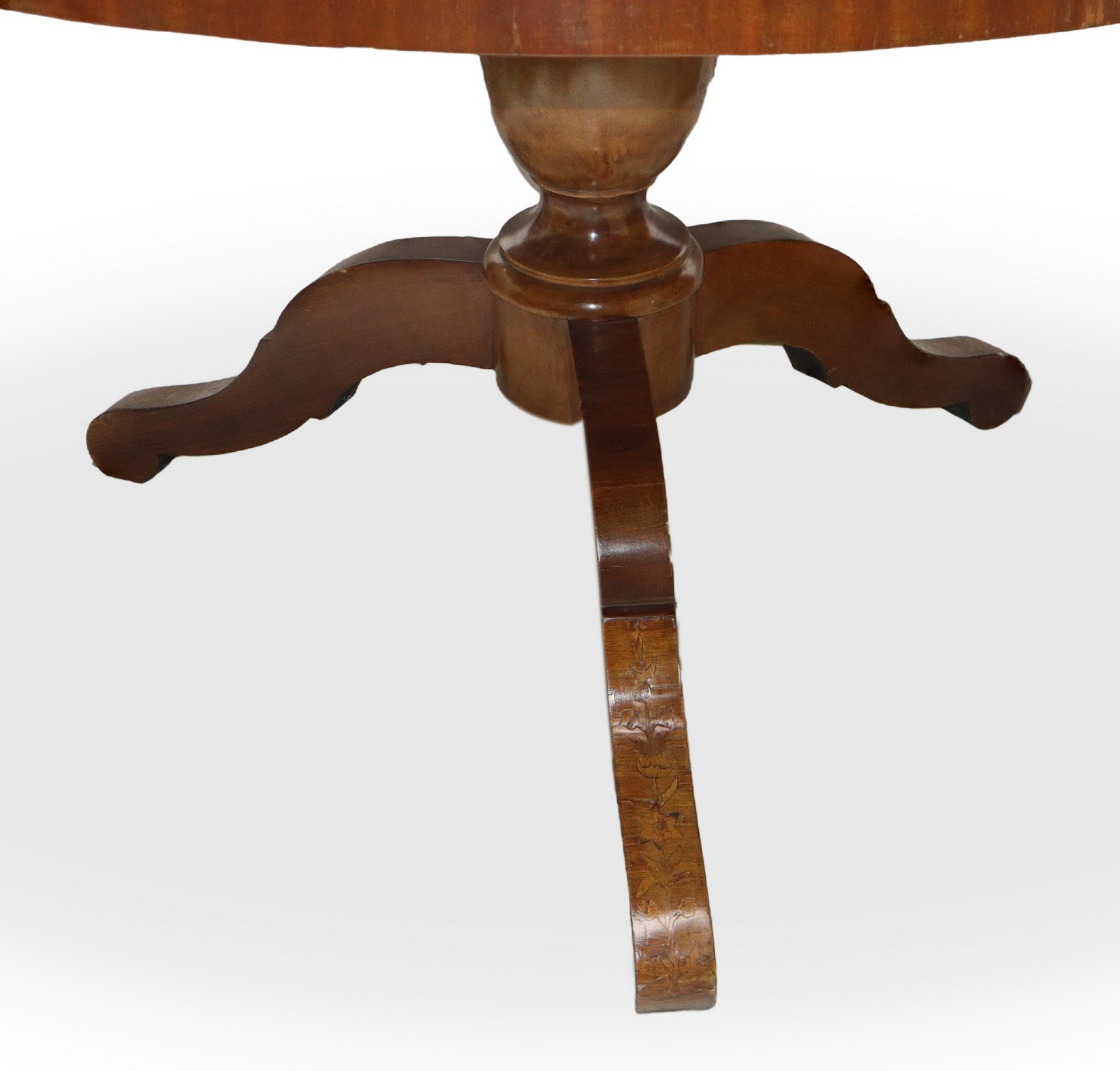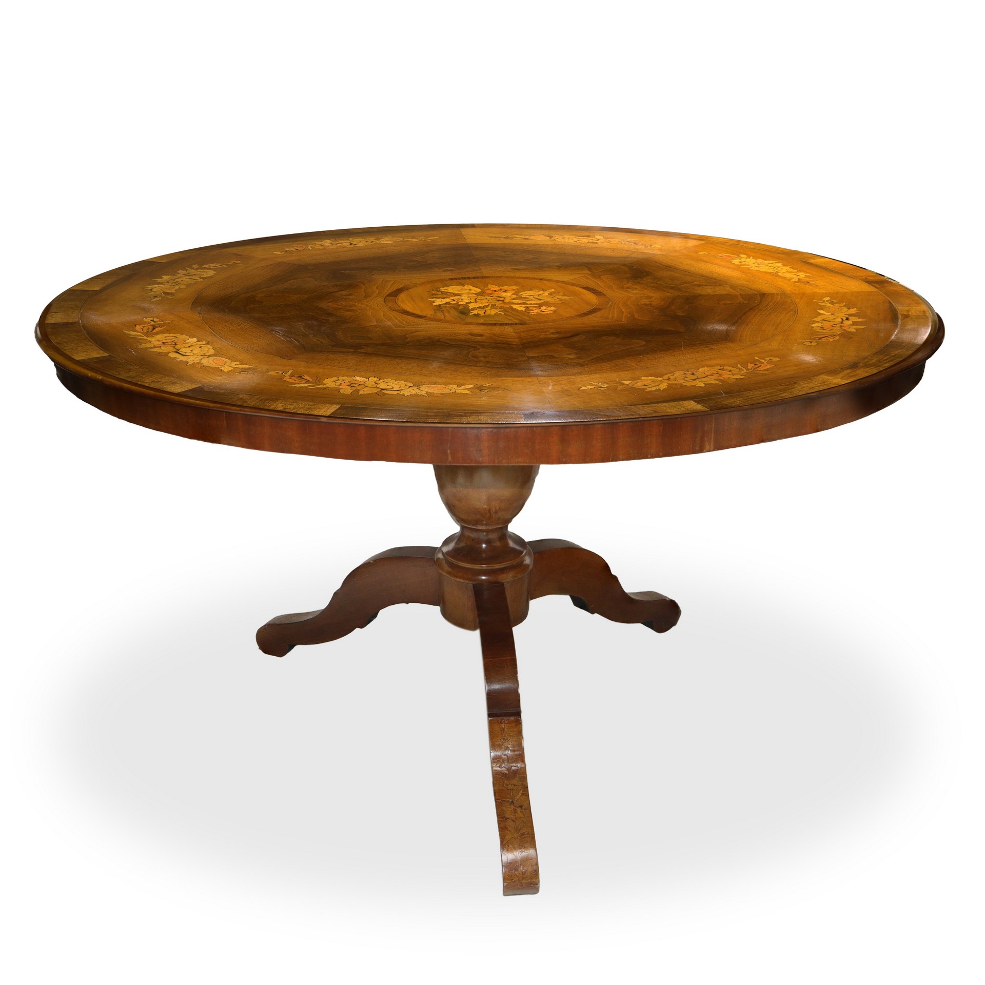Tavolo rotondo con intarsi floreali al piano colorati in legni vari., primi 20° secolo H cm 81x135 Piede a tre razze con intarsi.