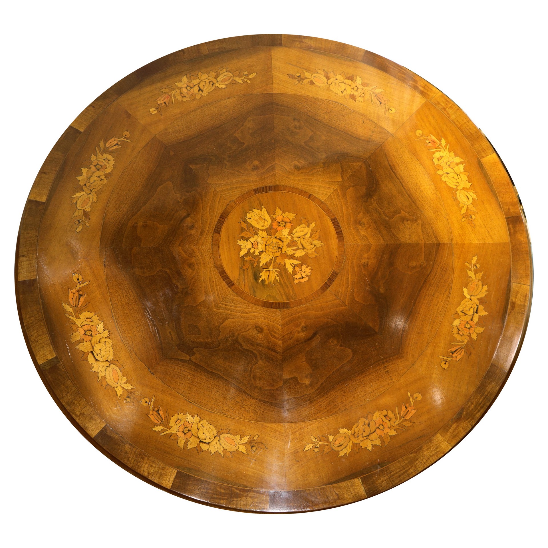 Tavolo rotondo con intarsi floreali al piano colorati in legni vari., primi 20° secolo