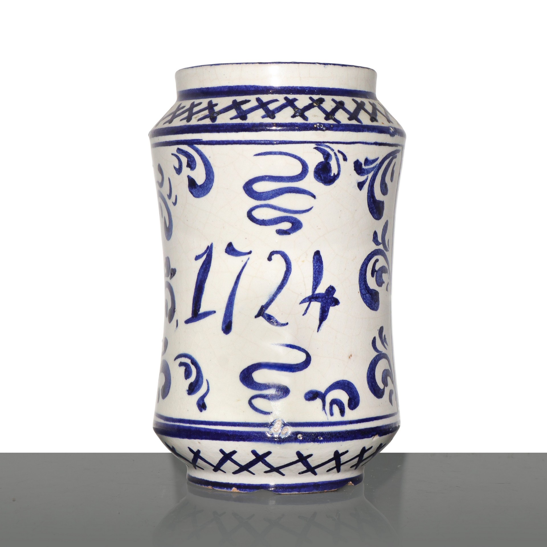 Albarello in maiolica di Savona sul fronte dipinto con scena mitologica , 1724 h cm 18,5 Datato sul retro