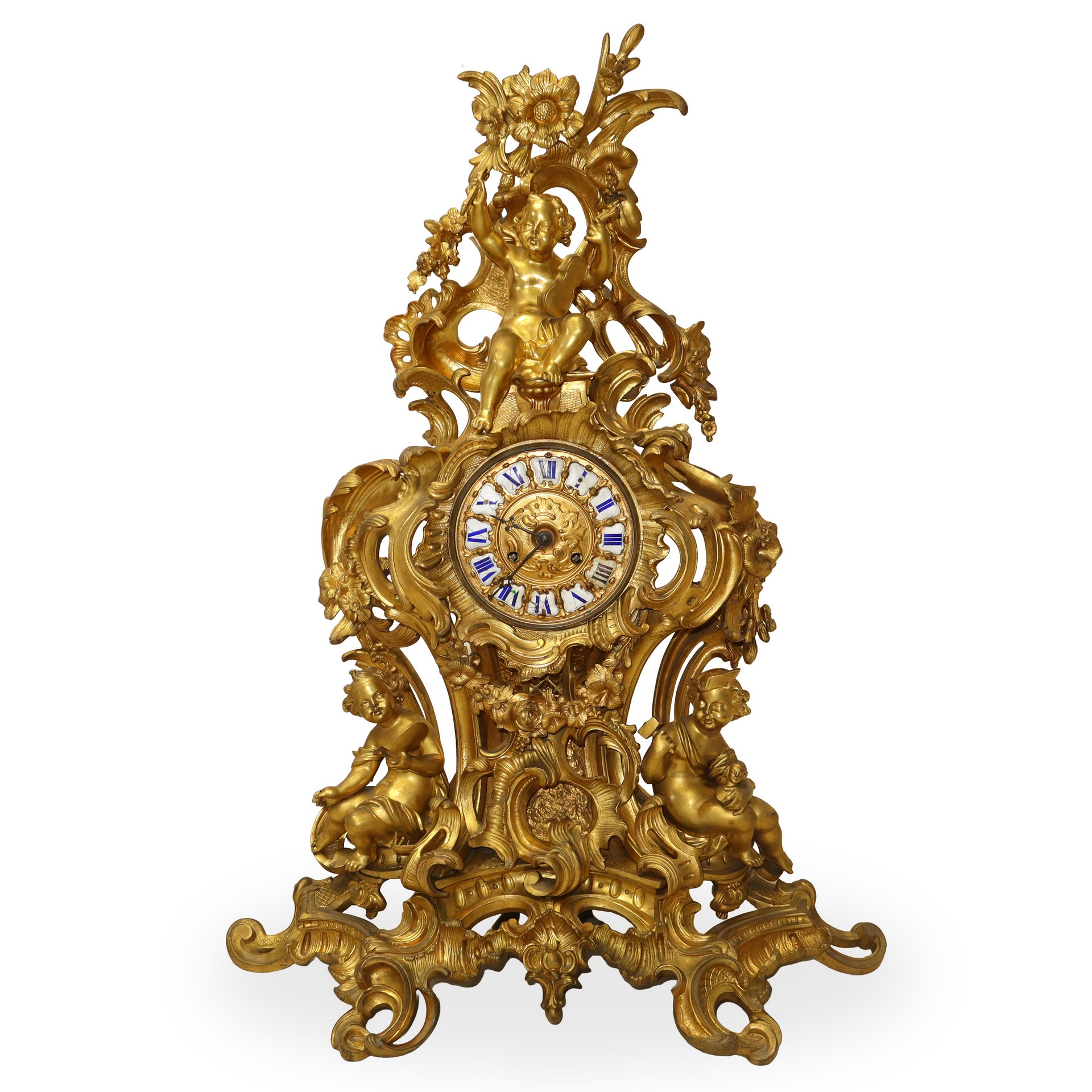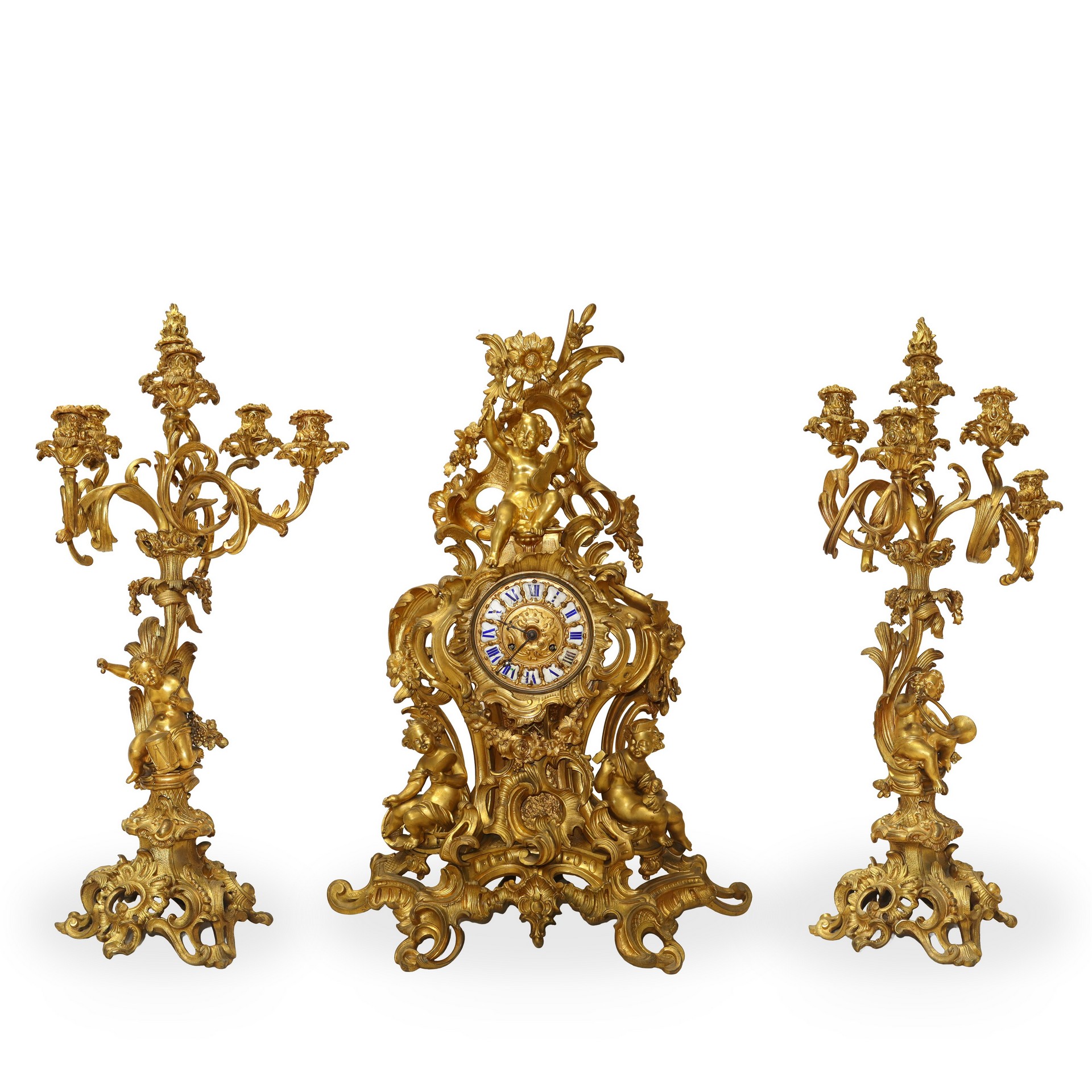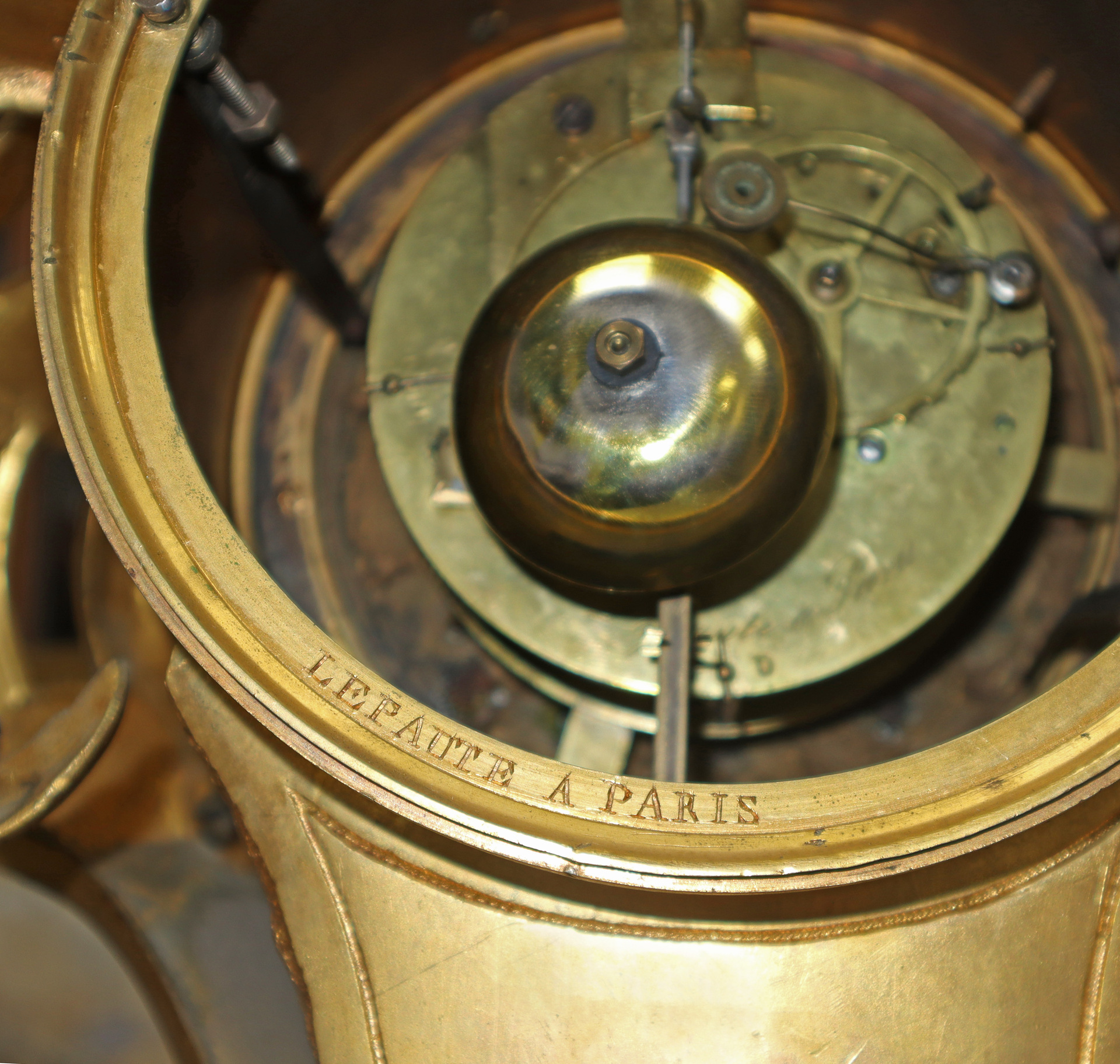 Jean-André Lepaute (1720 - 1789) - Trittico Luigi XVI in bronzo dorato composto da orologio e candelabri, Paris 18° secolo