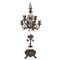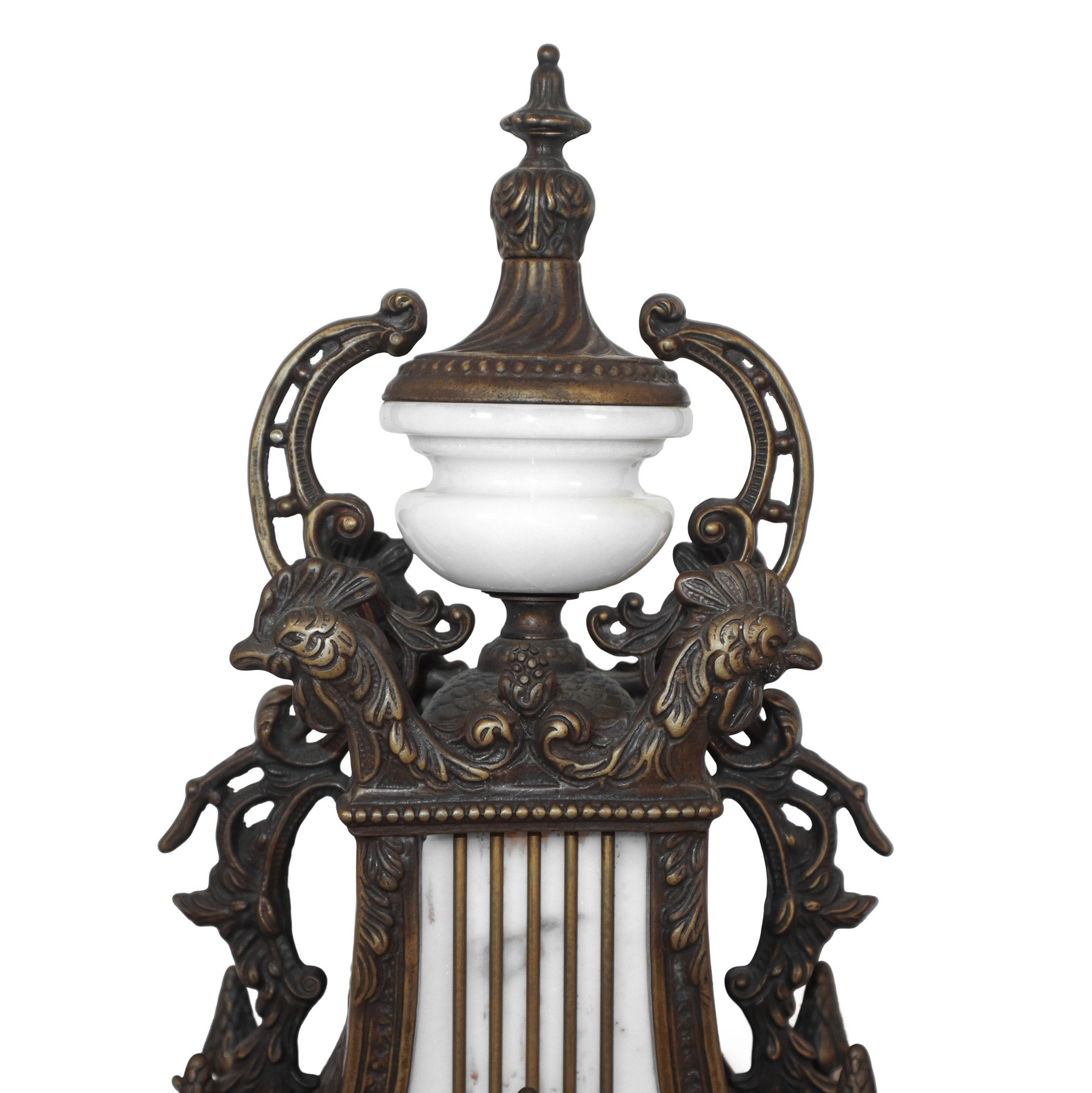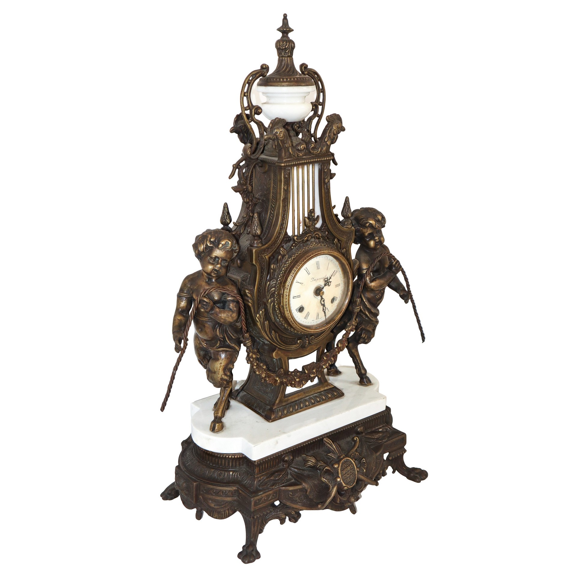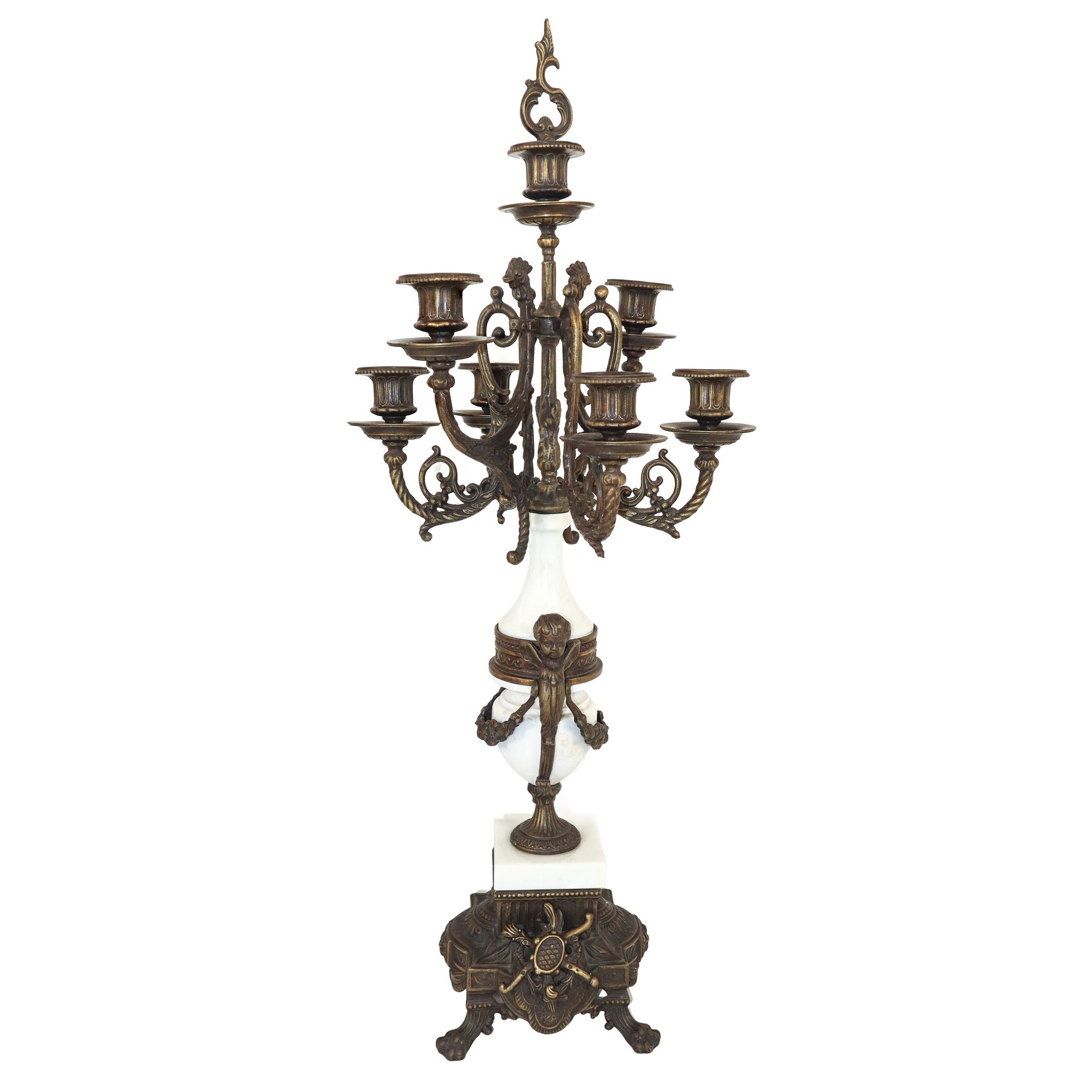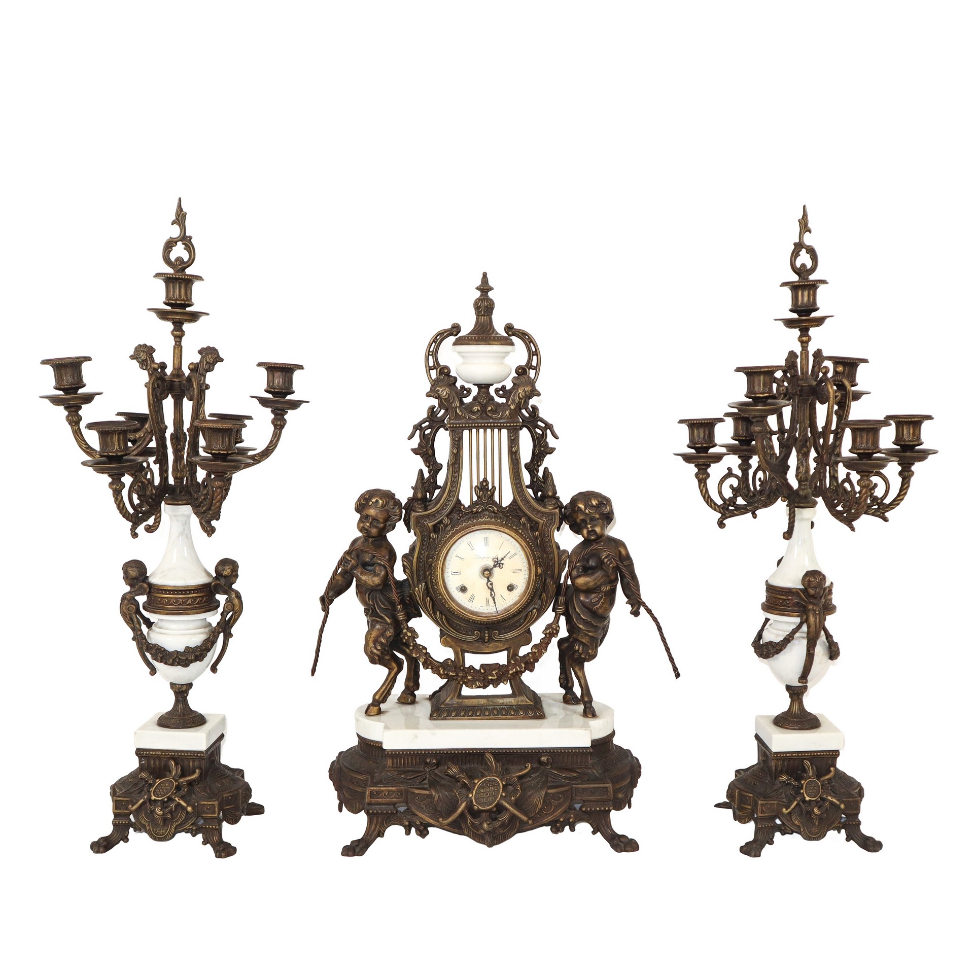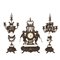 Trittico in bronzo patinato oro e marmo con orologio imperial con due fauni ai lati e due candelieri Napoleone III, 19° secolo