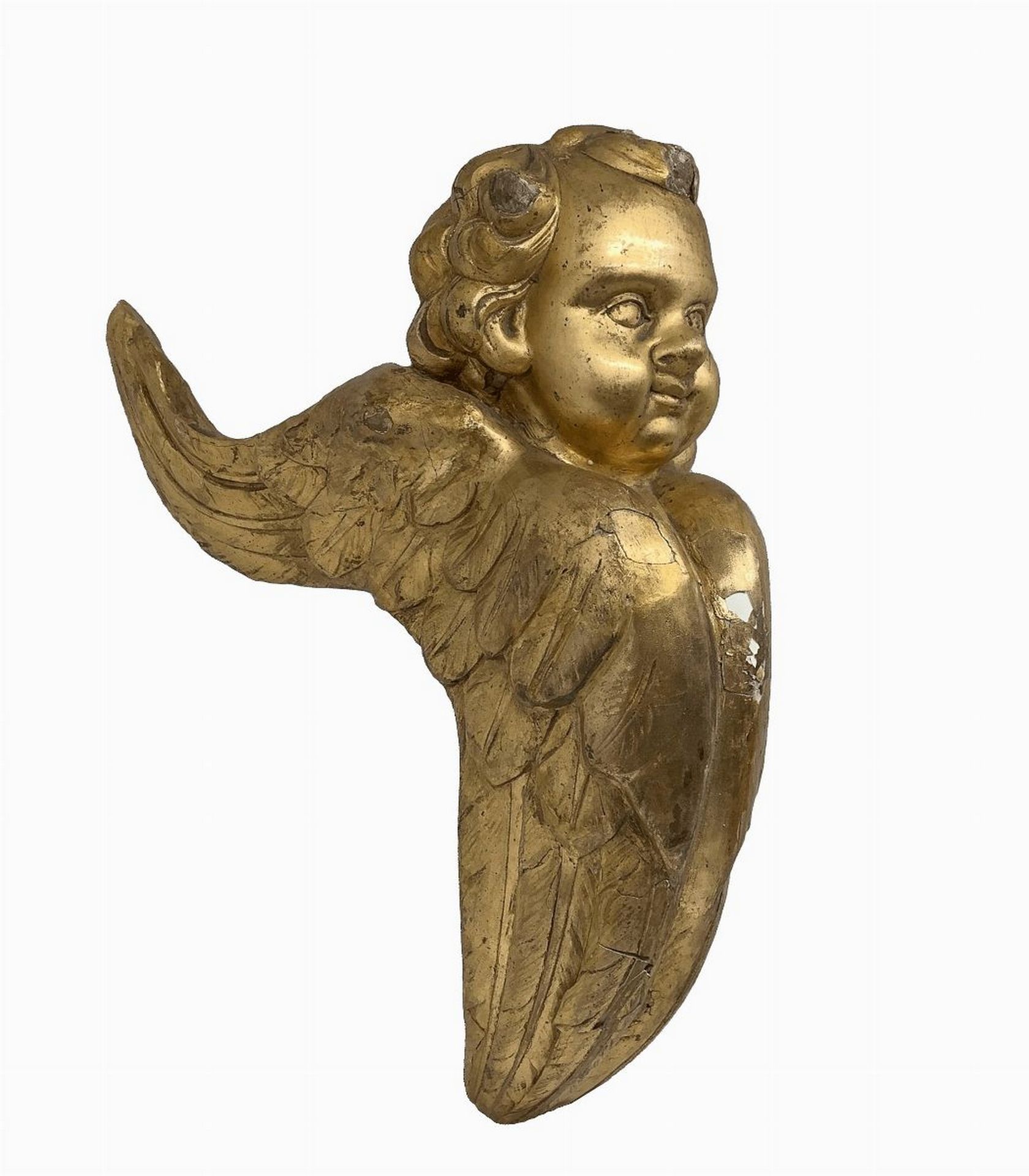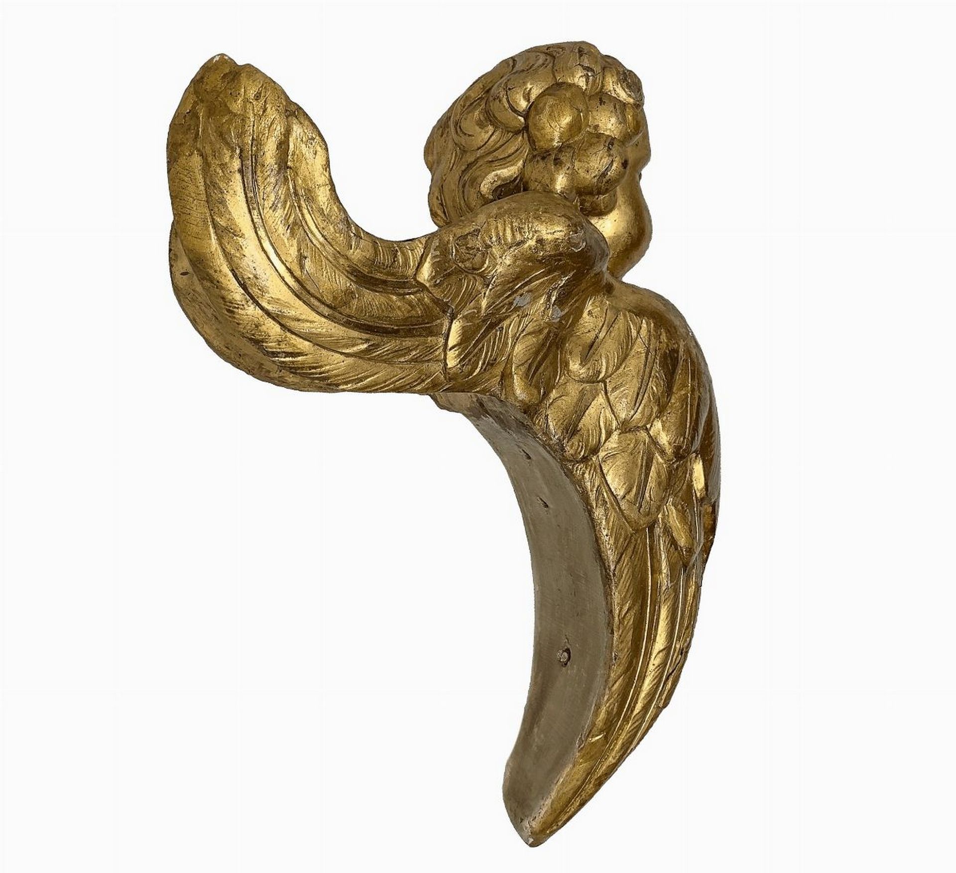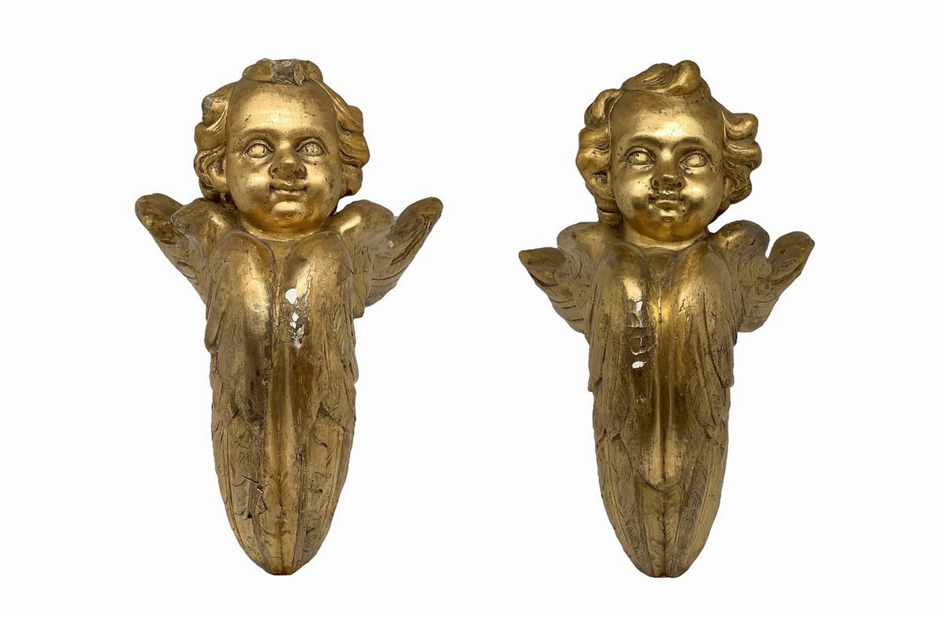 Coppia di angeli alati, fregi legnei, Sicily, fine 18° secolo h cm 29; profondità cm 21 Legno gessato e dorato a foglia