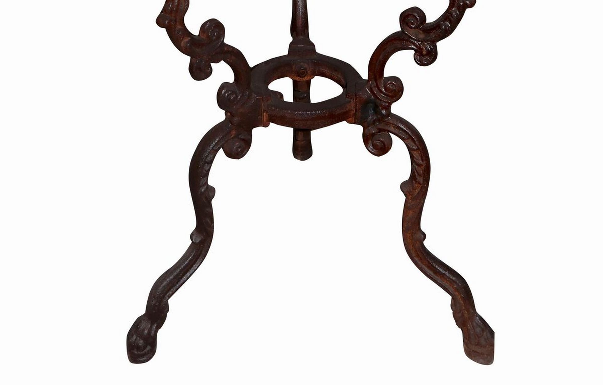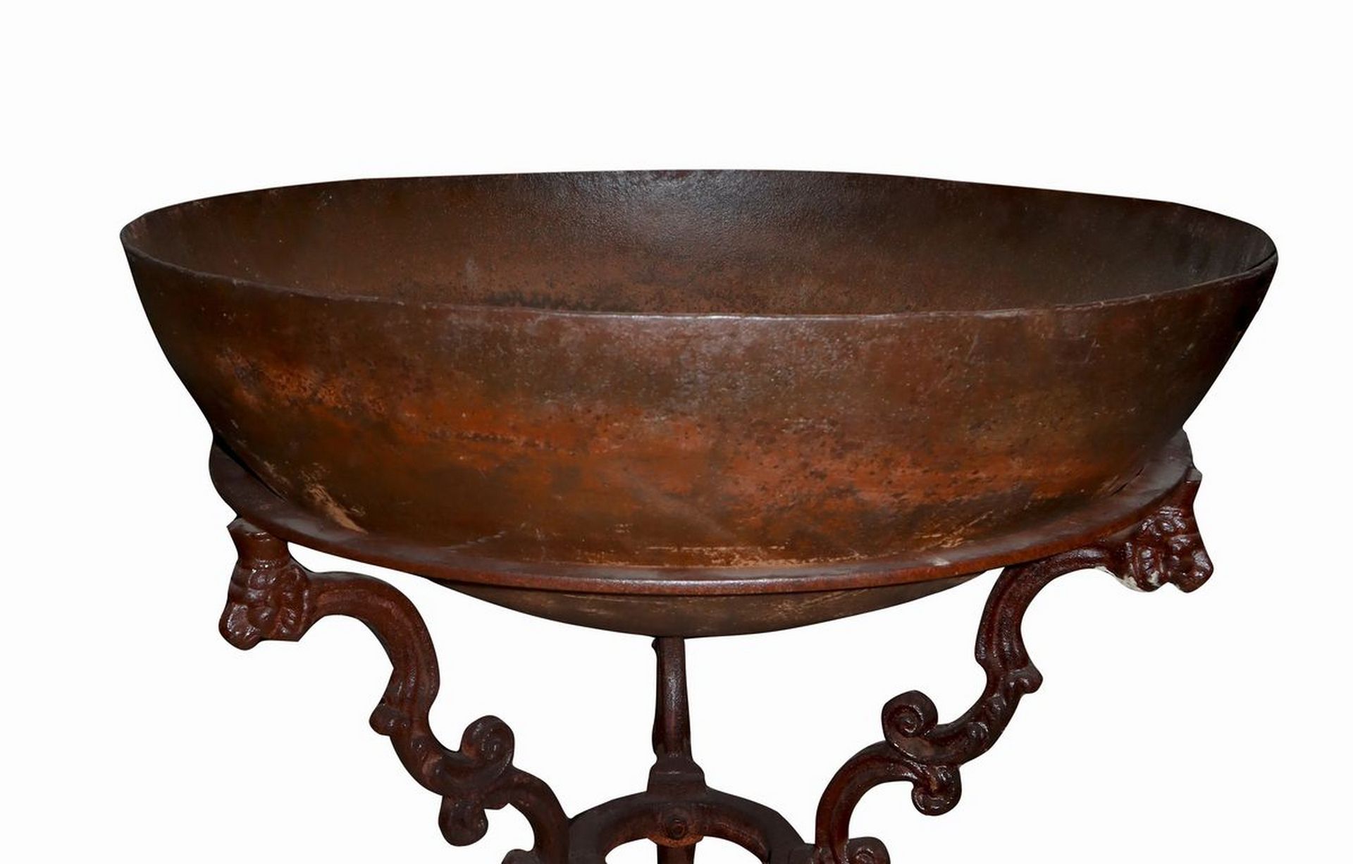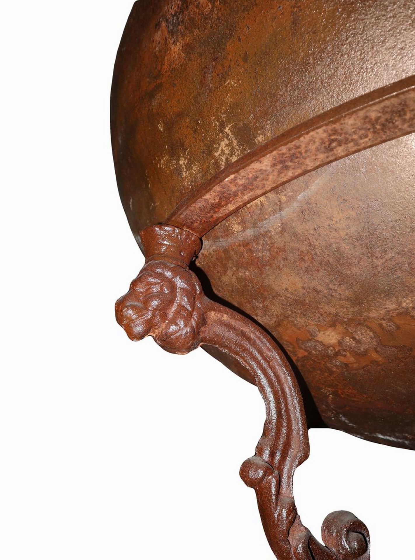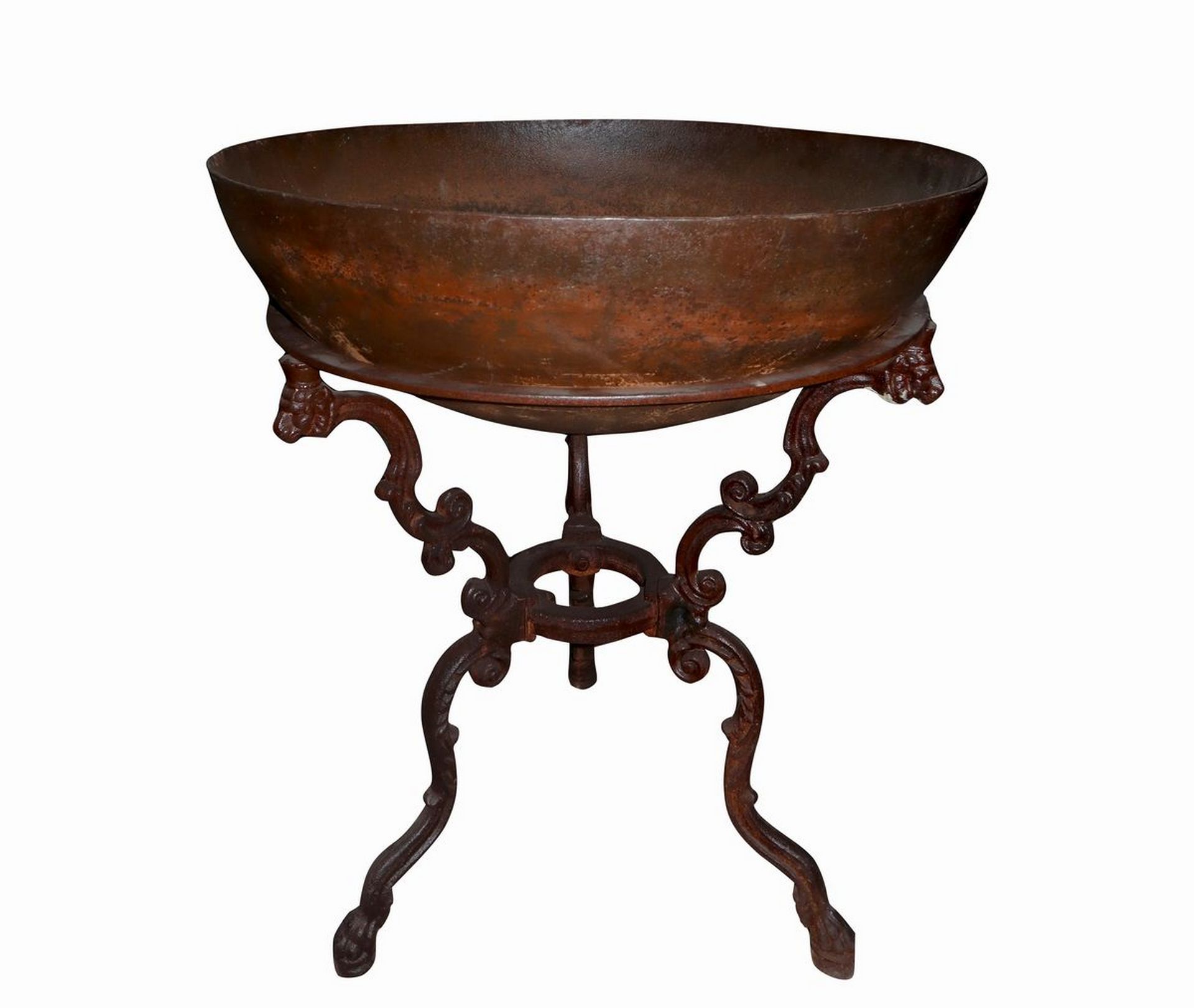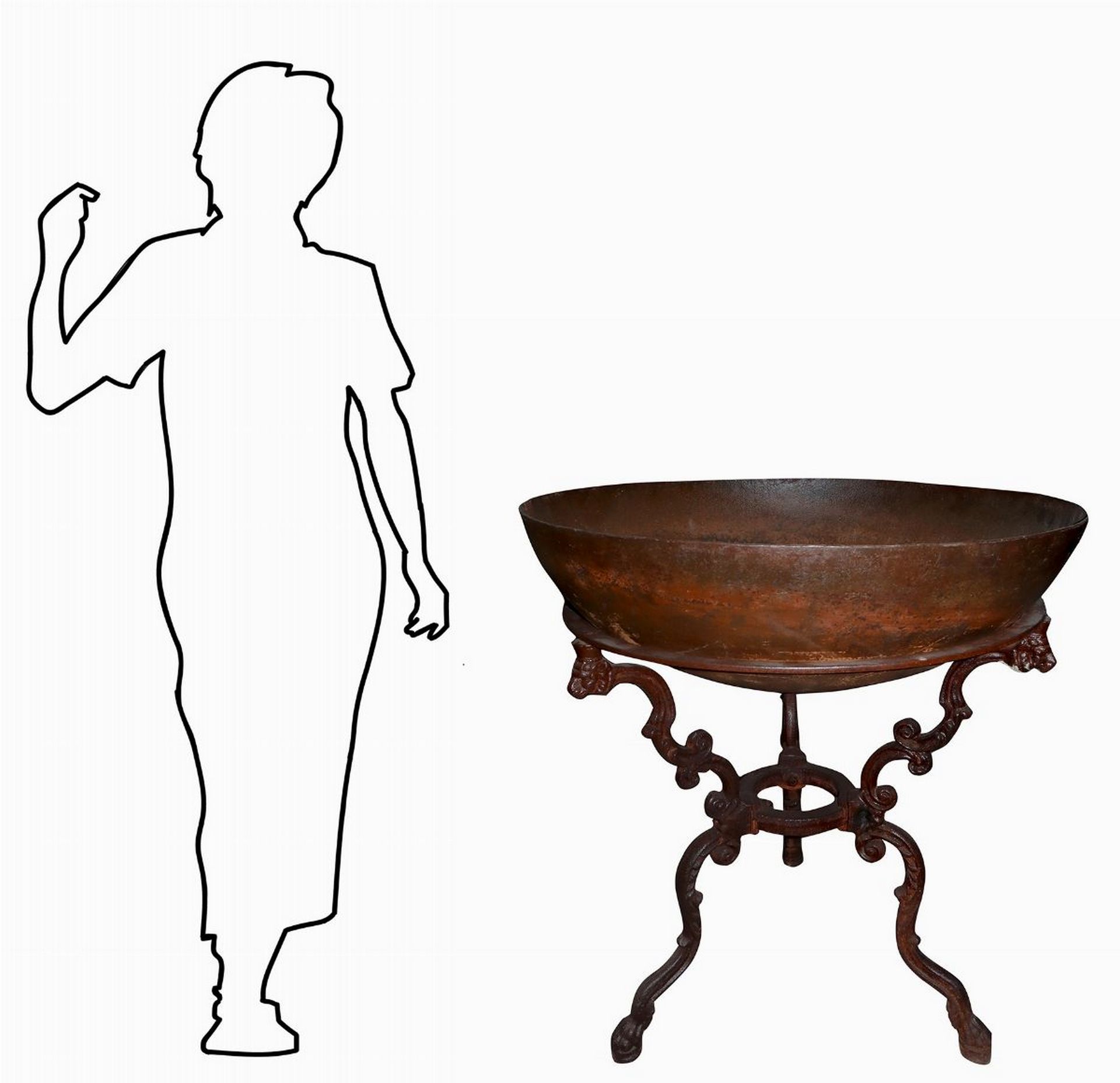 Braciere su supporto a tre piedi, 20° secolo h cm 93, circonferenza cm 89 Base in ghisa, coppa braciere in metallo