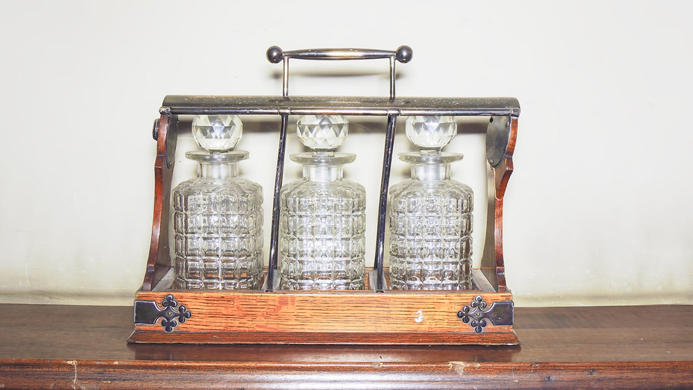 Lotto 446 | TANTALUS IN ROVERE E SHEFFIELD tre bottiglie in cristallo molato, difetti OAK...
