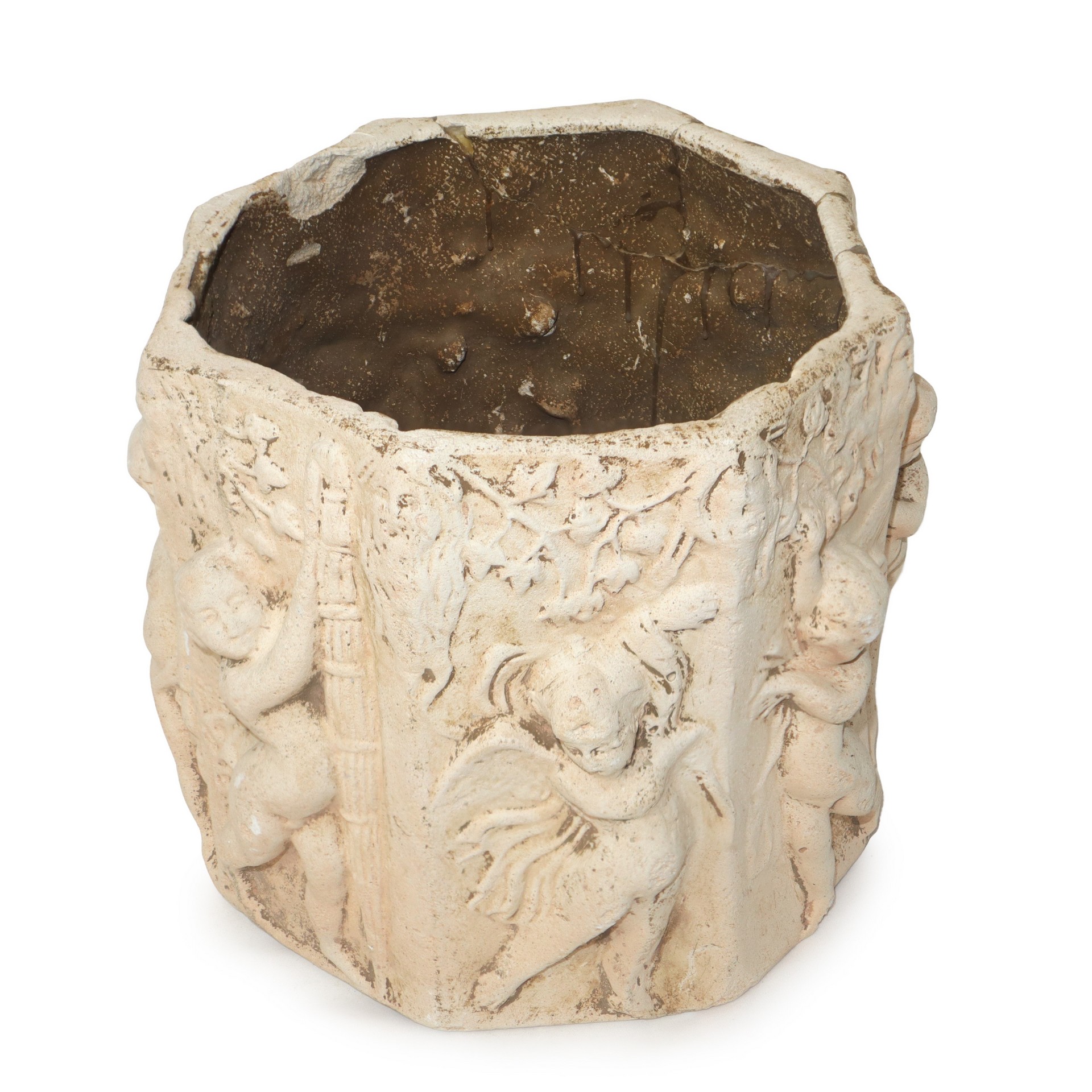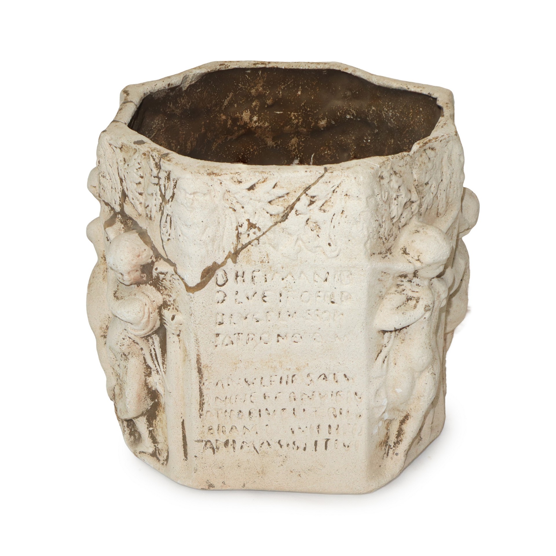 Vaso ottagonale in gesso decorato con putti a rilievo lungo tutto il corpo del vaso e iscrizione su uno dei lati h cm 26 diametro cm 26 Presente incollatura