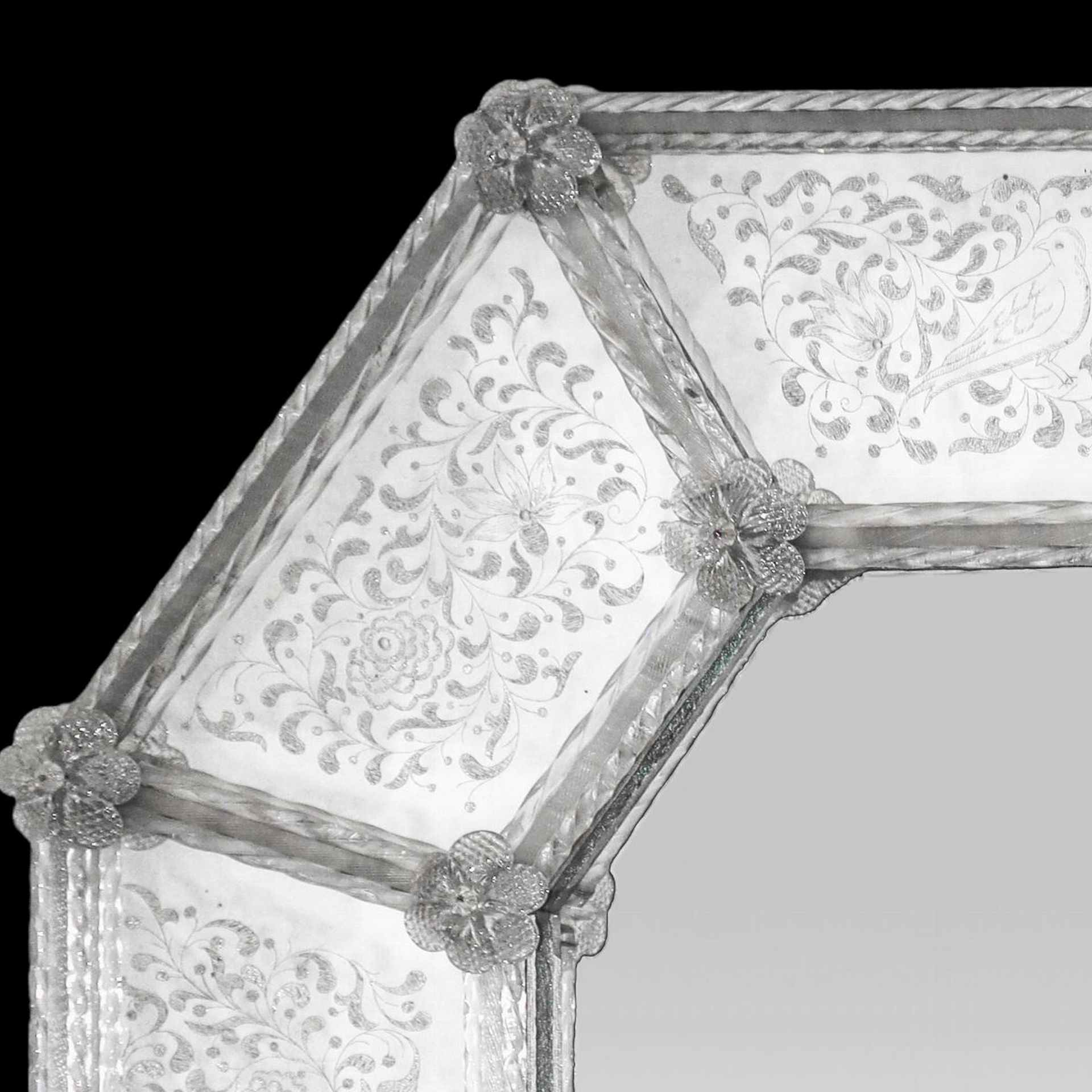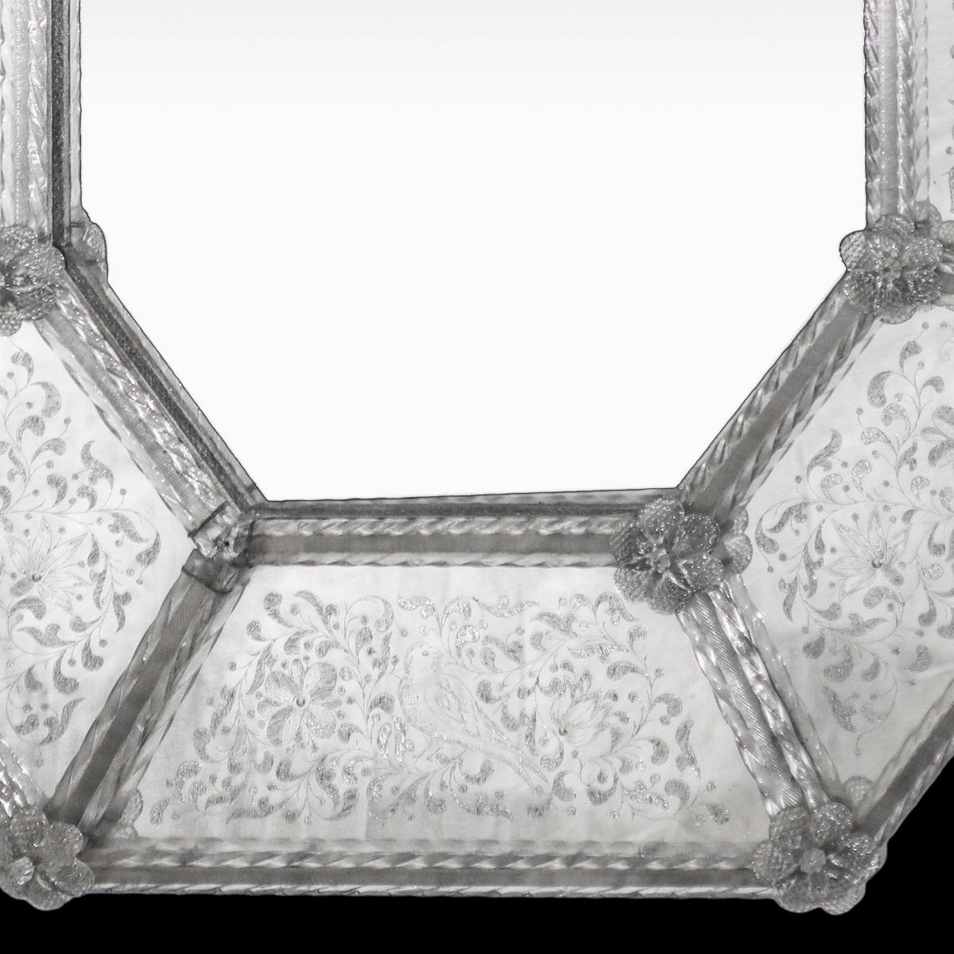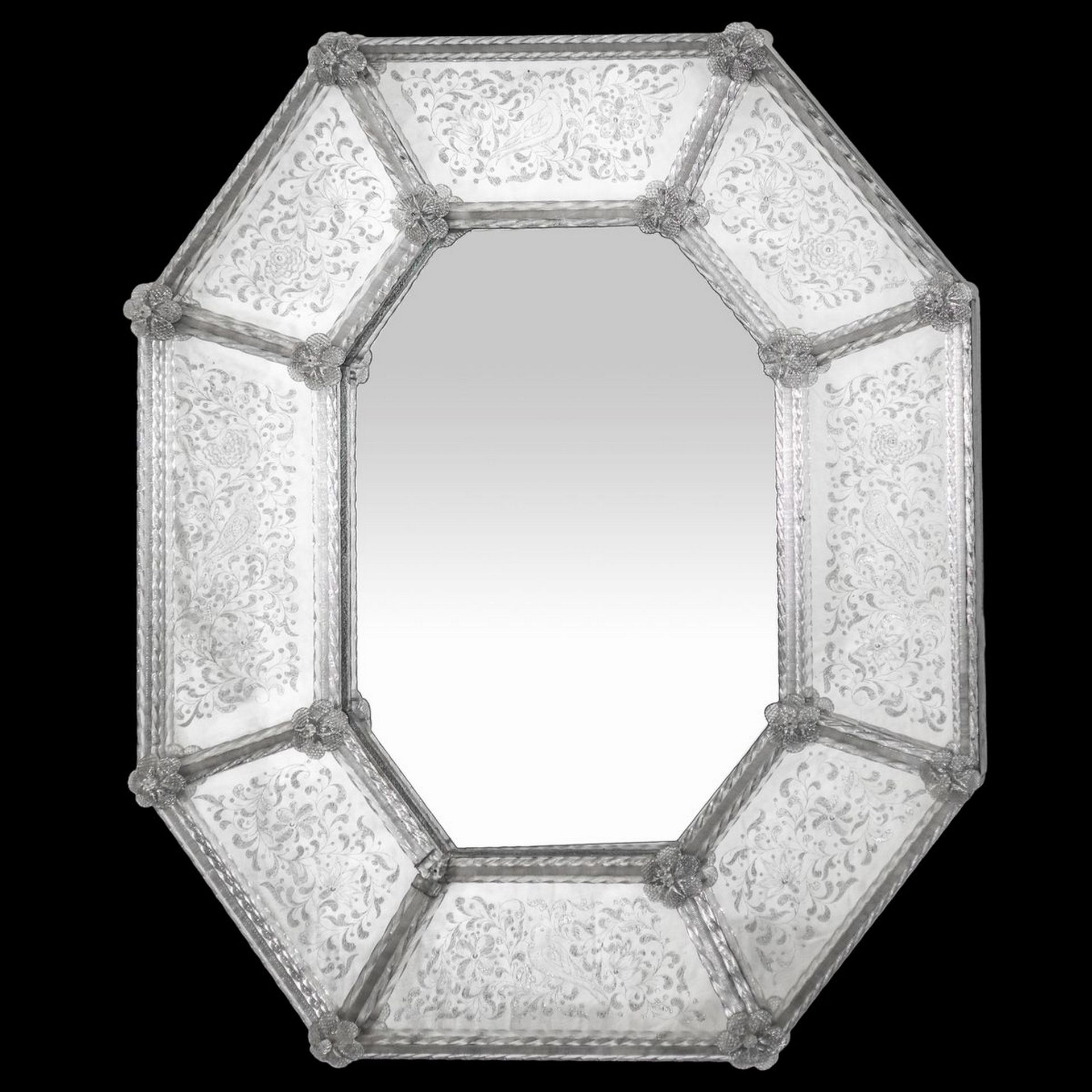 Specchiera in vetro di Murano ottagonale, primi 20° secolo Cm 78x63,5 In vetro molato e bulinato con decorazioni floreali e di uccelli