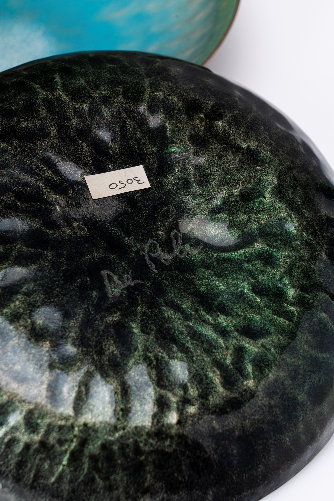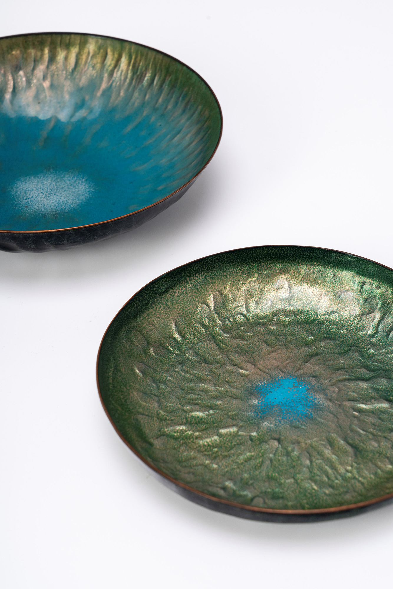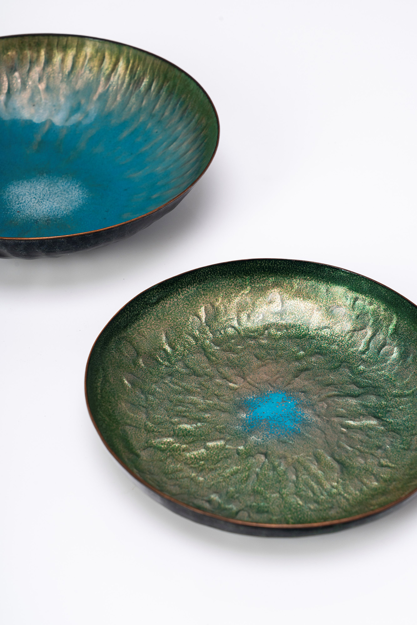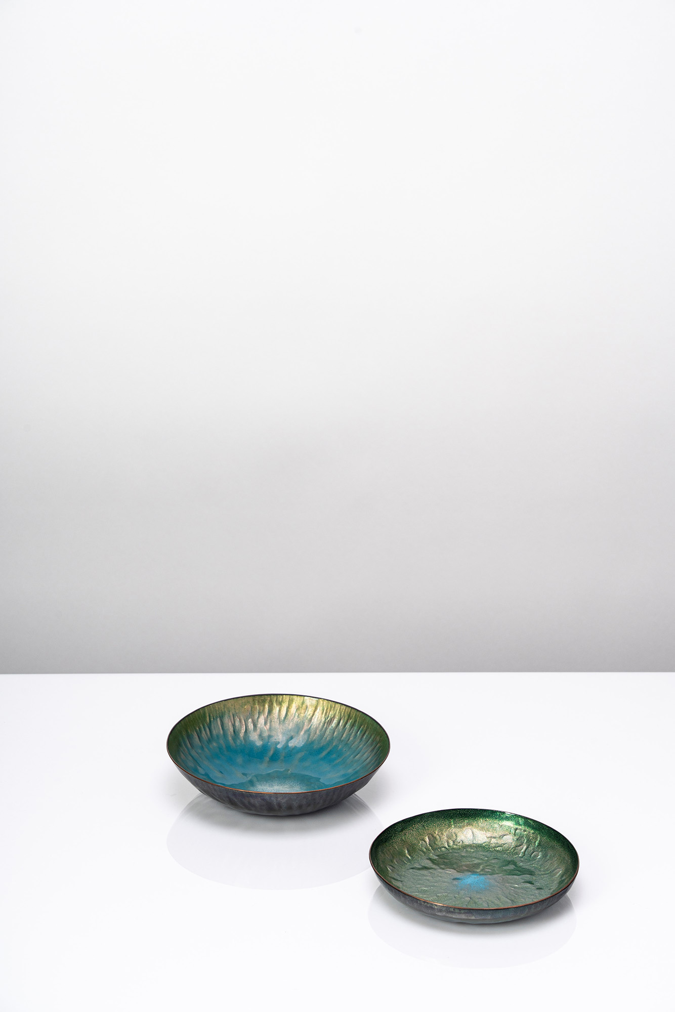 Coppa e svuotatasche a smalti policromi su rame nei toni del verde e dell'azzurro