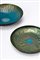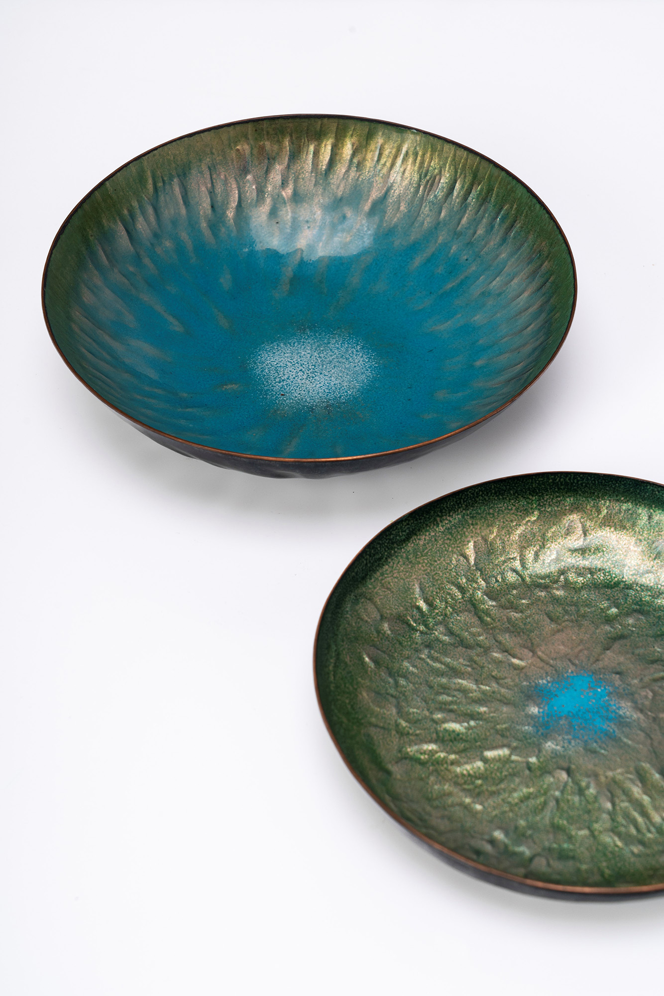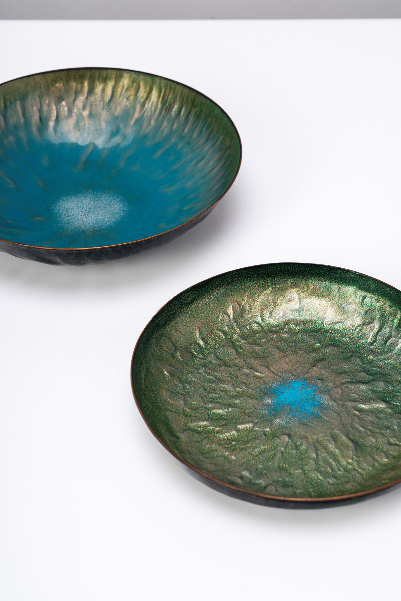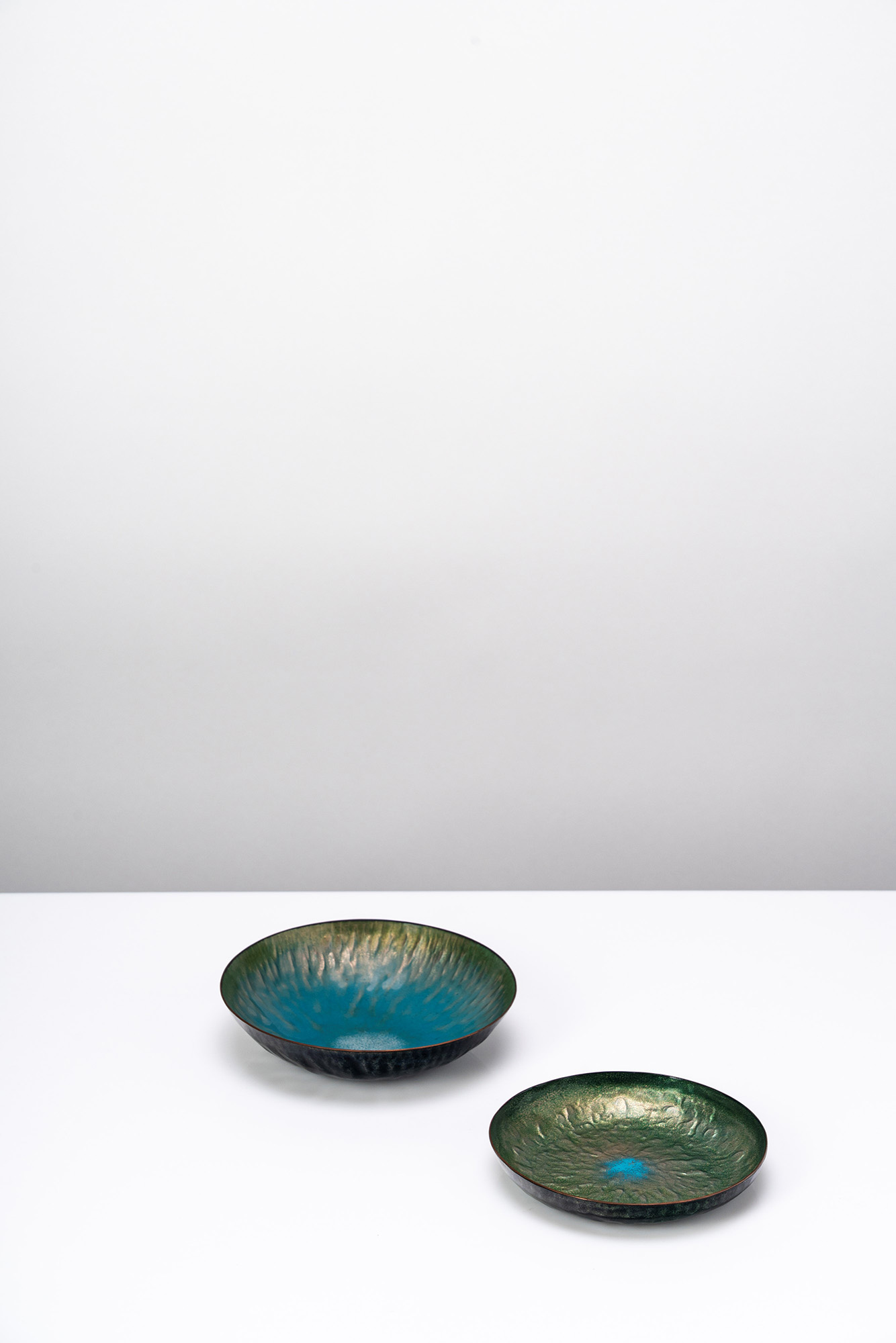 Coppa e svuotatasche a smalti policromi su rame nei toni del verde e dell'azzurro