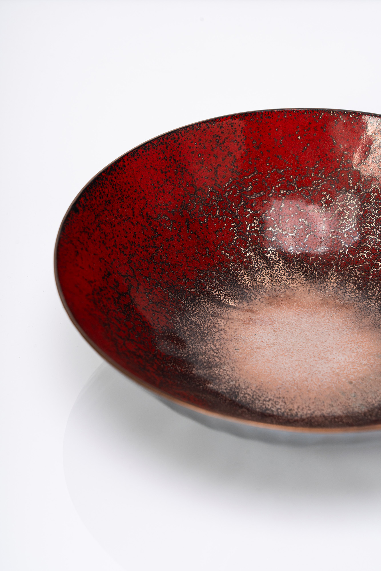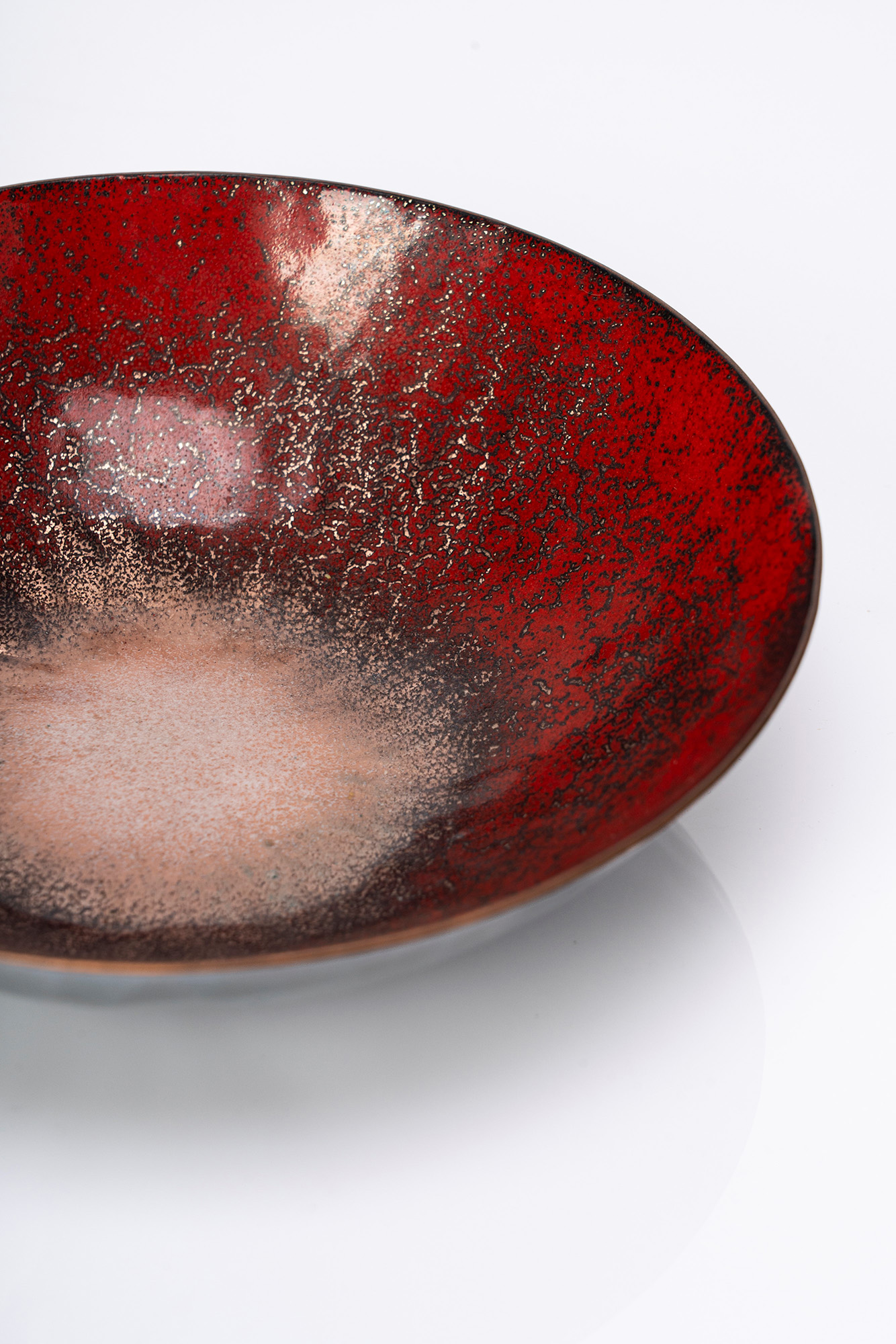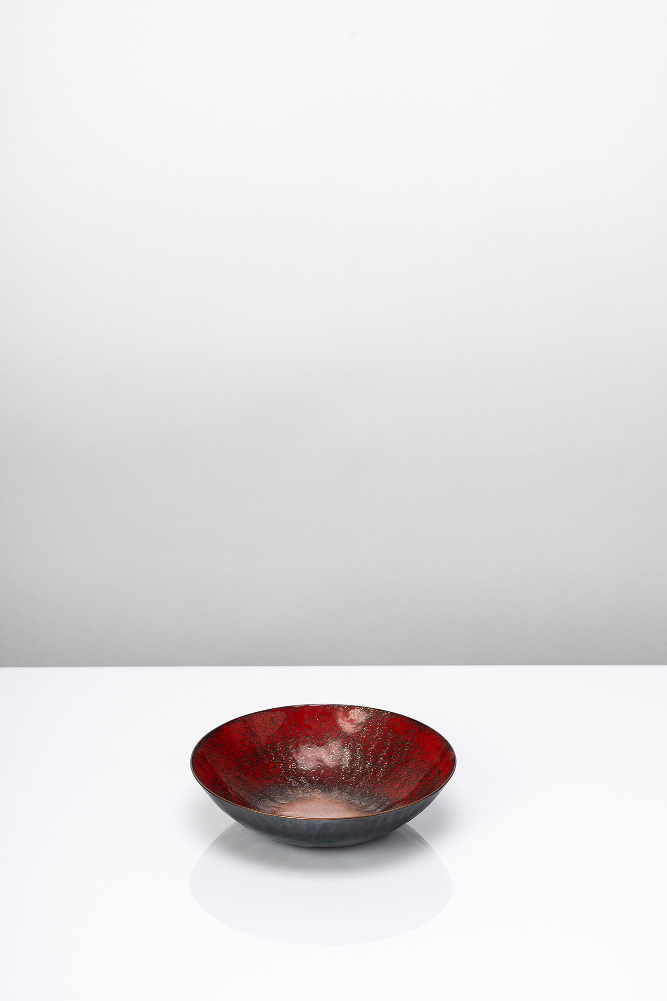 Coppa a smalti policromi su rame nei toni del rosso