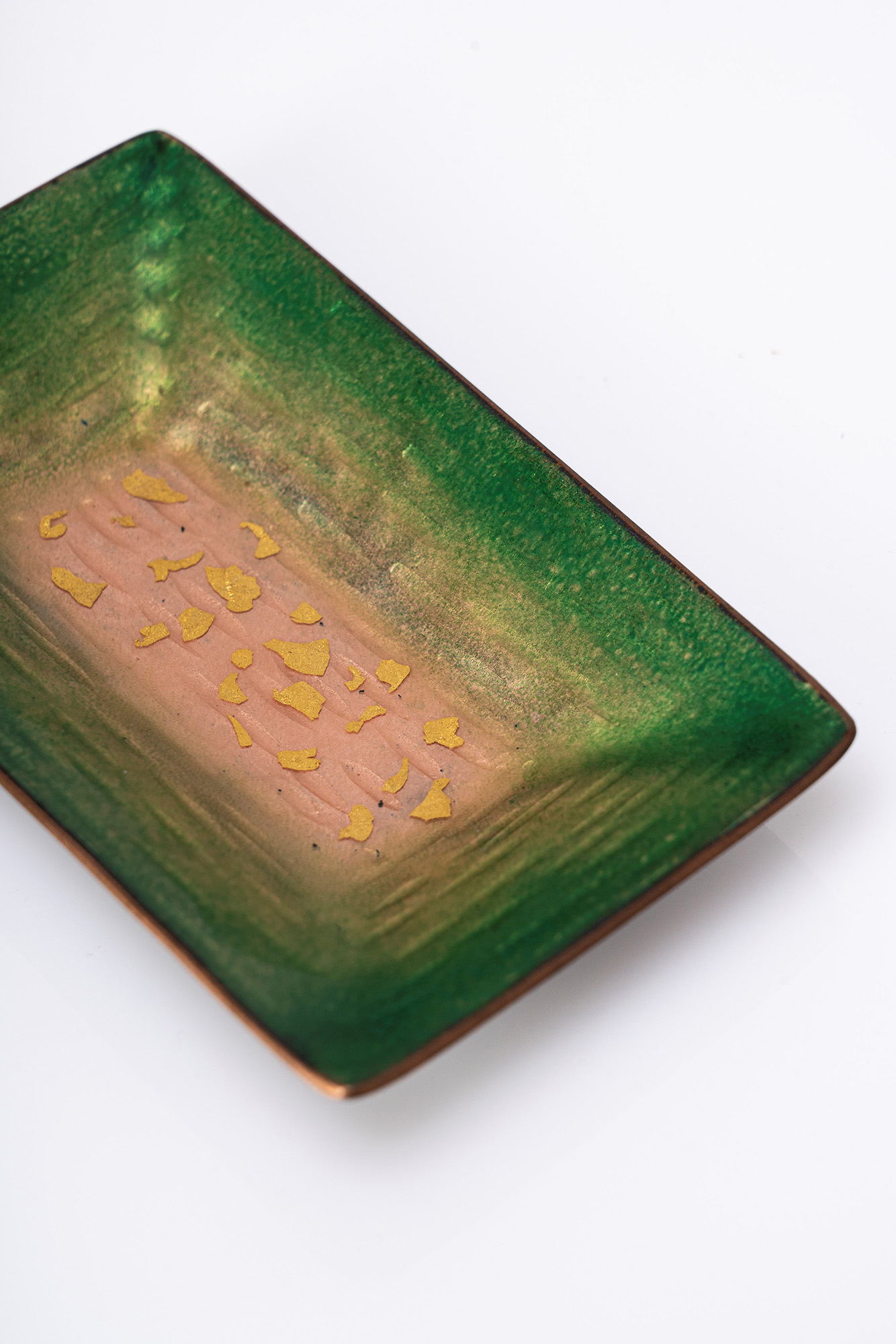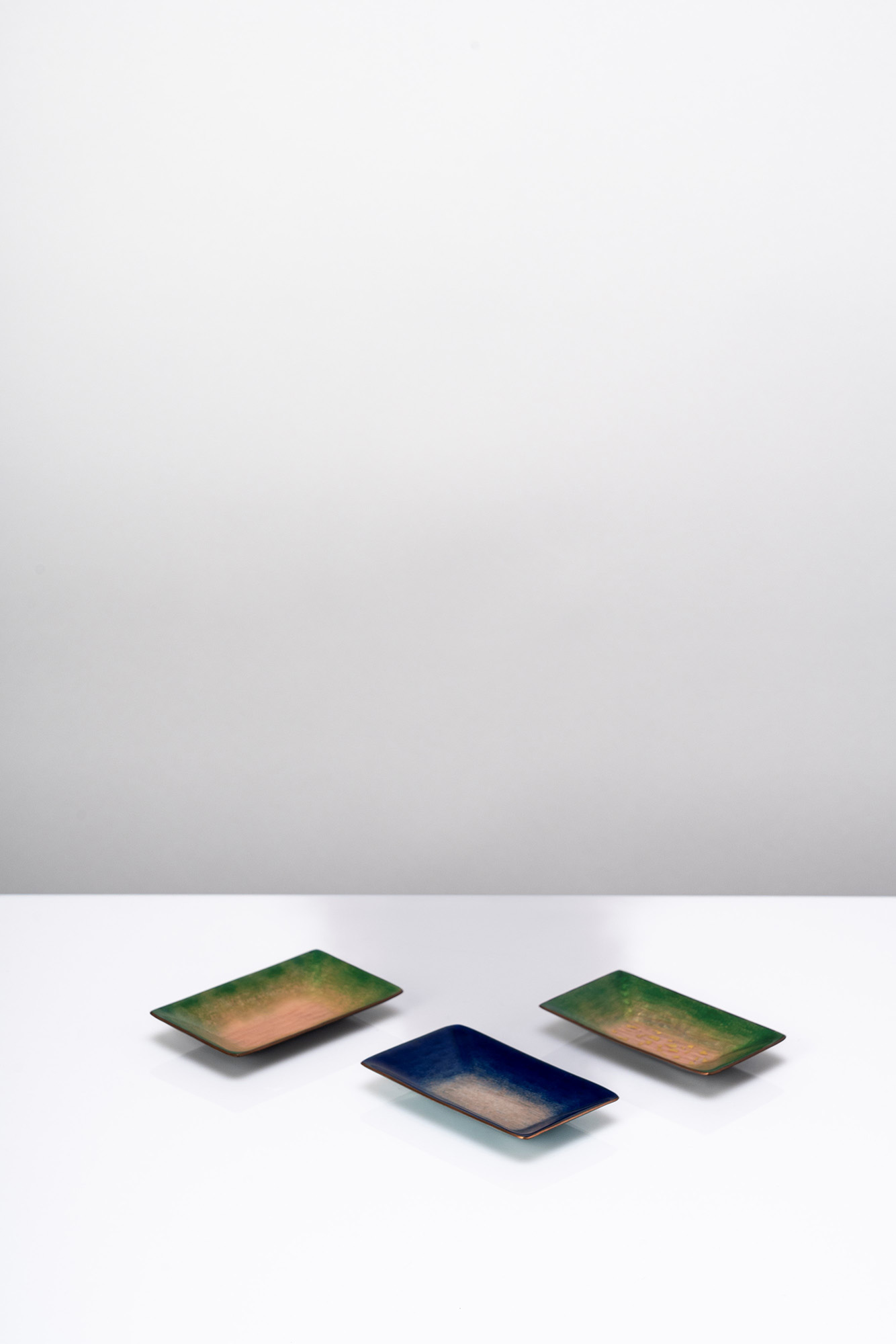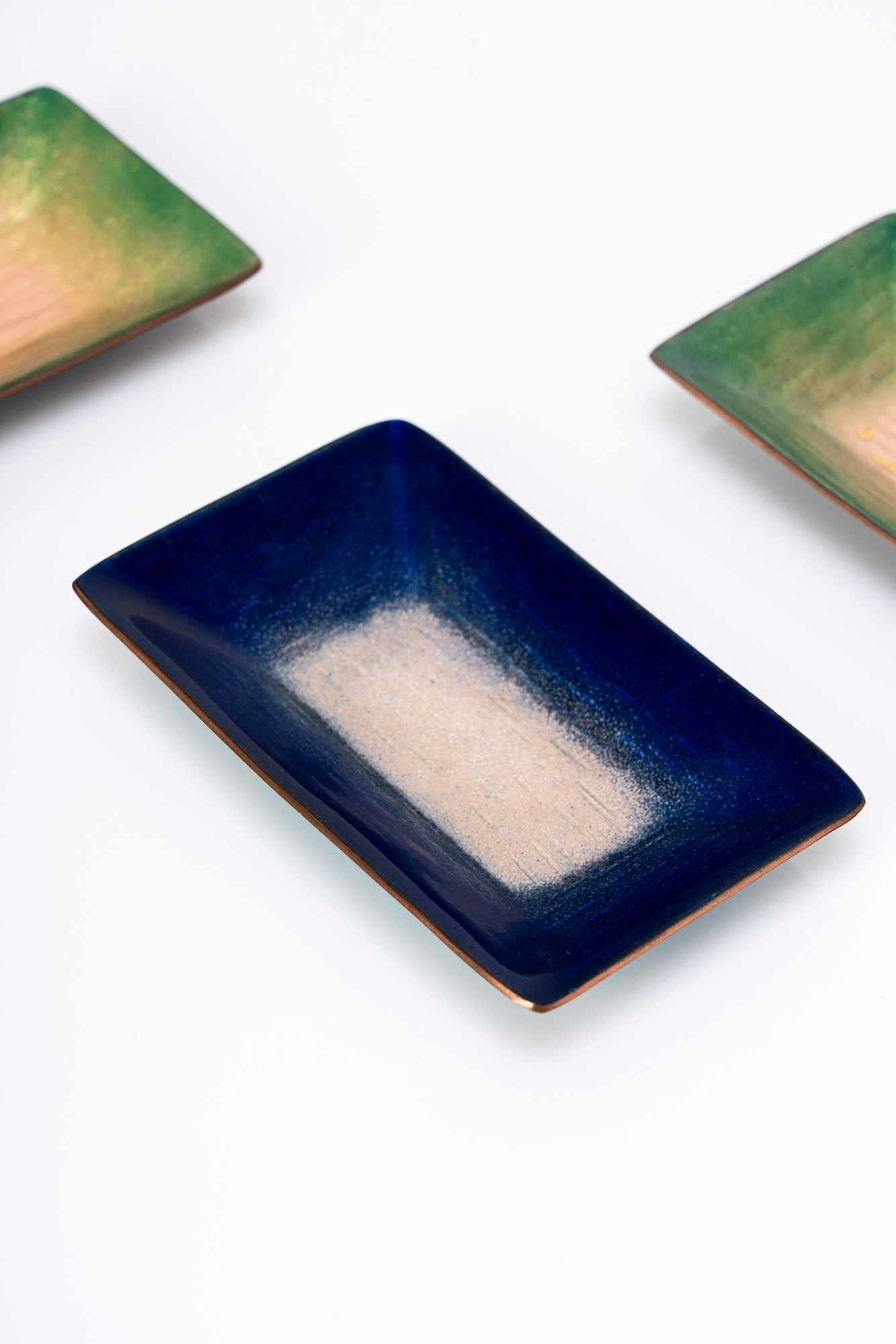 Set di tre svuotatasche a smalti policromi su rame nei toni del blu e verde