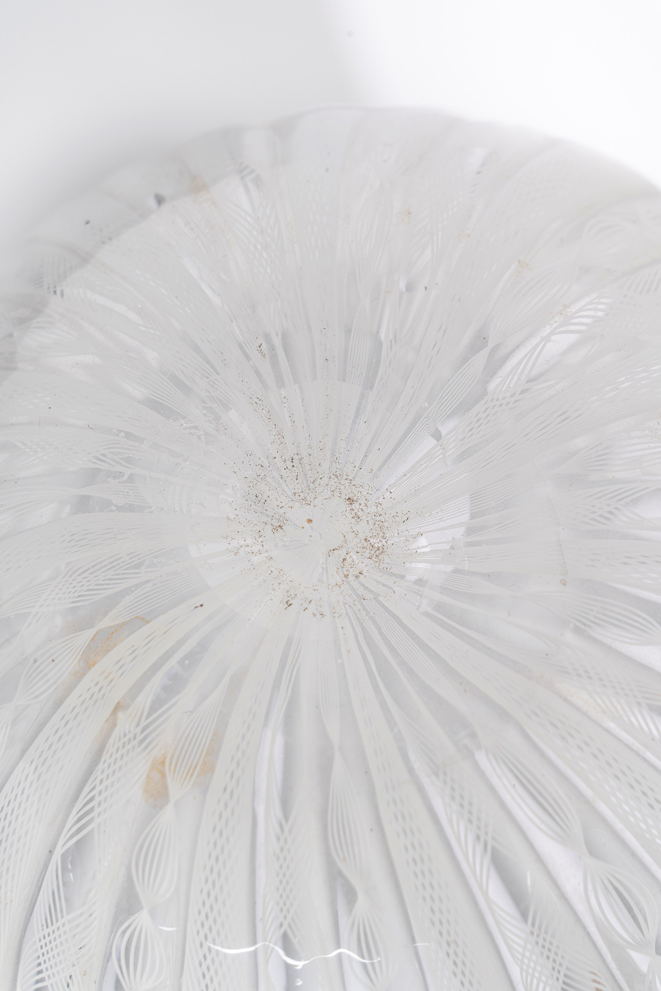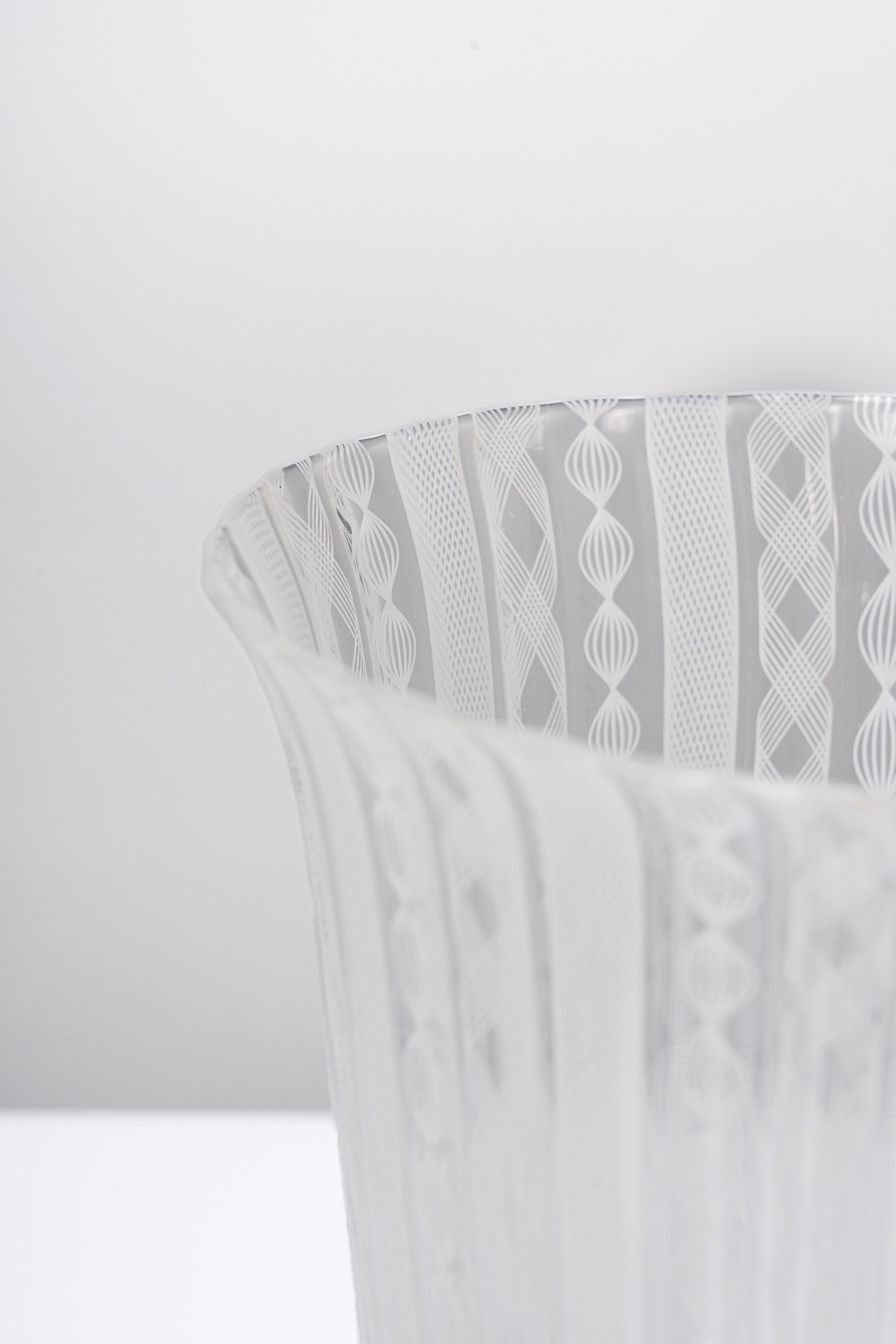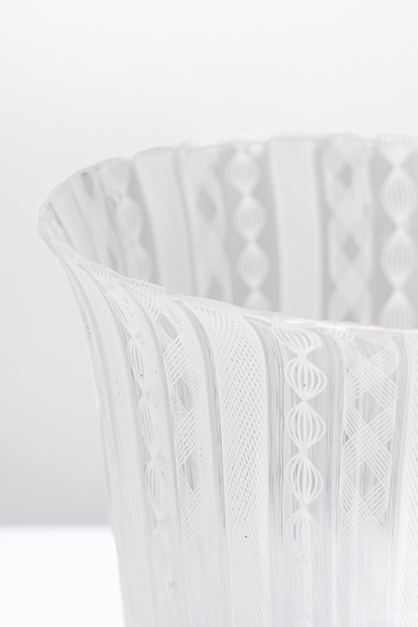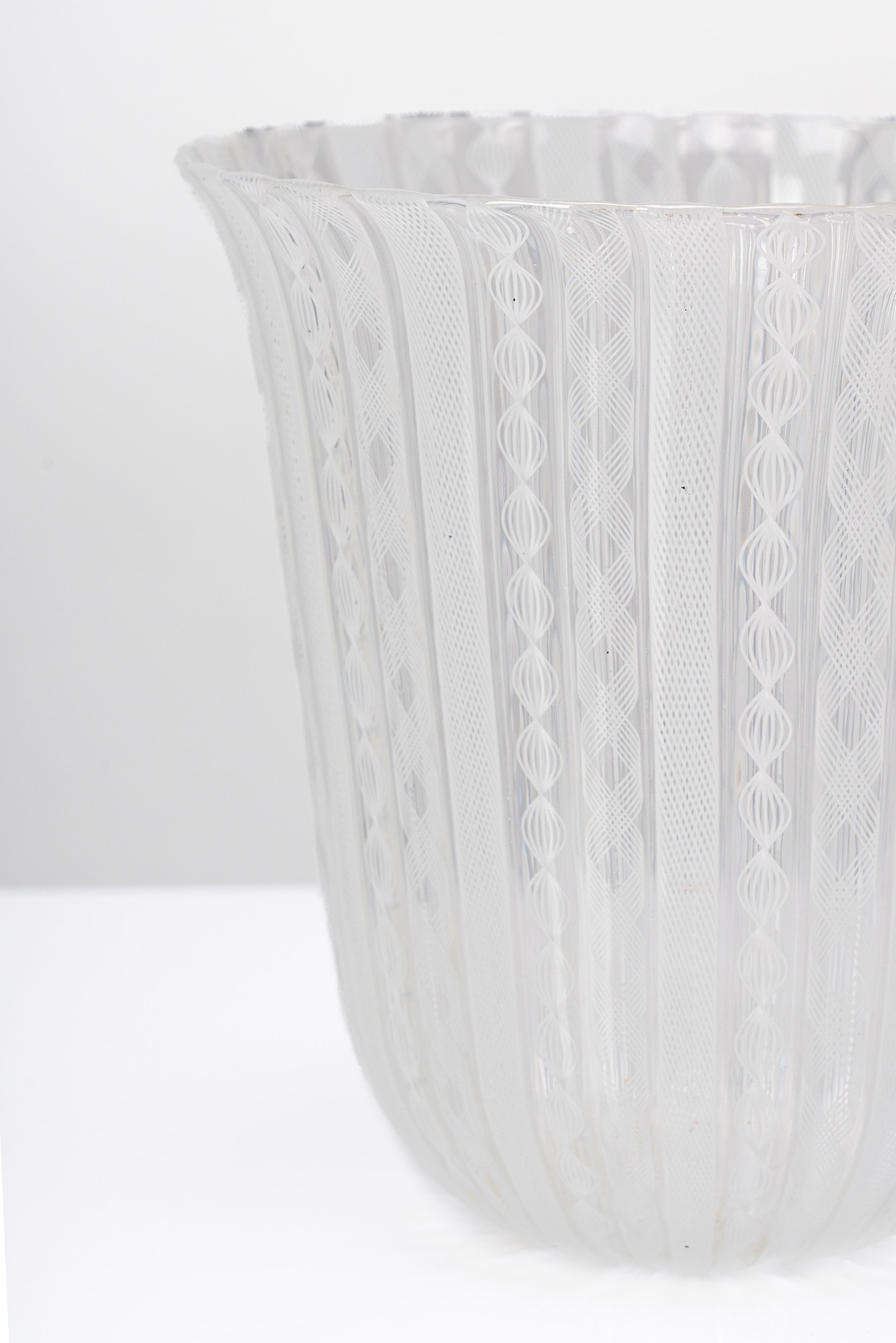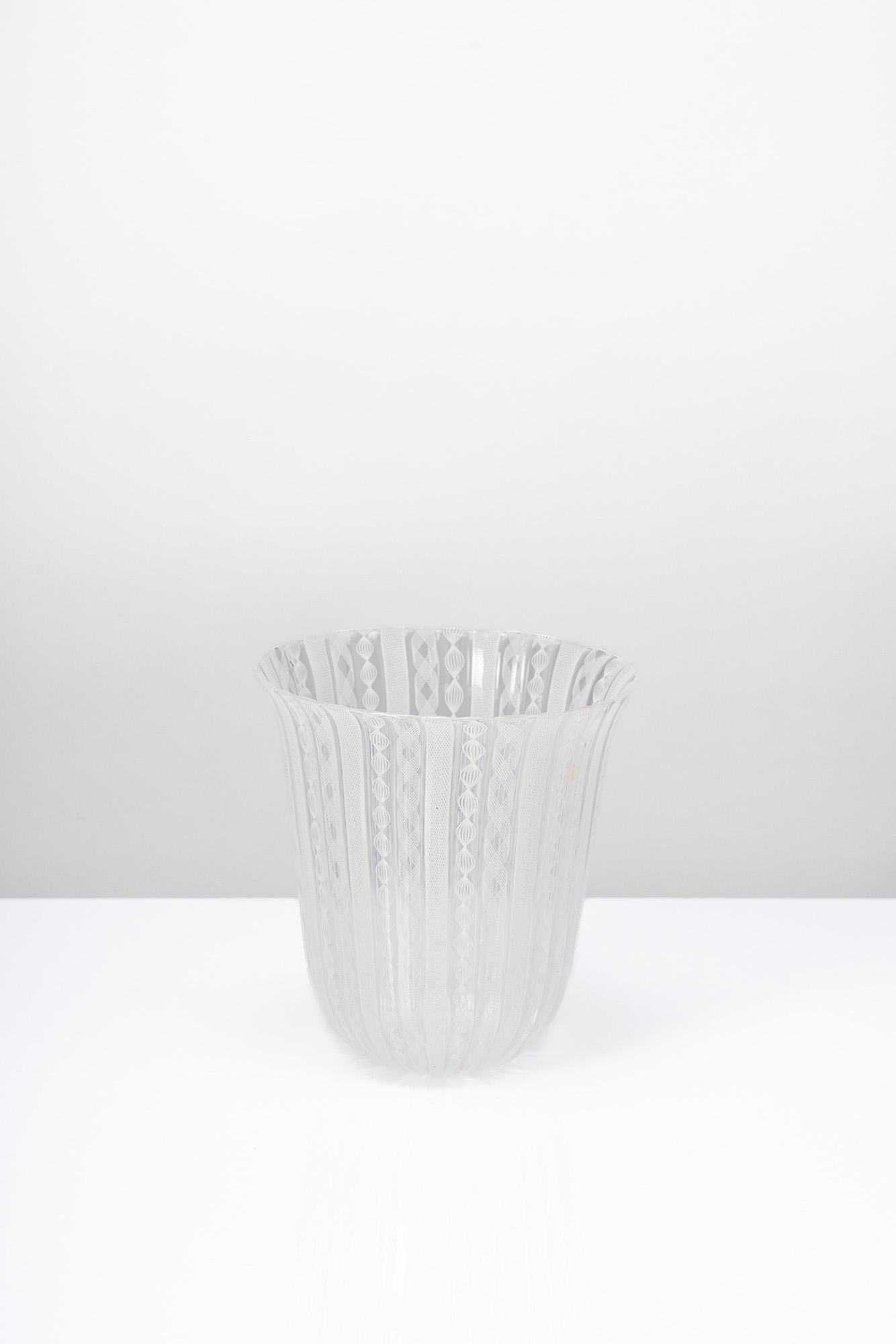 Vaso in vetro soffiato incolore a canne lattimo verticali zanfirico
